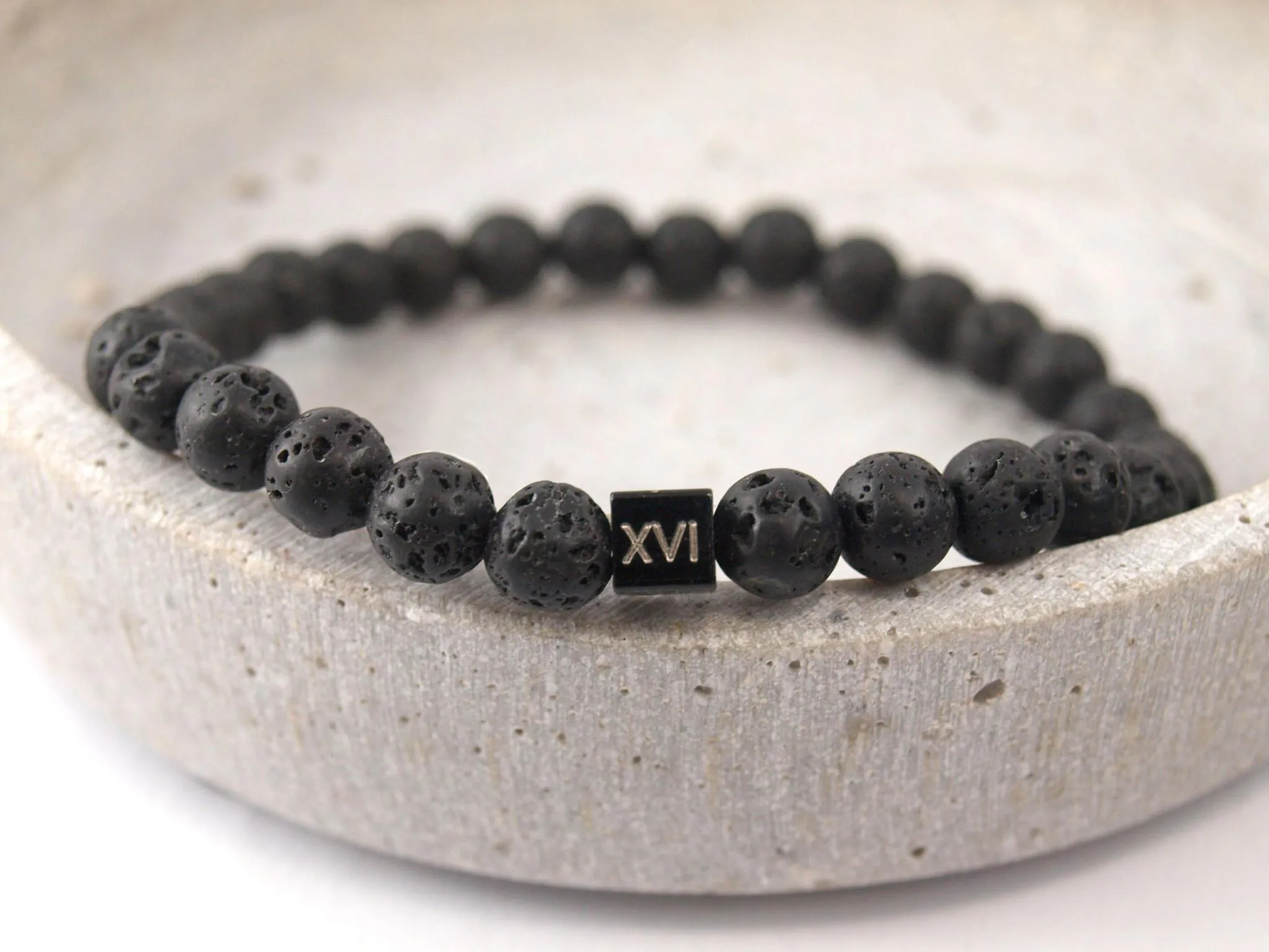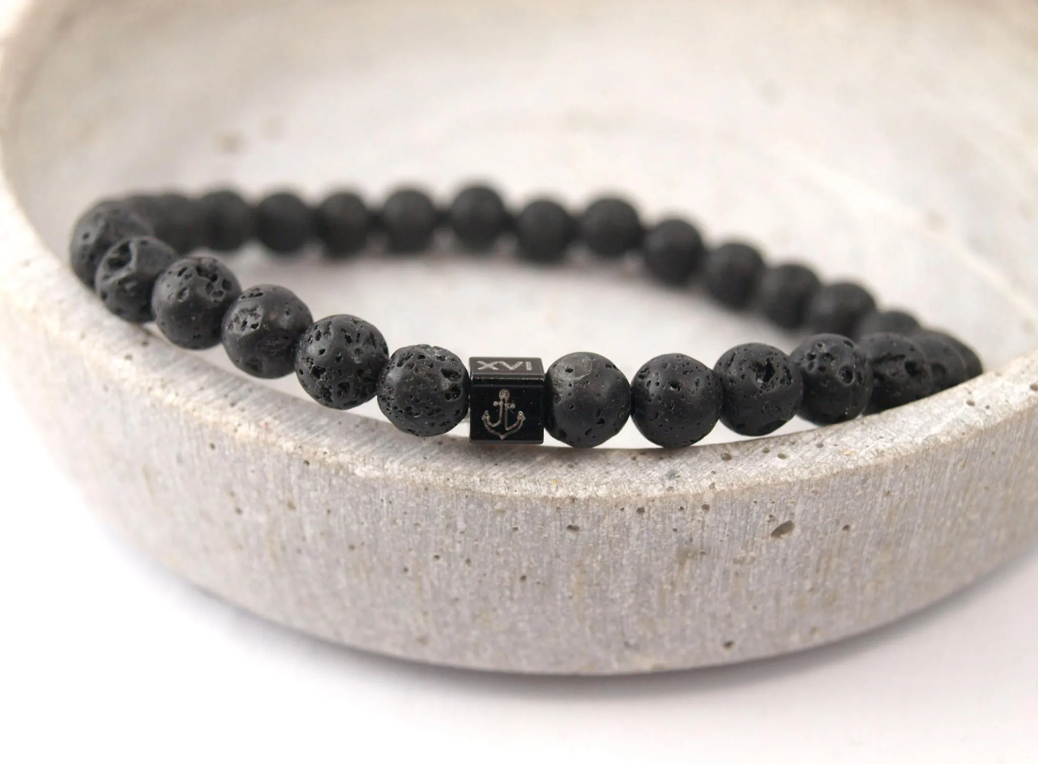 Armband aus schwarzen 6 mm Lavaperlen mit Gravur-Würfel, Farbe wählbar
