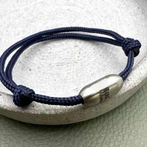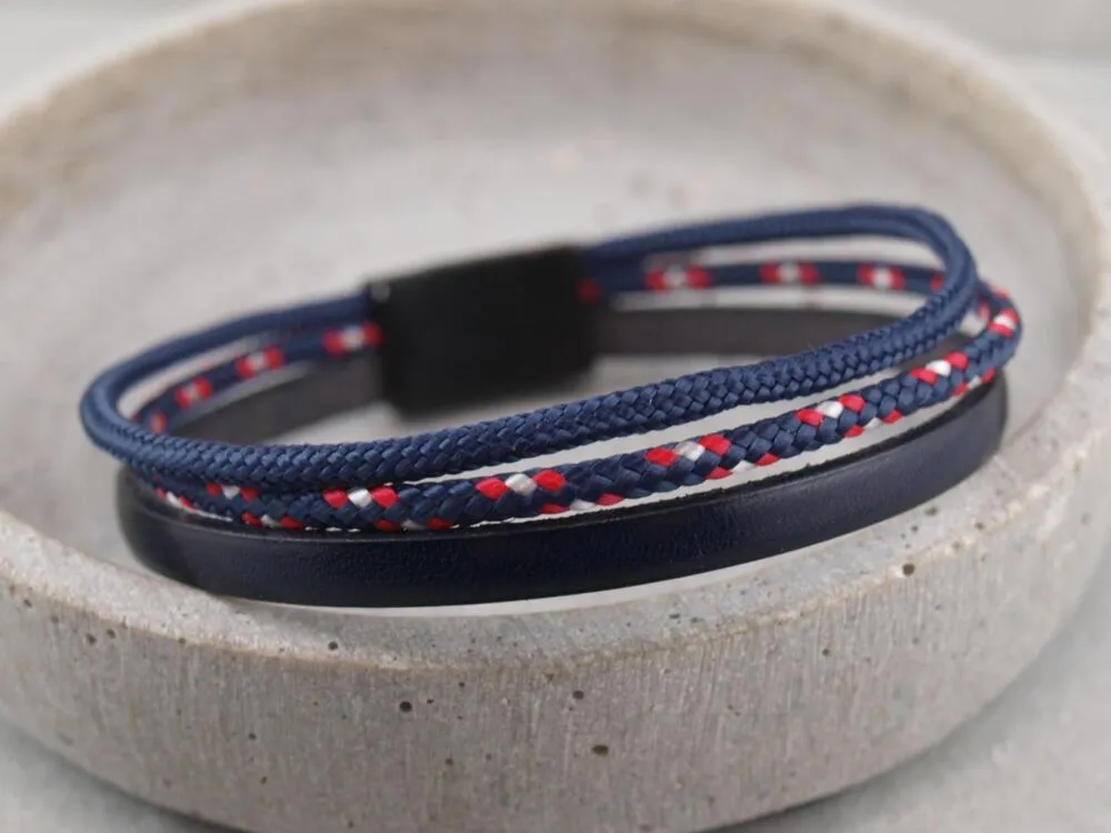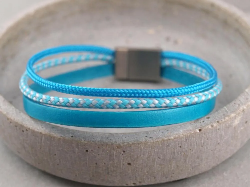 Dieses personalisierbare Armband kombiniert Leder und Segeltau. Es wird aus einem 5 mm breitem Riemen aus Rindsleder und zwei schmalen Bändern aus Segeltau in 2,5 mm Dicke gefertigt. Die gesamte Breite des Bandes beträgt ca. 1 cm. Verschlossen wird das Armband ganz bequem und sicher mit einem Magnetverschluss aus Chirurgenstahl. Dieser lässt sich mit einer individuellen Gravur versehen.