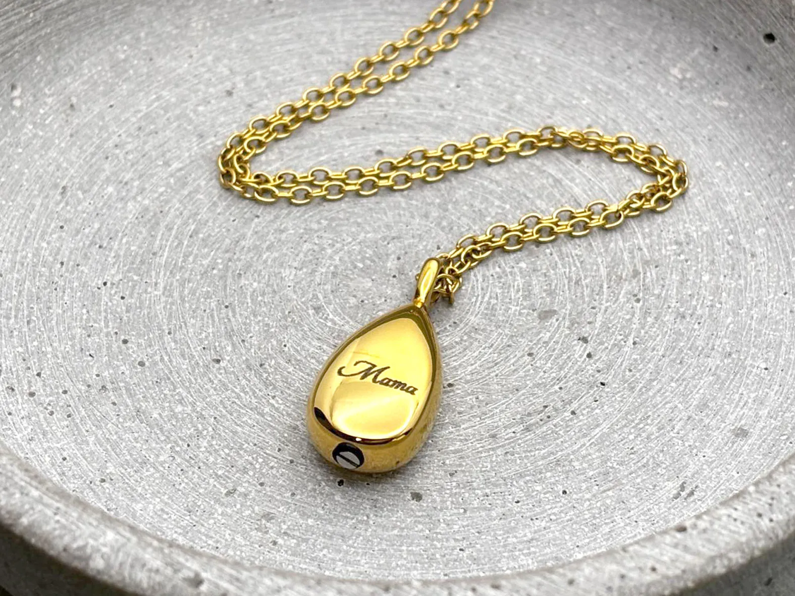 Erinnerungsschmuck Tränen Tropfen Gold mit Gravur, Kapsel zur Aufbewahrung von Asche, Sand, Fell etc.