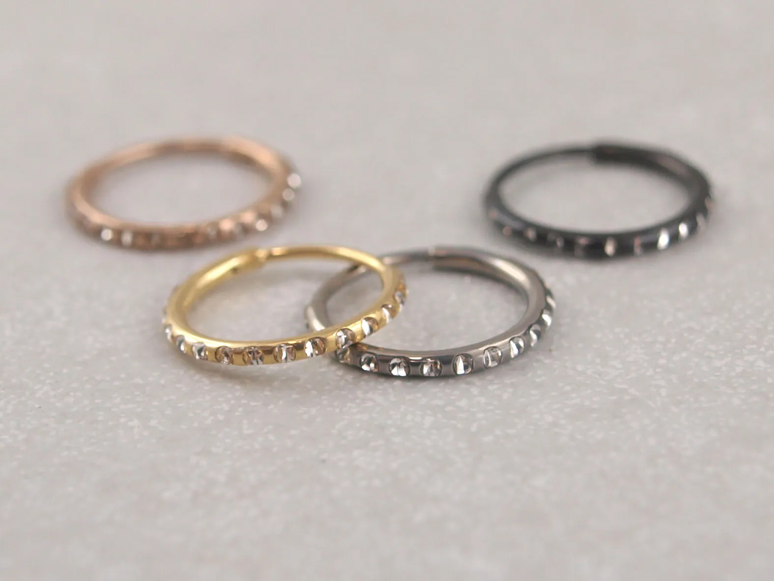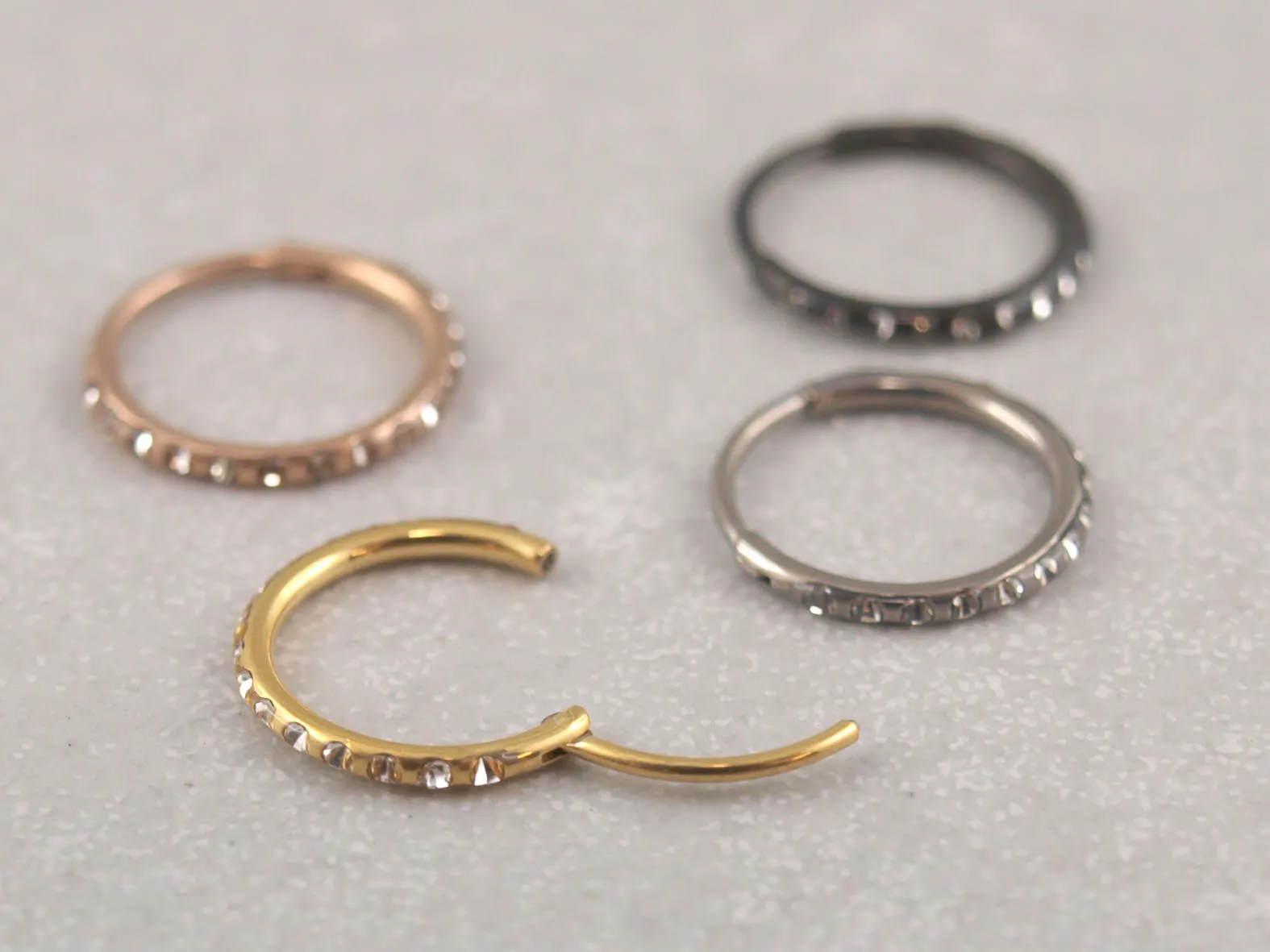 Diese schmale Creolen mit Glitzer Kristallen aus Titan sind sehr gut verträglich und sehen dabei noch wunderschön aus. Dieses Piercing kann vielseitig verwendet werden, ob als Ohr Piercing (Lope Piercing oder Upper Lope Piercing), ebenso als Nasenpiercing oder Helix Piercing.