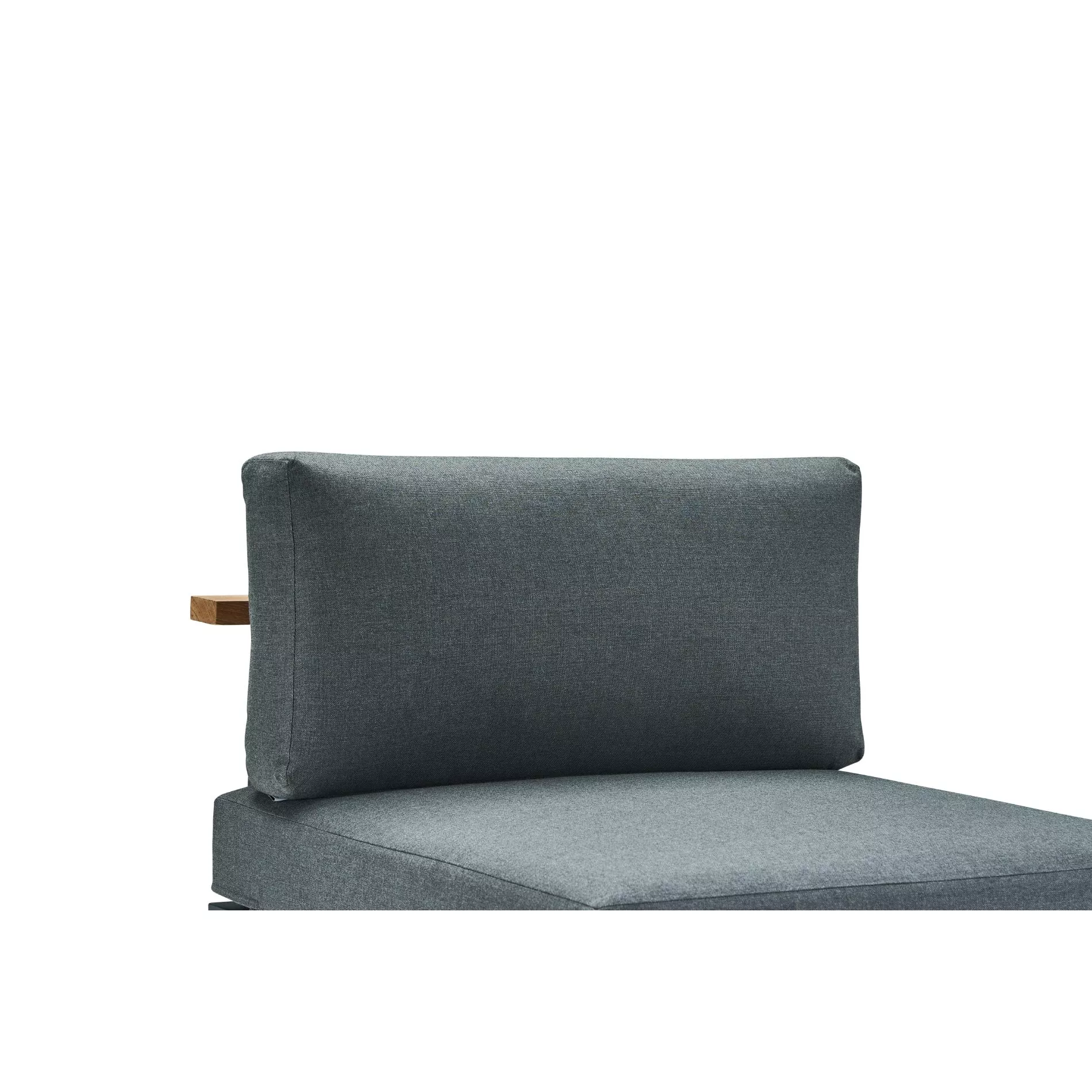 Die Teakholzleiste an der Rückenlehne bildet einen warmen Kontrast zum Aluminiumrahmen. Das zertifizierte Teak ist ideal für draußen, da es durch seinen hohen Ölgehalt auch auf lange Sicht seine Qualität bewahrt. Die typische, silbergraue Patina, die mit der Zeit entsteht, lässt sich durch ein Teakpflegemittel vermeiden.