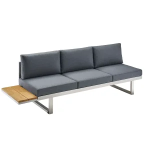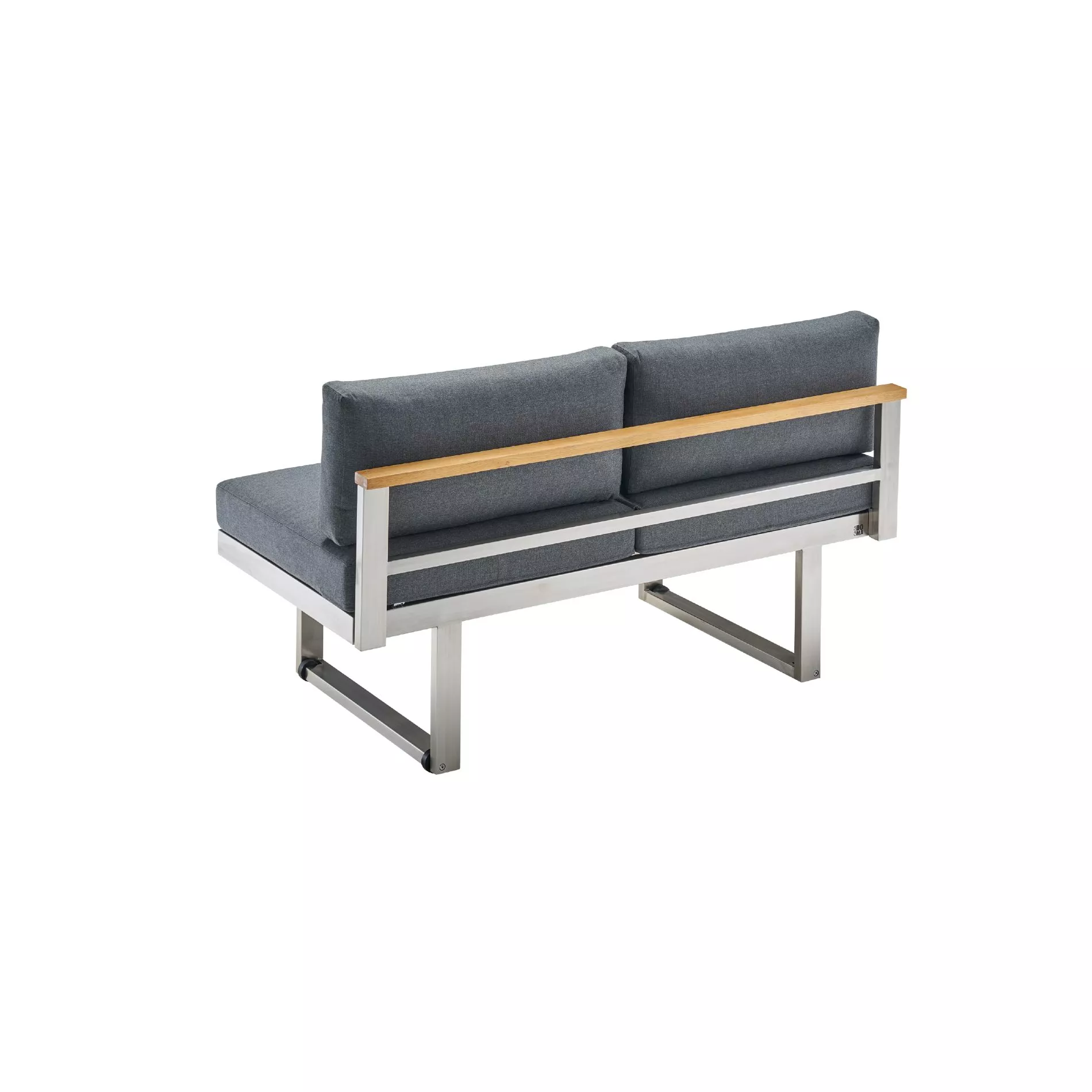 kombiniert geschickt ein 2-Sitzer-Modul mit einer zusätzlichen Rückenlehne. Beide Komponenten sind mit einem stabilen Gestell aus Edelstahl 304 versehen, das nicht nur extrem robust und korrosionsbeständig ist, sondern auch über eine außergewöhnliche Langlebigkeit verfügt. Die Oberfläche des Edelstahls ist leicht gebürstet, was nicht nur für eine ästhetisch ansprechende Optik und Haptik sorgt. Die Teakholzleiste an der Rückenlehne schafft einen reizvollen Kontrast zum Edelstahl-Gestell.