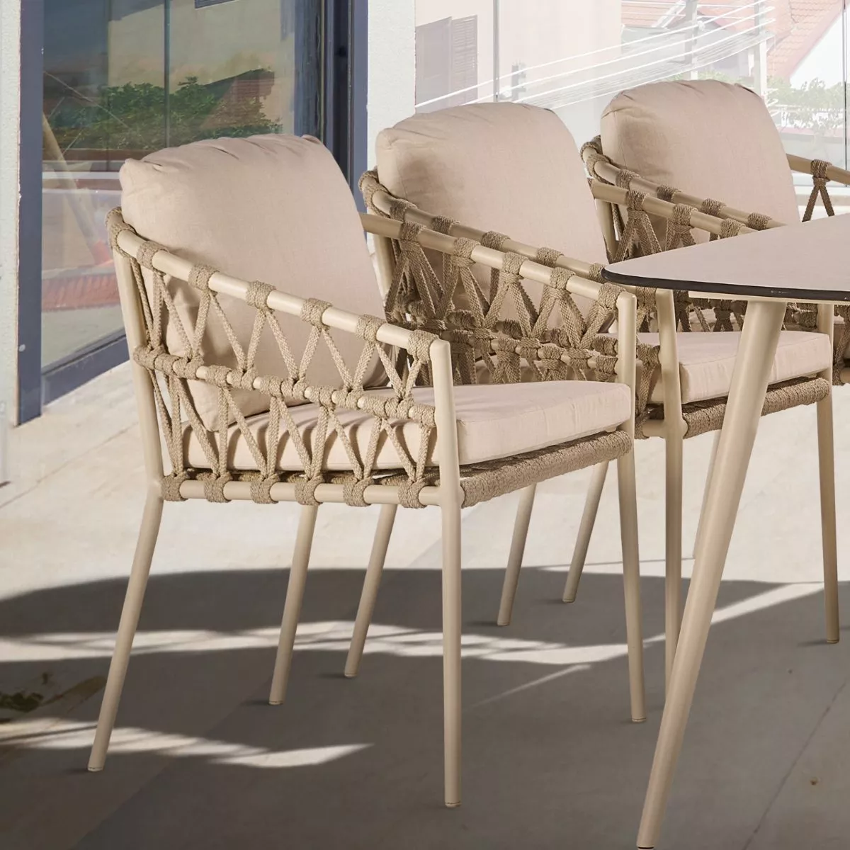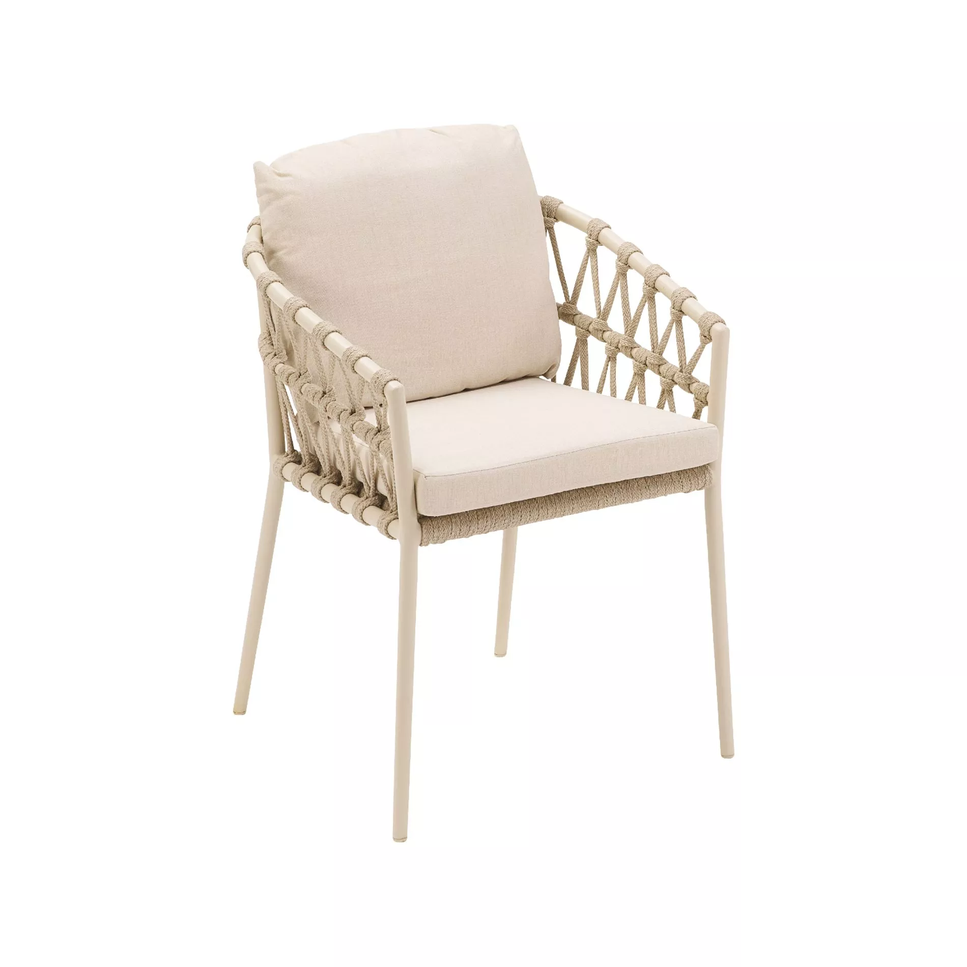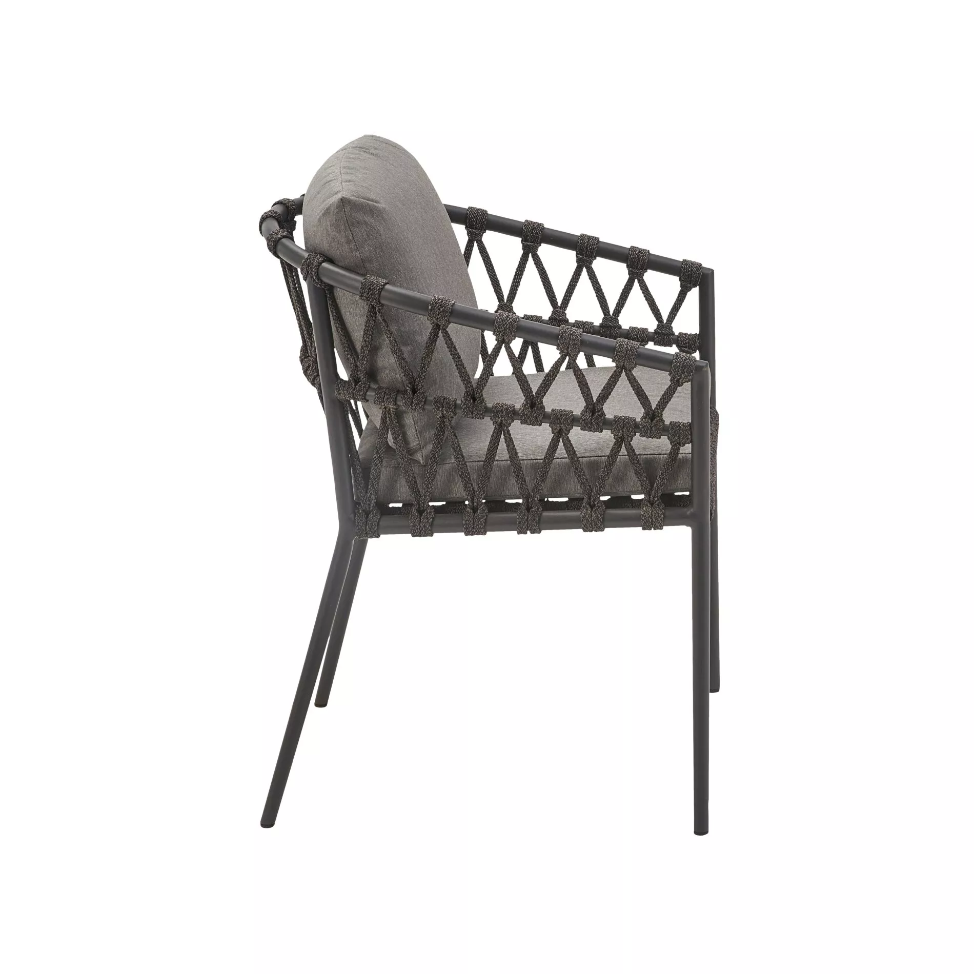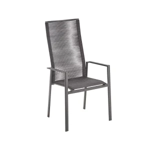 Der Gartenstuhl “Messina” vereint modernes Design mit hohem Komfort. Das pulverbeschichtete Aluminium-Gestell mit konisch zulaufenden Rundrohr-Beinen bietet Stabilität und eine elegante Optik. Die Rope-Bespannung in V-Flechtung ist pflegeleicht und sorgt für ein angenehmes Sitzgefühl. Ideal für draußen: Dank des wetterfesten Materialmixes eignet sich “Messina” perfekt für Ihre Terrasse oder den Garten.