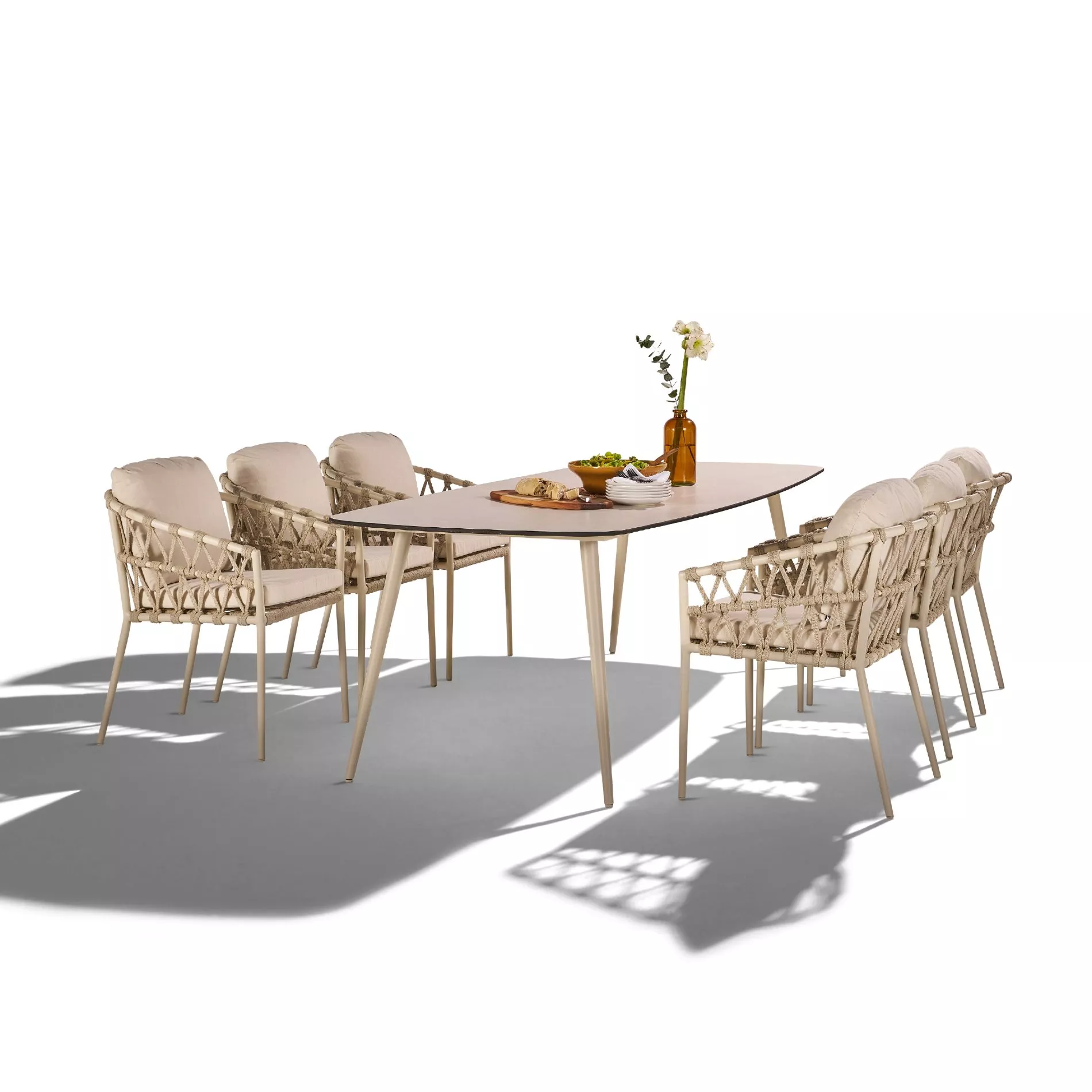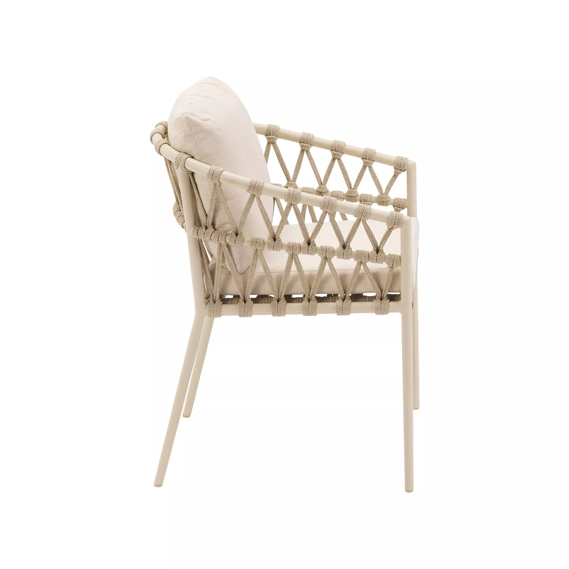 Die Sitzschale in Rundform besteht aus einem wetterfesten Aluminiumrahmen und ist mit robustem Rope in V-Flechtung bespannt. Die 16 mm breiten Bänder sind durchgefärbt und bieten dadurch eine hohe UV-Beständigkeit. Das Rope-Material, gefertigt aus strapazierfähigem Polypropylen, ist besonders pflegeleicht, langlebig und wasserabweisend. Der Sessel ist in zwei stilvollen Farbvarianten erhältlich: Die Version in Aluminium Cream ist mit Rope in der Farbe Fossil bespannt, während das Modell in Aluminium Anthrazit mit Rope in Anthrazit überzeugt. Beide Varianten kombinieren Funktionalität mit zeitloser Eleganz und eignen sich perfekt für den Outdoor-Einsatz.
