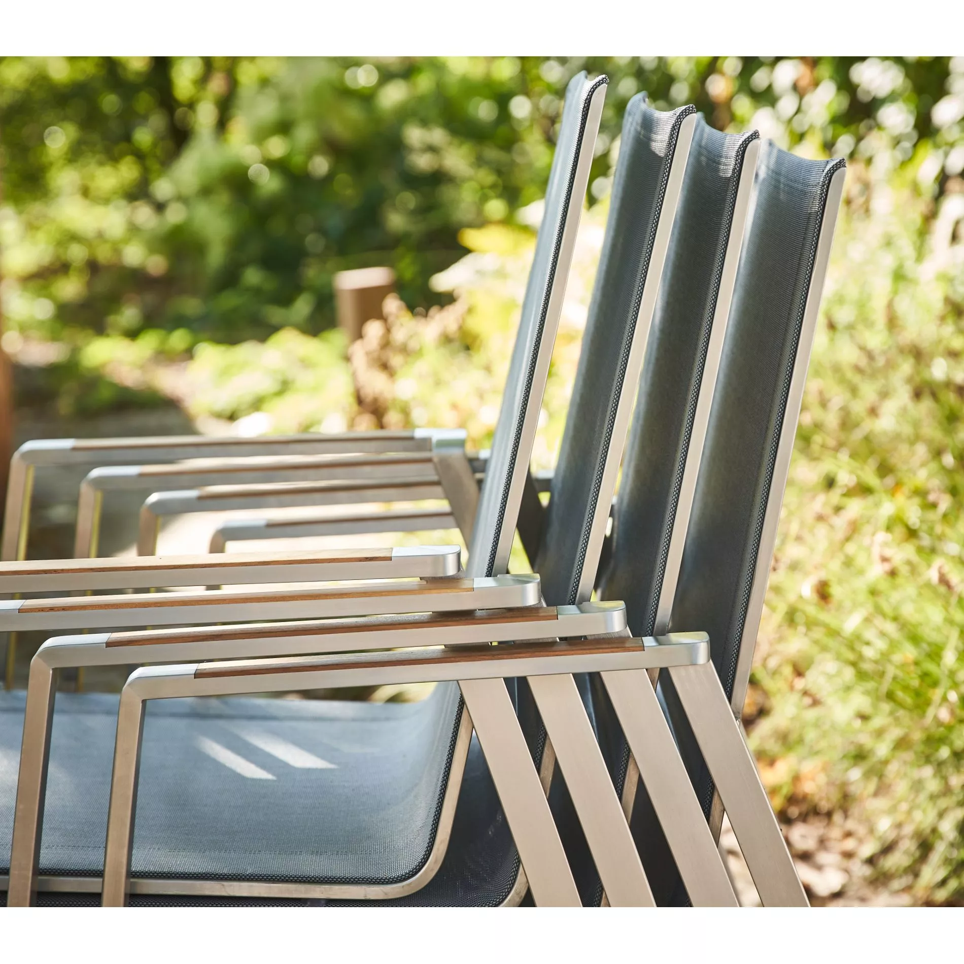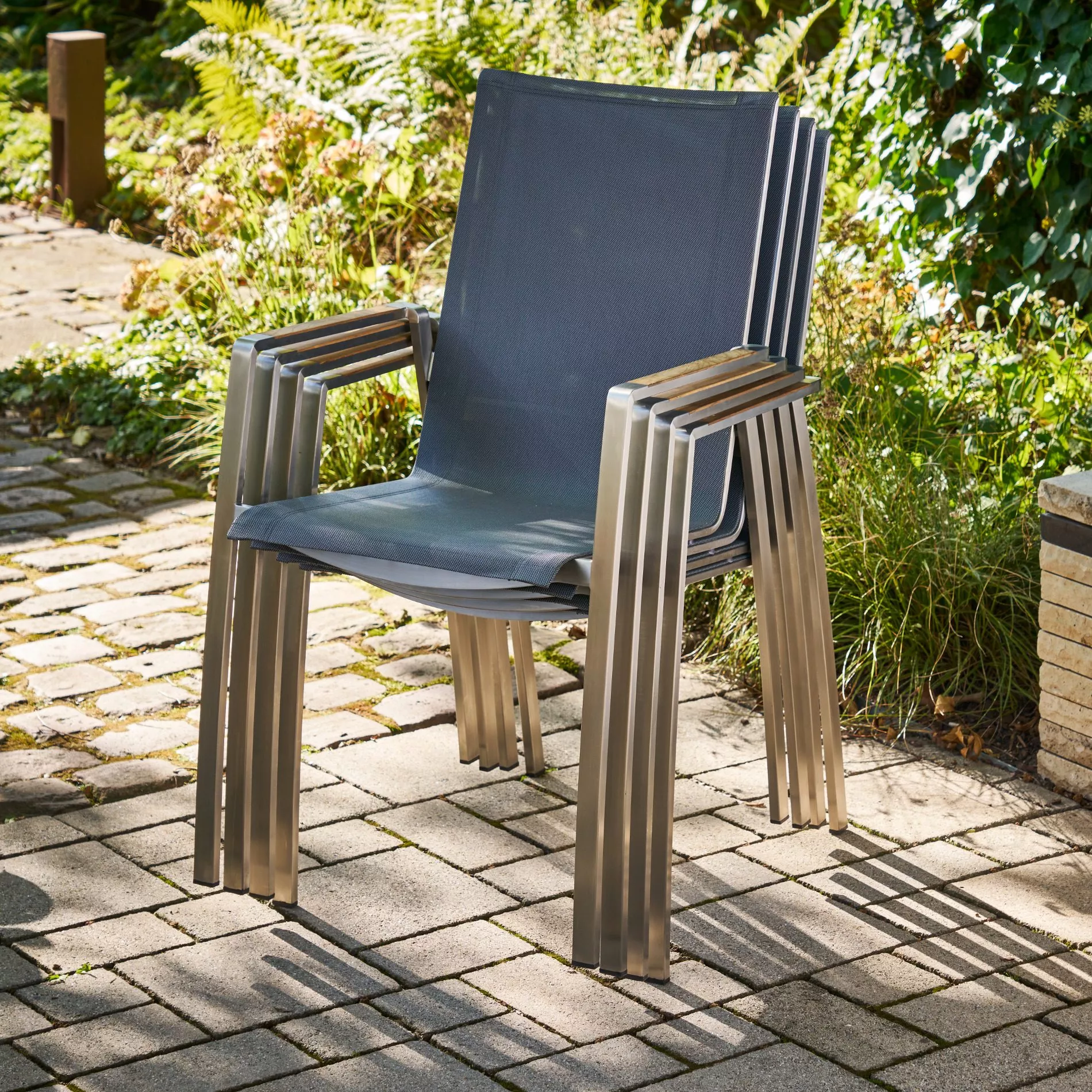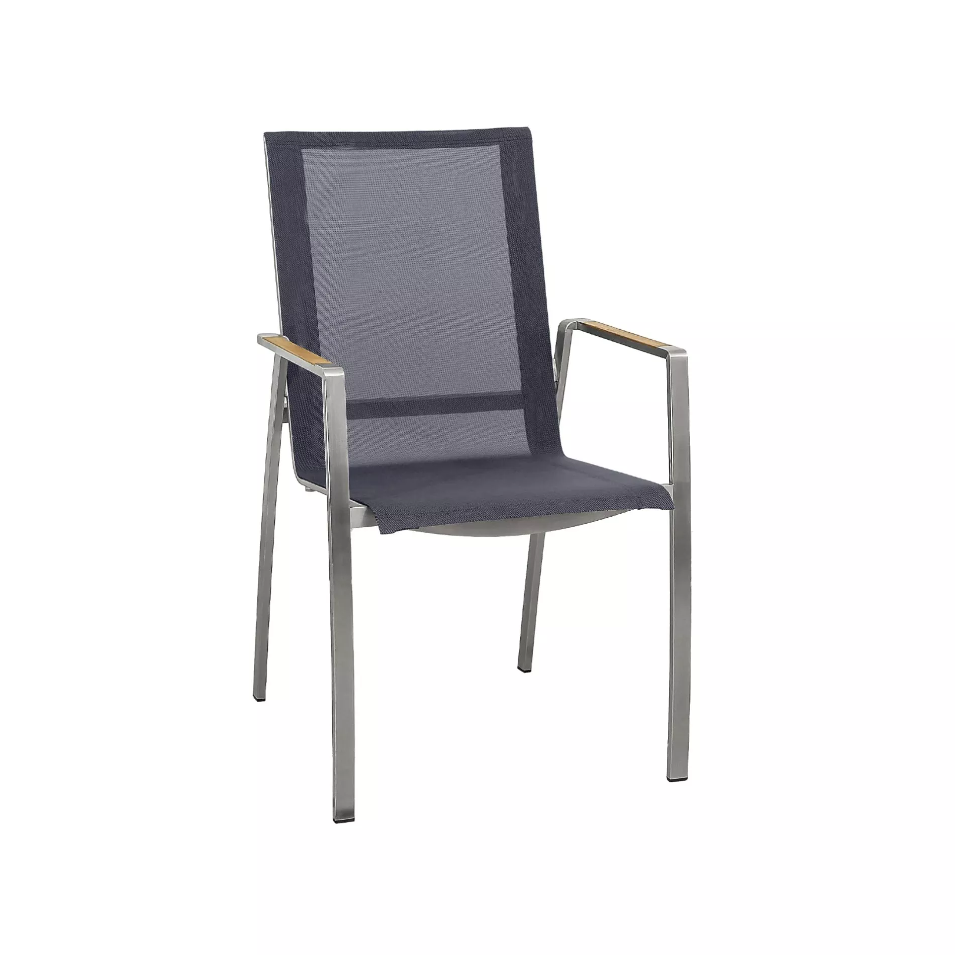 Stil trifft Komfort. Der Stapelstuhl “Mineo” der Marke CASA DOMA ist ein schönes Beispiel für zeitgemäßes, durchdachtes Gartenmöbel-Design. Der Edelstahl-Gartenstuhl mit Sunproof® Sling Sitzfläche punktet mit seiner exklusiven Materialwahl, die Sonne und Regen trotzt. Gleichzeitig verspricht er wunderbaren Sitzkomfort: Die Rückenlehne ist etwas höher designt und die gemütlichen Armlehnen mit Teakholz-Einlage laden dazu ein, Platz zu nehmen.