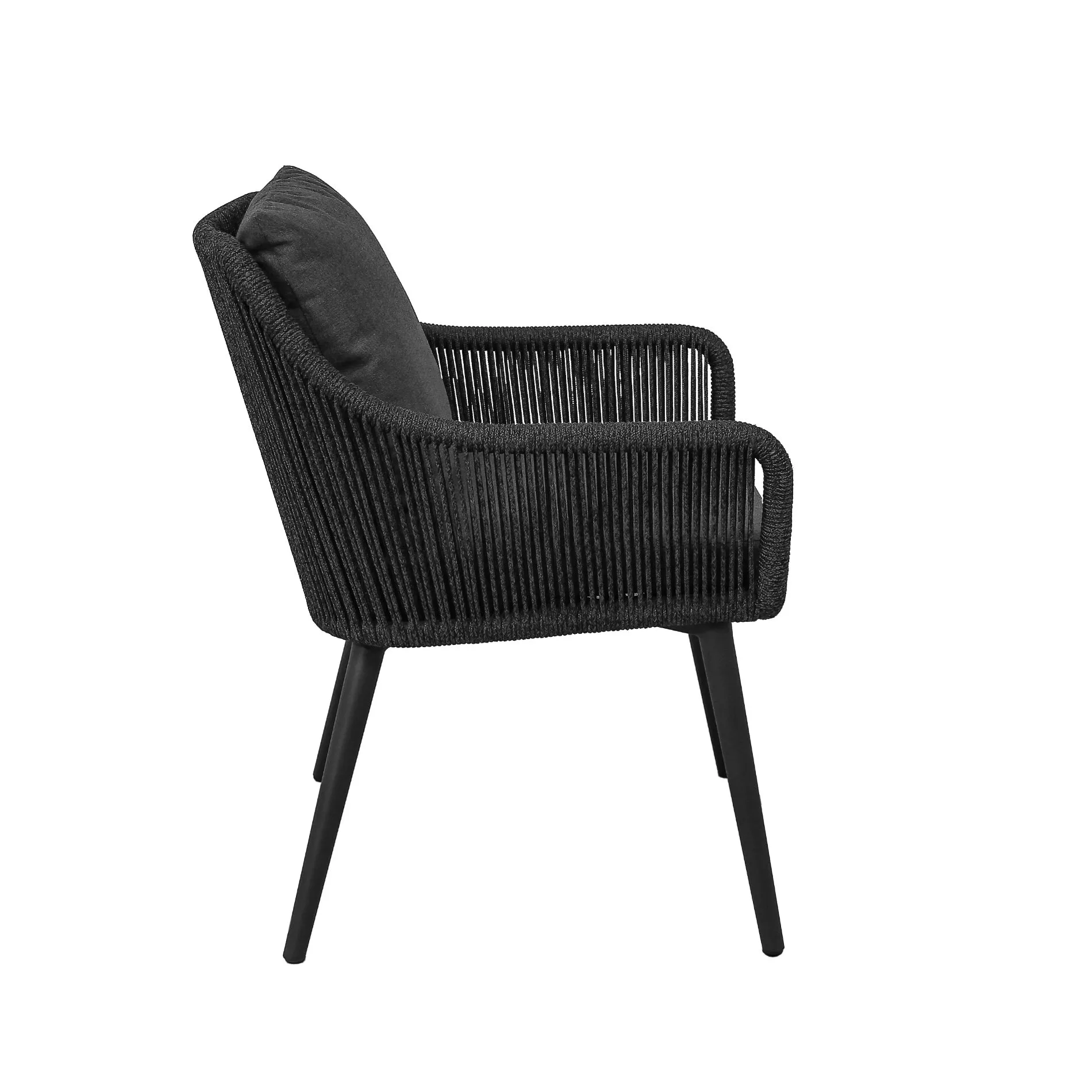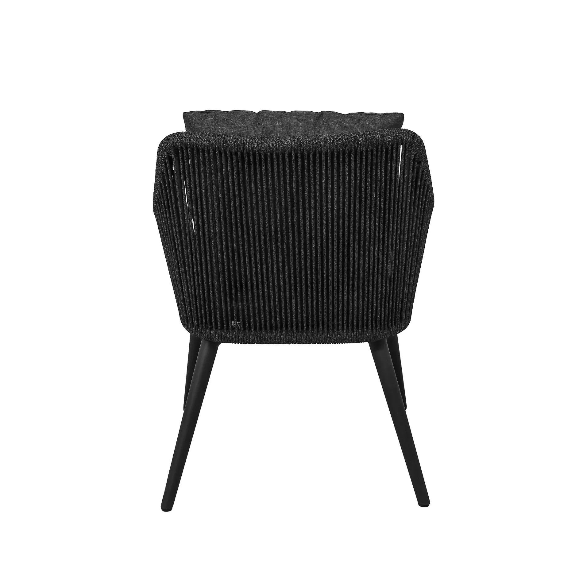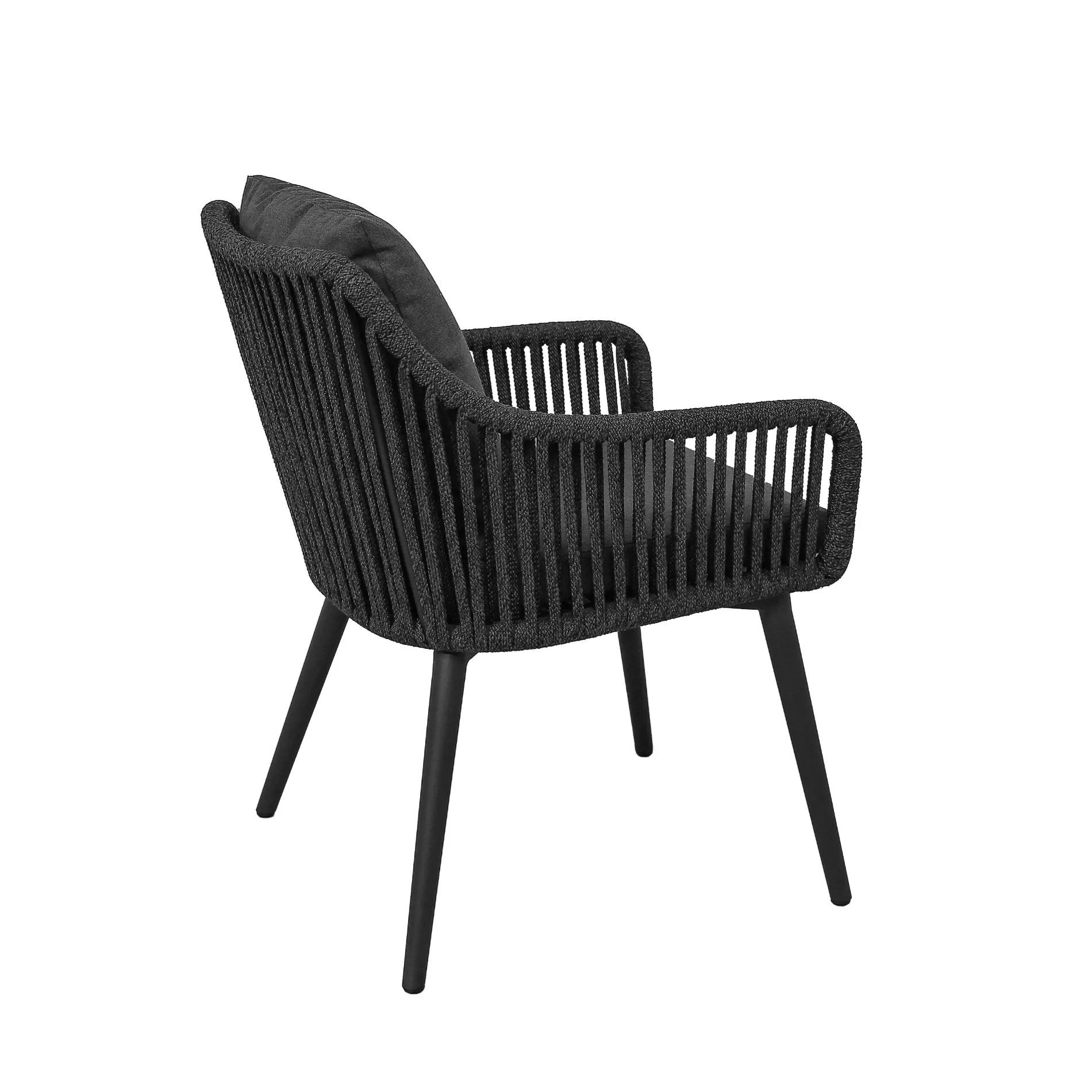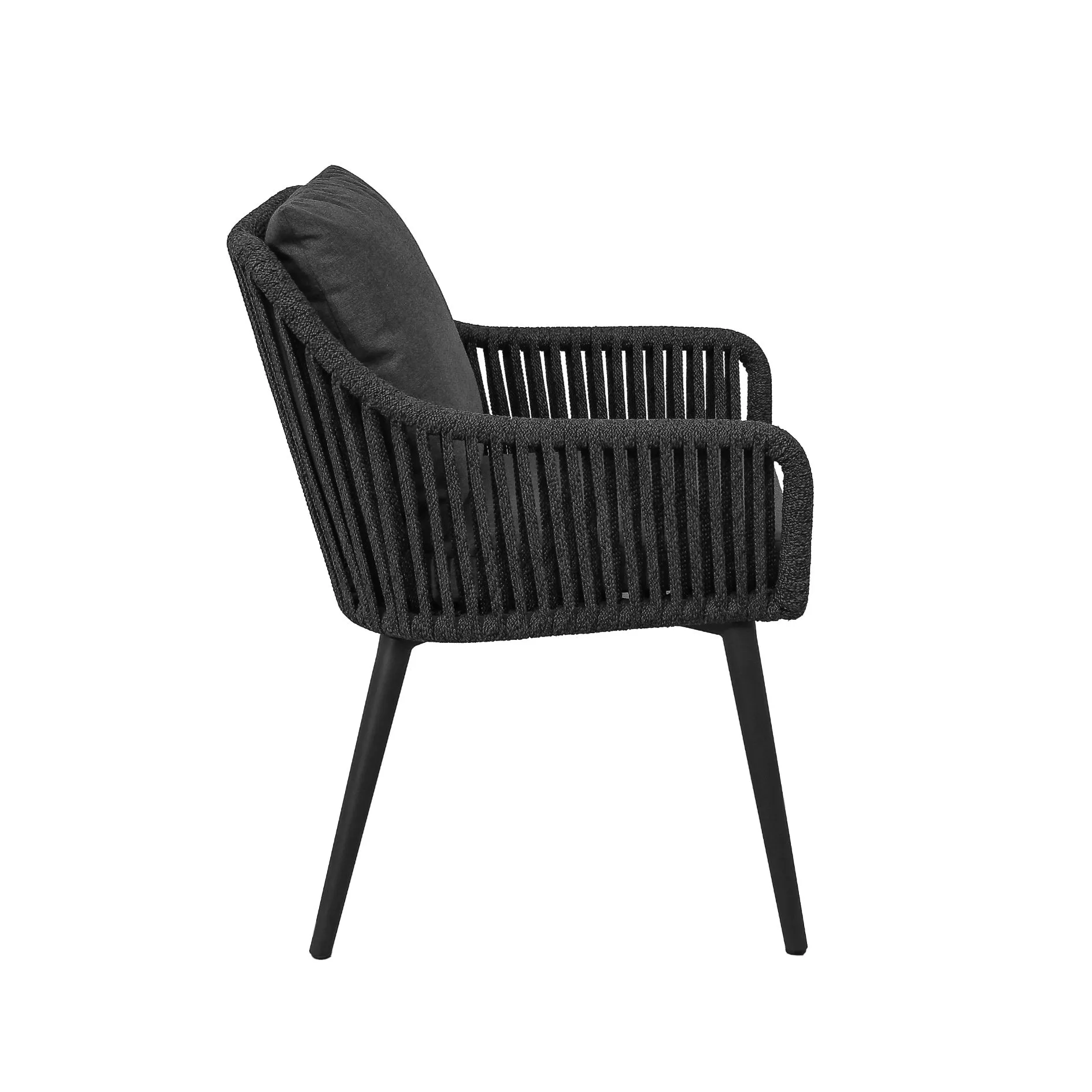 Die Rope-Bespannung prägt den Look des Diningsessels und steht in vier Ausführungen zur Wahl: vertikale Bespannung mit breitem Band 16 mm, vertikale Bespannung mit Kordel Ø 6 mm, Rautenmuster mit breitem Band 16 mm, Knotenmuster mit Kordel Ø 6 mm. Jedes Muster ein Blickfang auf Ihrer Terrasse!
