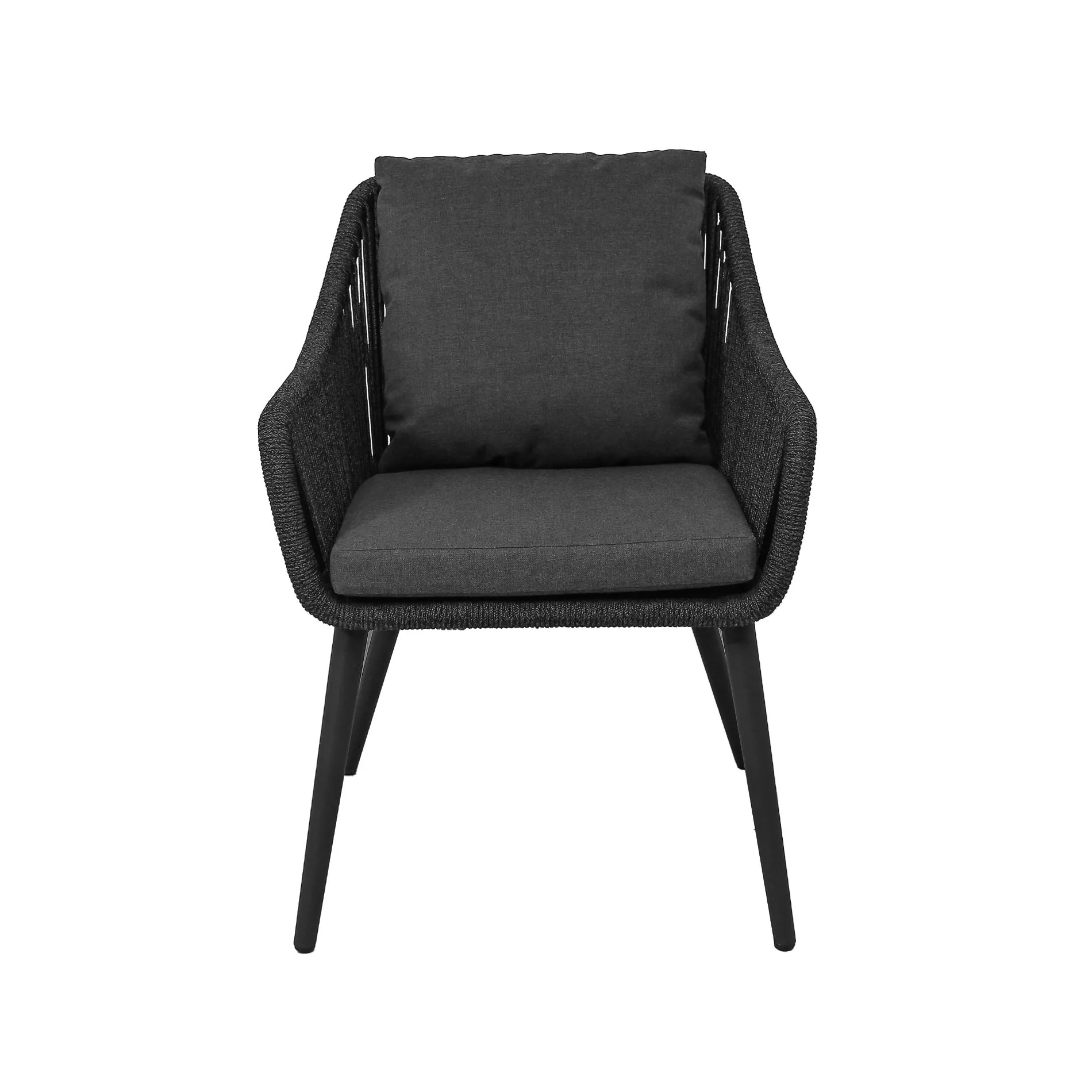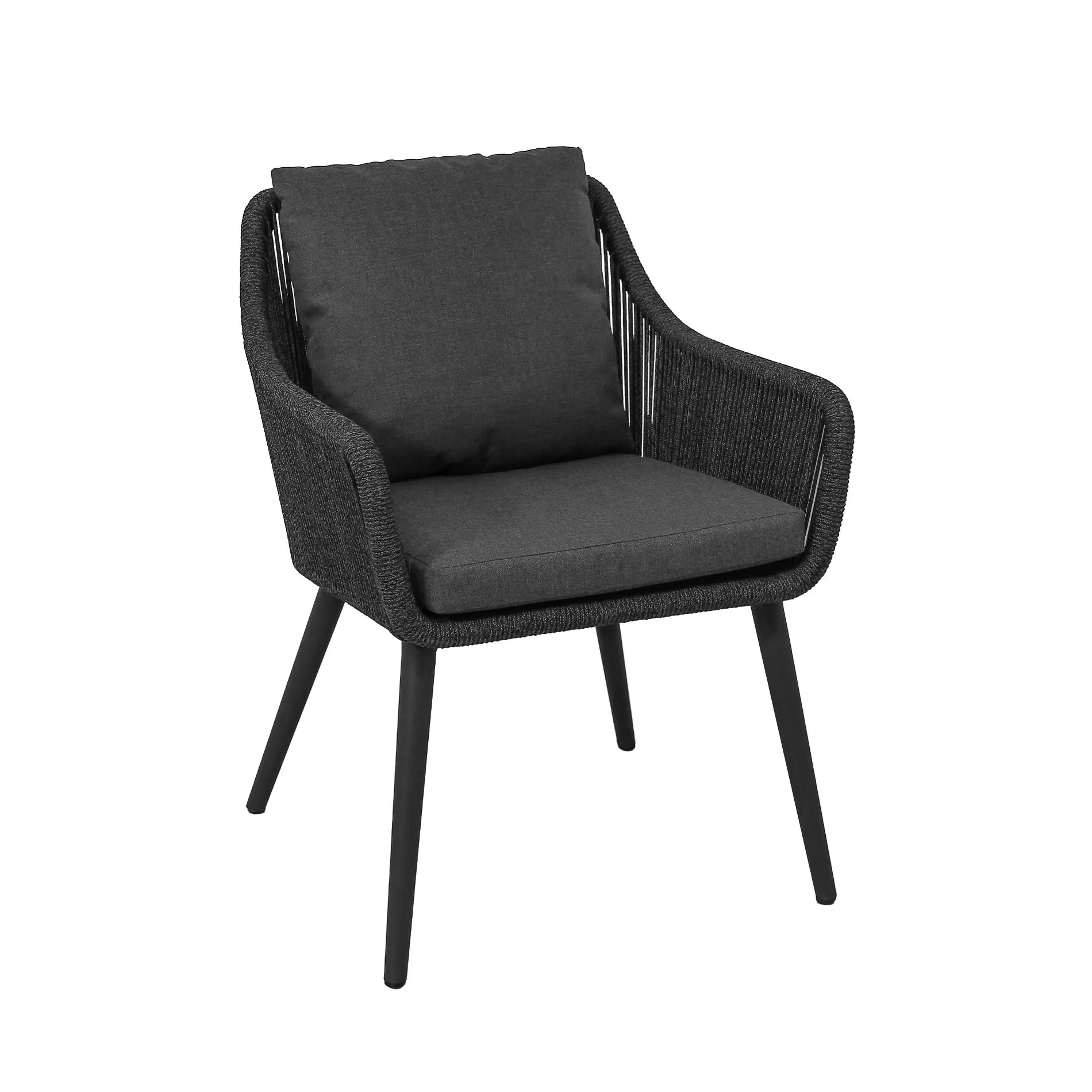 Ein Gestell aus korrosionsbeständigem Aluminium schenkt der L-förmigen Sitzschale Stabilität. Rückenlehne und Armlehnen sind mit Outdoor-Rope bespannt, es handelt sich, je nach Muster, um Kordeln mit Ø 6 mm oder Bänder von 16 mm Breite. Das Material aus 100% Polypropylen ist durchgefärbt, daher UV-beständig. Es ist leicht, dennoch strapazierfähig und aufgrund wasserabweisender Eigenschaften ideal für draußen.