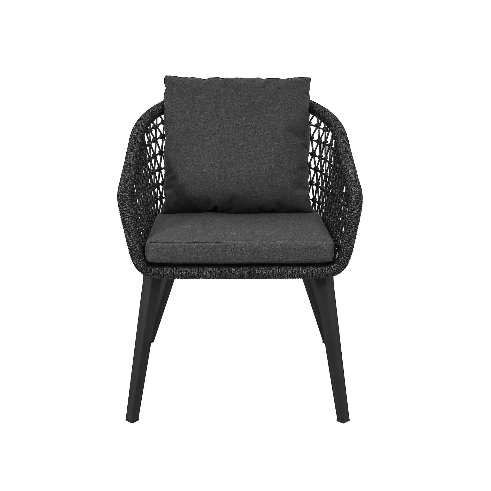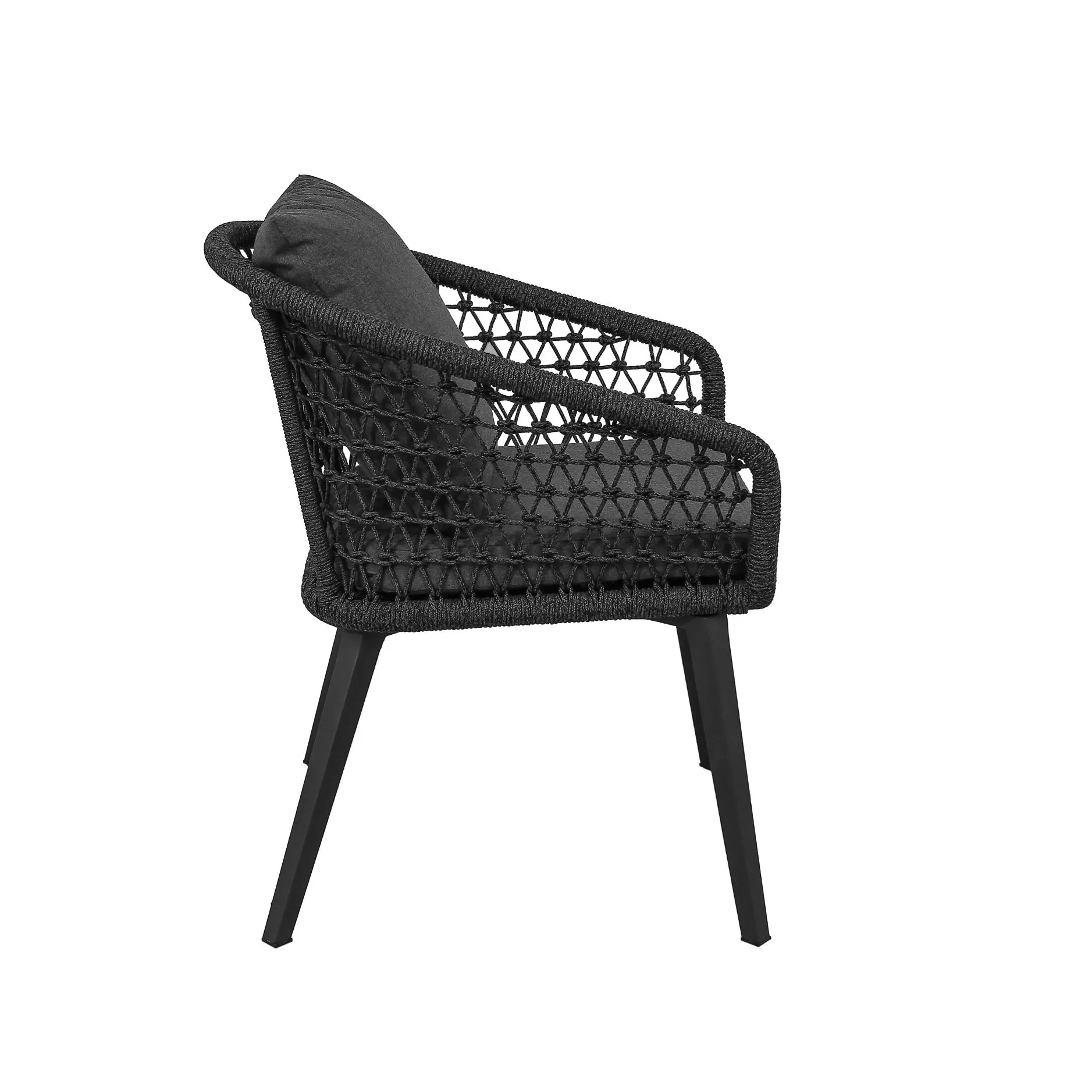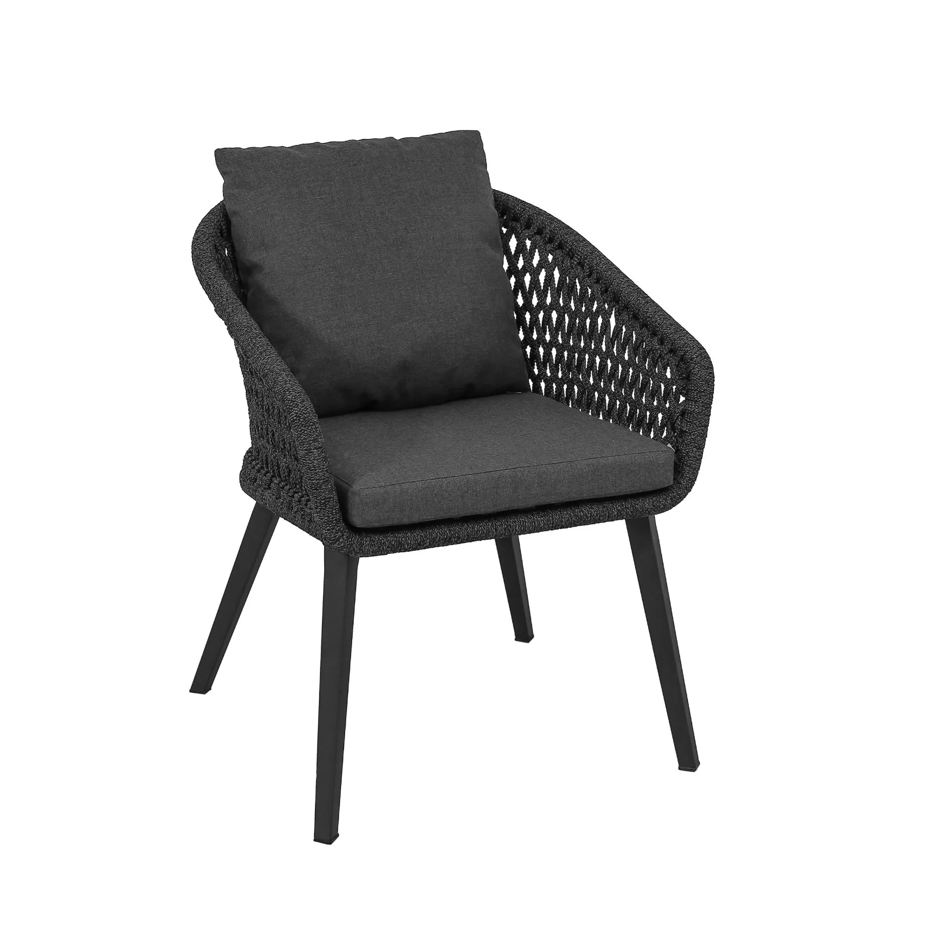 Die Sitzschale in Rundform mit fließendem Übergang von der Rücken- zur Armlehne besteht aus einem robusten Aluminiumrahmen und ist mit Rope bespannt. Das seilartige Material ist aus durchgefärbtem Polypropylen gefertigt und dadurch UV-beständig. Zudem gilt Rope als äußerst strapazierfähig und formstabil und passt sich beim Sitzen leicht an. Sie können hier aus vier verschiedenen Rope-Designs wählen: