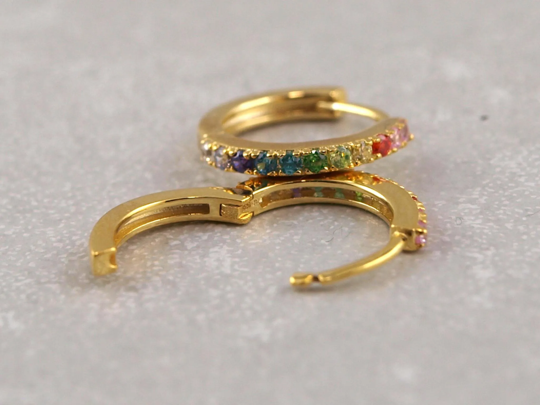 Diese wunderschönen Kreolen bestehen aus hochwertigem Silber oder sind vergoldet. Verschiedene bunte Zirkon-Steine sind im Regenbogen-Muster an den Kreolen befestigt. Dadurch bekommen diese Ohrringe einen ganz besonderen Look und werden zu einem echten Hingucker! Die Kreolen werden durch einen einfachen Schnapp-Verschluss sicher geschlossen und haben einen Durchmesser von etwa 13 mm.