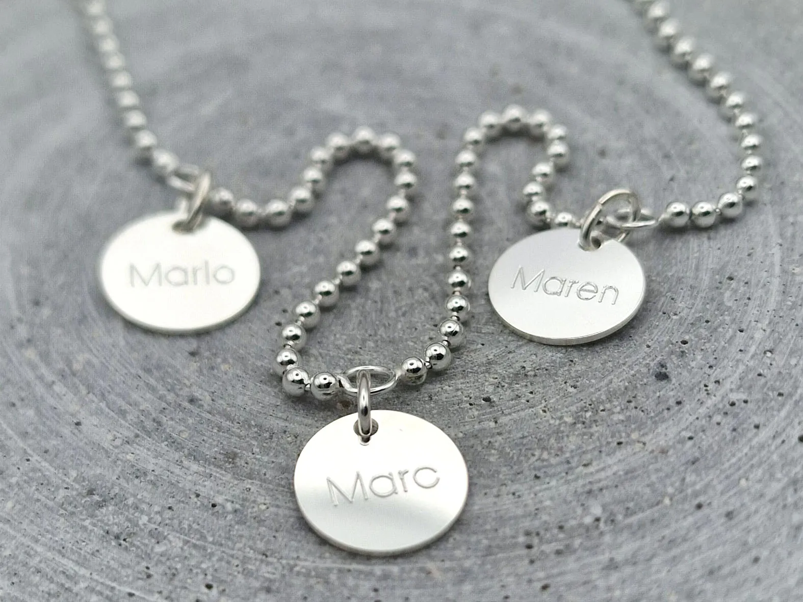 Familienkette aus Silber mit drei runden Gravur-Anhängern, Kugelkette, Namenskette