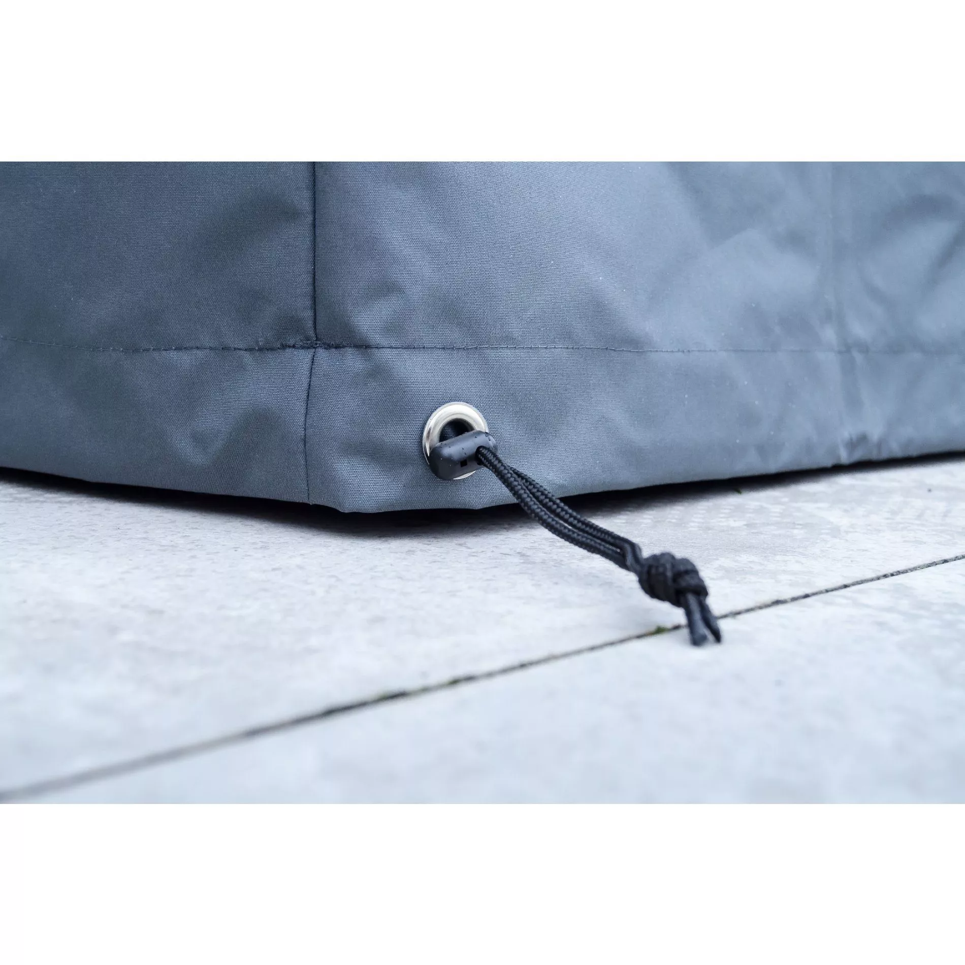 Die Schutzhülle ist bodenlang und wird mit Schnurzug und zusätzlichen Ösen im Saum zur sicheren Befestigung der Hülle geliefert.
