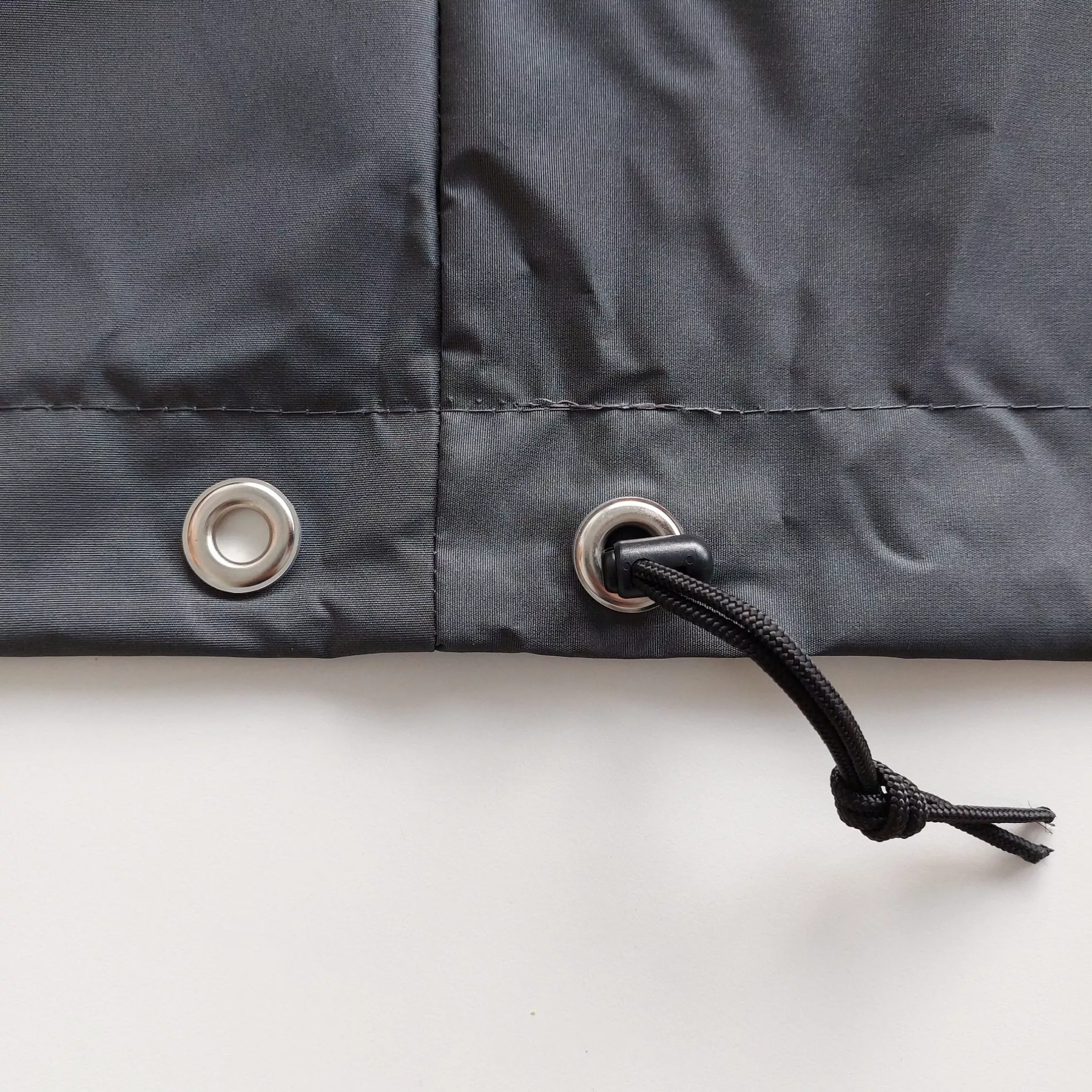 Die Schutzhülle ist bodenlang und wird mit Schnurzug und zusätzlichen Ösen im Saum zur sicheren Befestigung der Hülle geliefert.