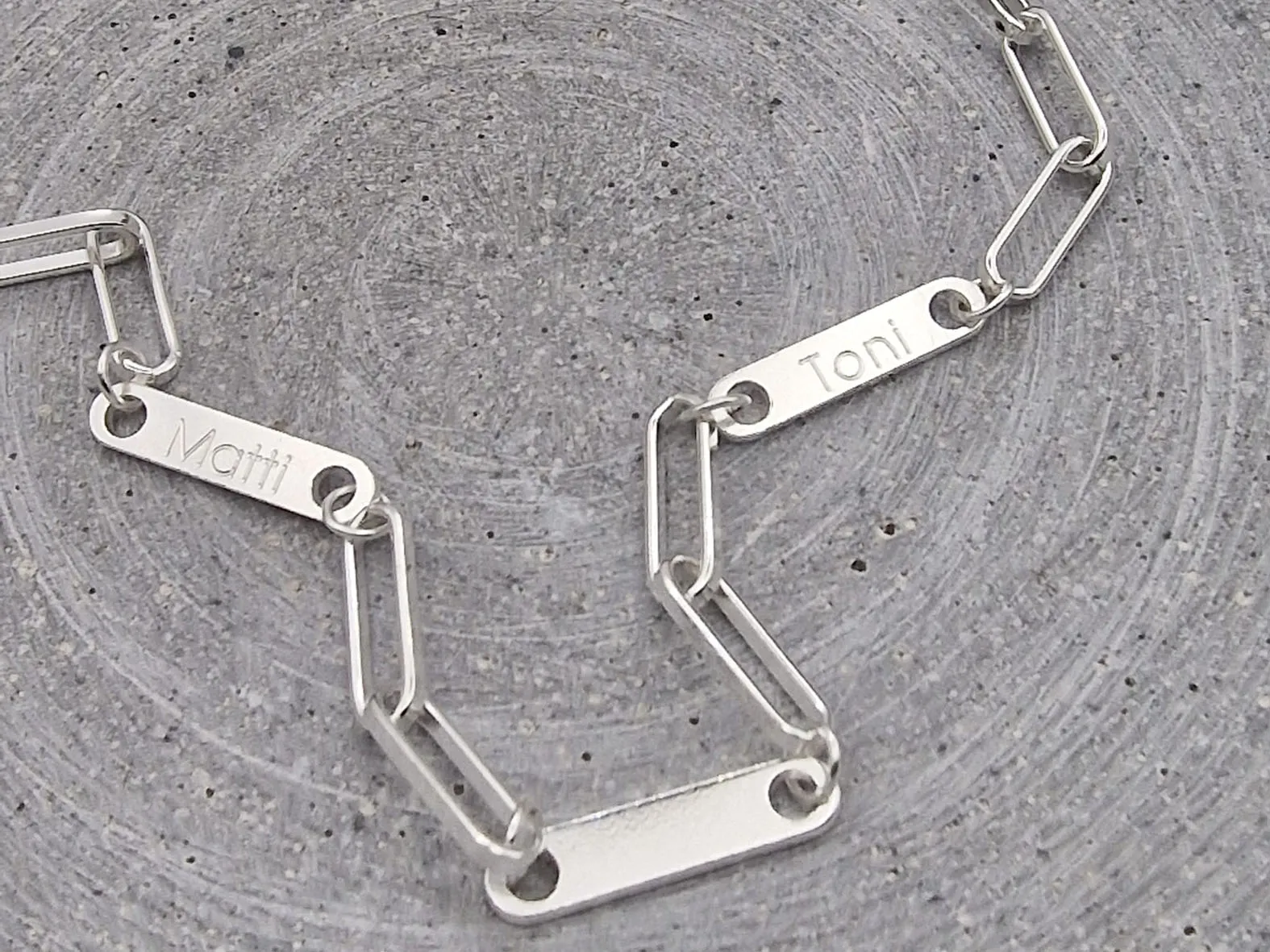 Formschöne Gliederkette mit drei kleinen eingefassten Plättchen für Ihren persönlichen Wunschtext. Gestalten Sie eine Namenskette als persönliches Geschenk für Frauen. Die Glieder können auf der Vorder- und Rückseite mit einer filigranen Gravur graviert werden. Lassen Sie beispielsweise die Namen Ihrer Lieblingsmenschen gravieren und tragen Sie diese immer nah an Ihrem Herzen. Die Kette wurde aus 925er Silber gefertigt und hat eine Länge von etwa 45 cm.