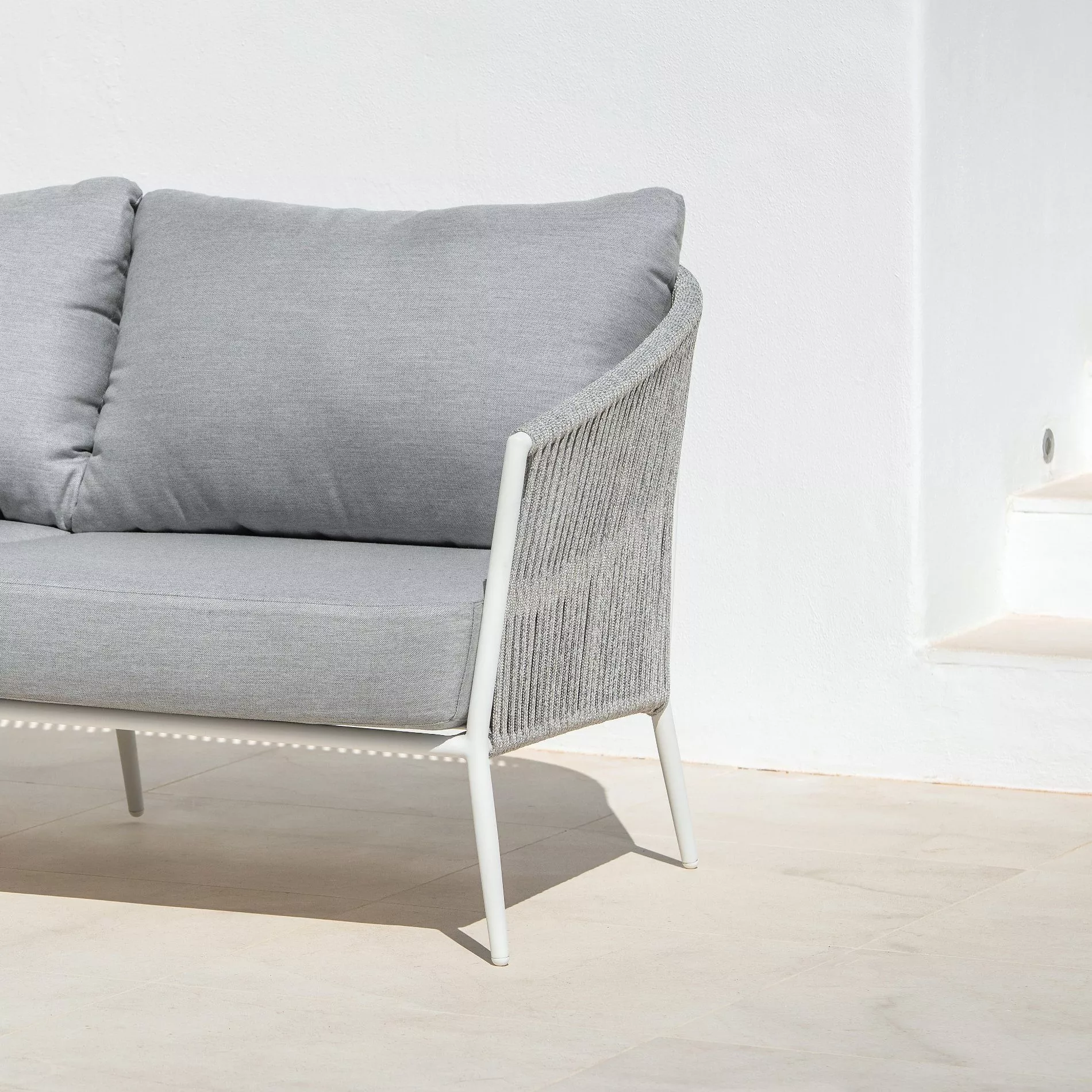 Die Bespannung des Sofas ist aus Rope gefertigt. Dieses Kunstfasermaterial ist wetterfest und bleibt dauerhaft in Form. Es verfügt über eine gute Lichtechtheit und benötigt keine besondere Pflege.