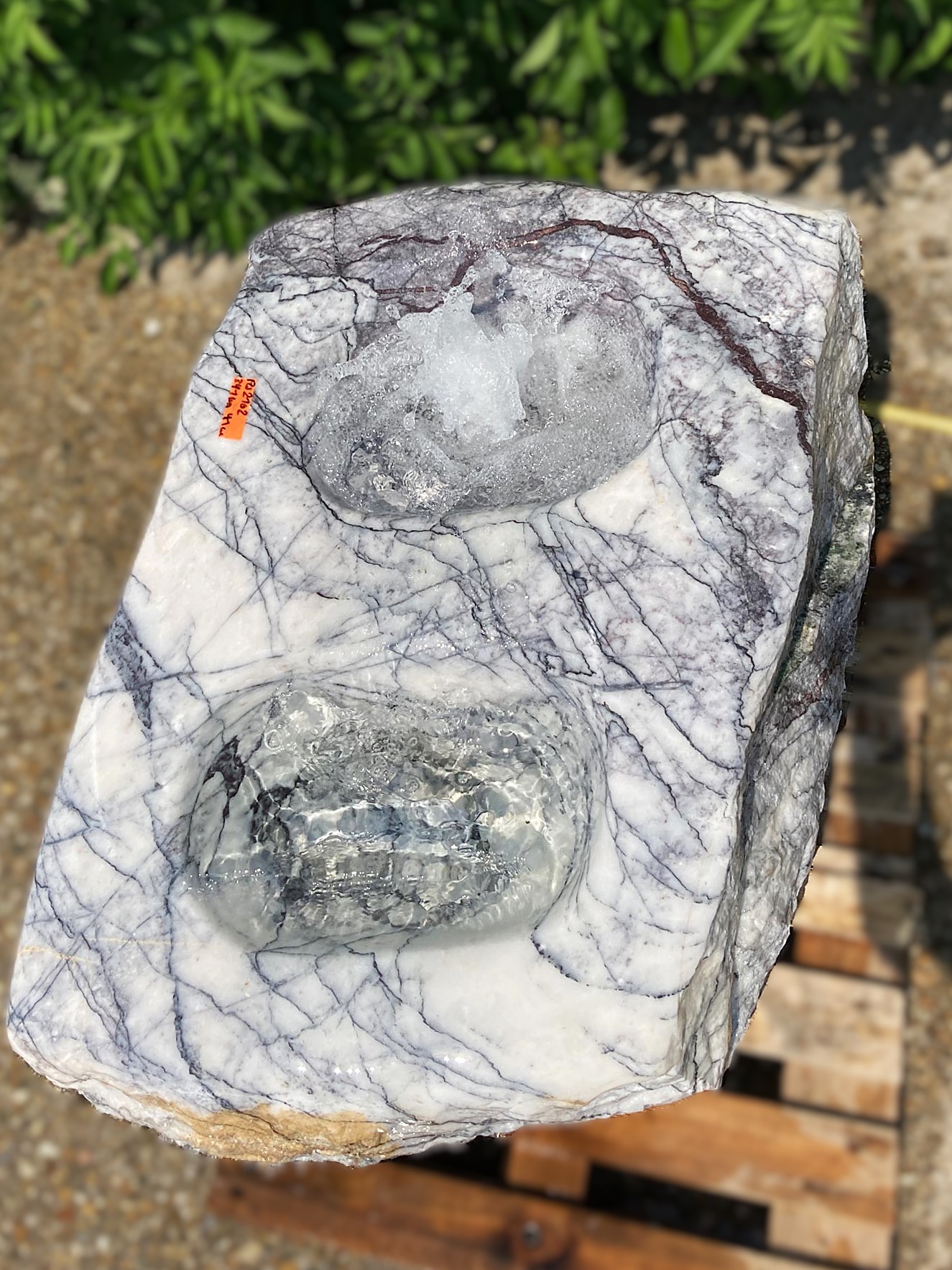 Wunderschön gefärbter und gezeichneter weiß-lila Marmor aus dem Ägäis-Raum. Der Farbton dieses Materials hebt sich wunderbar von der Umgebung ab.