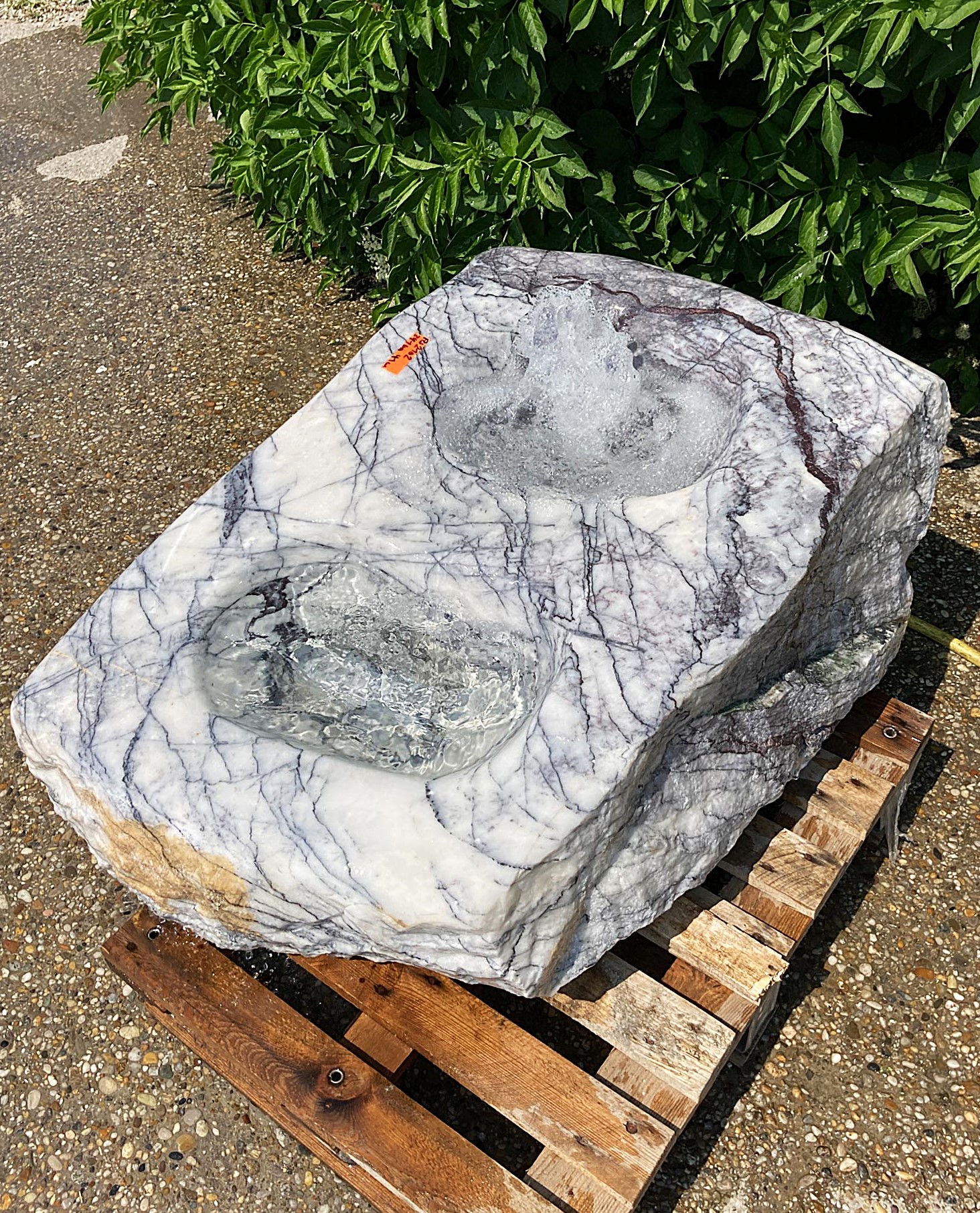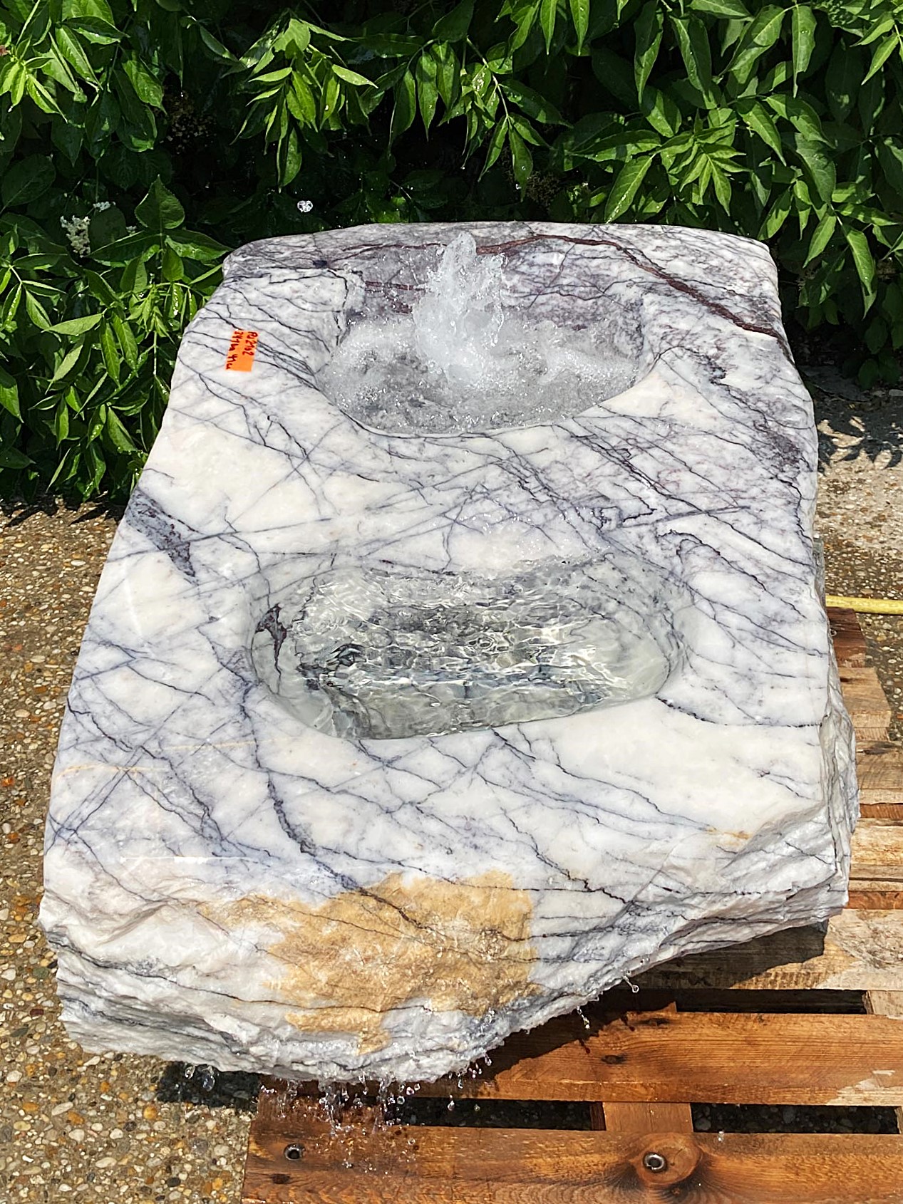 Hinweis: Auf Grund des natürlichen Wasserflusses und der von Stück zu Stück unterschiedlichen Form dieser flachen Quellsteine, kommt es meist dazu, dass nicht 100% der Oberfläche bewässert wird. Es verbleiben somit Stellen, welche trocken bleiben und somit heller sind, als der nasse Teil des Steins.