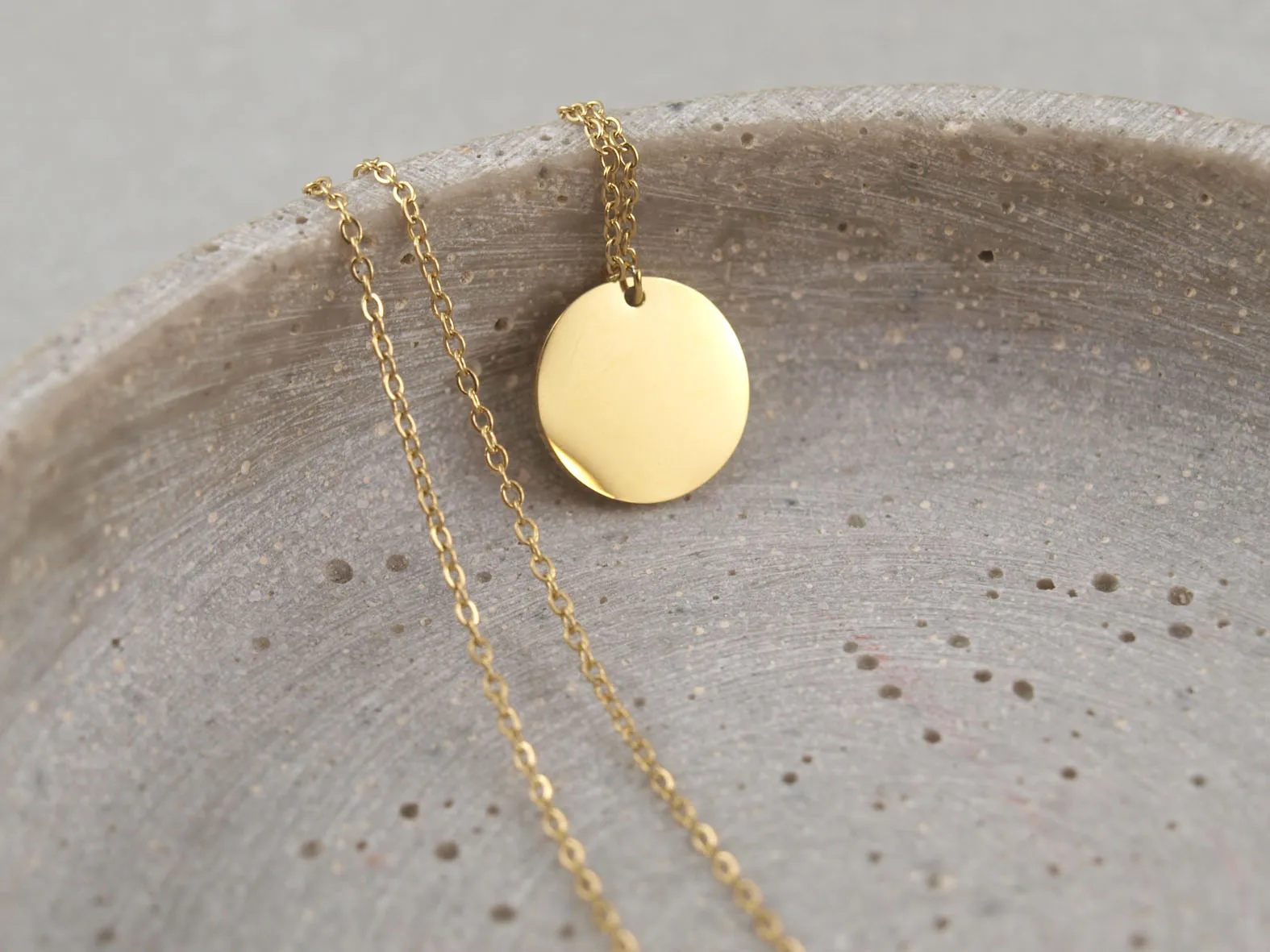 Diese wunderschöne goldene Kette mit rundem gravierbarem Plättchen aus Chirurgenstahl ist hypoallergen. Sie ist in der Länge 42 + 8 cm verstellbar und in den Farben Silber und Gold verfügbar. Der runde Gravur Anhänger lässt sich auf beiden Seiten mit einer Gravur versehen. Personalisieren Sie die Kette nach Ihren Wünschen durch Grafik oder Wunschtext.
