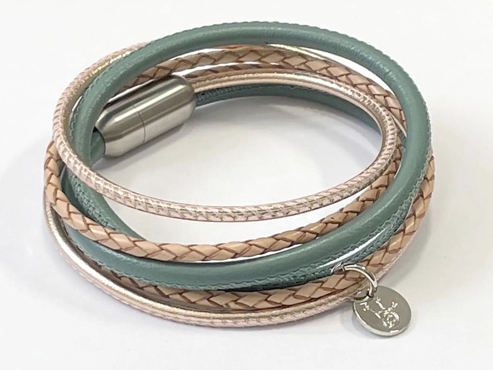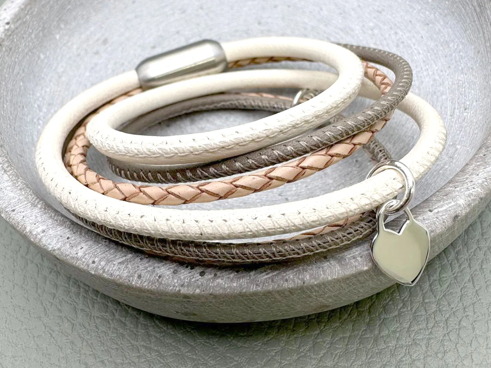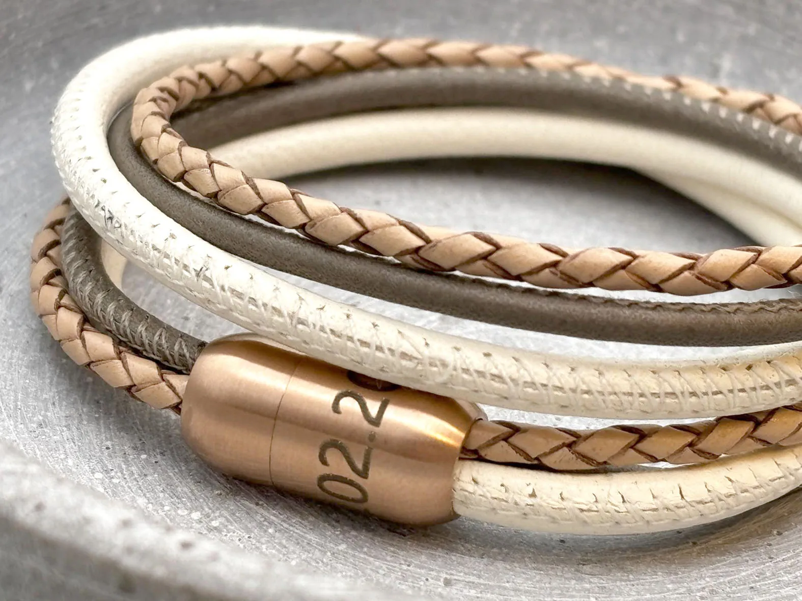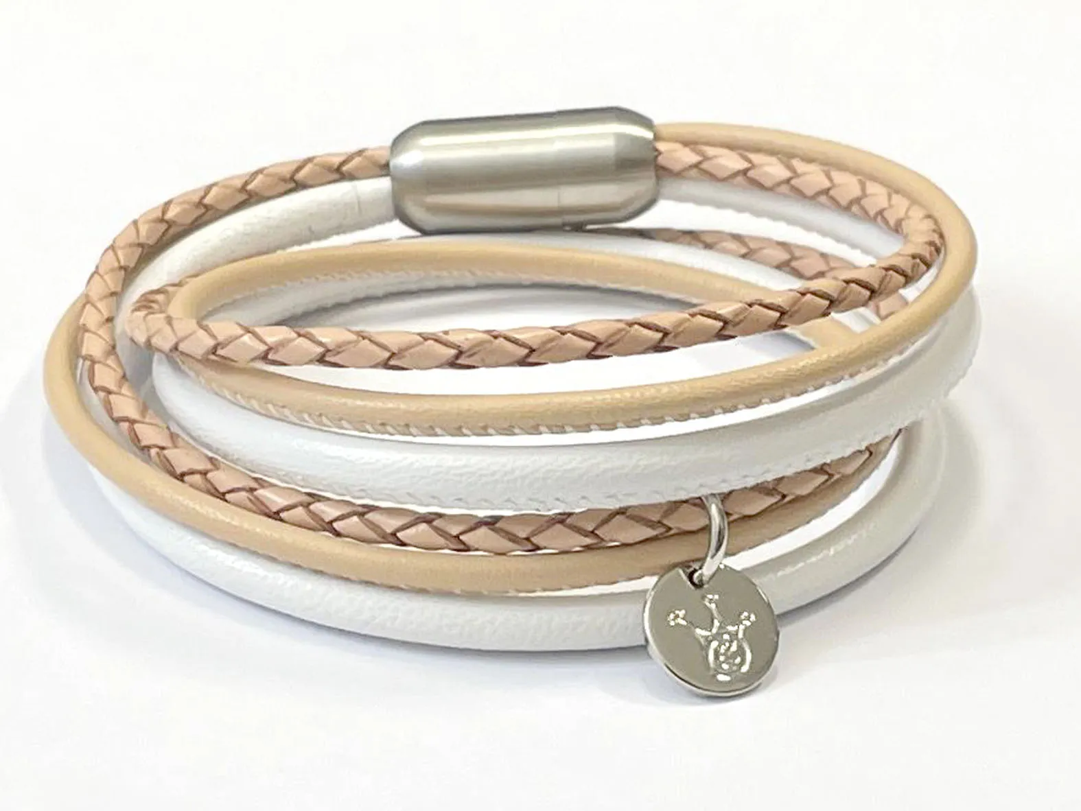 Das Lederarmband für Damen aus feinstem Nappaleder ist zweifach gewickelt und mit einem Magnetverschluss aus Chirurgenstahl versehen. Zusätzlich können Sie für das Band verschiedene Gravur Anhänger auswählen. Diese gravieren wir Ihnen gerne mit einem Text oder einer individuellen Grafik. Ihrer Kreativität sind kaum Grenzen gesetzt! Verschenken Sie dieses Lederarmband mit mehreren Gravur Anhängern. Wählen Sie zwischen vielen Farbkombinationen. Die Basis ist immer ein geflochtenes Lederband in der Farbe Natur (Beige).
