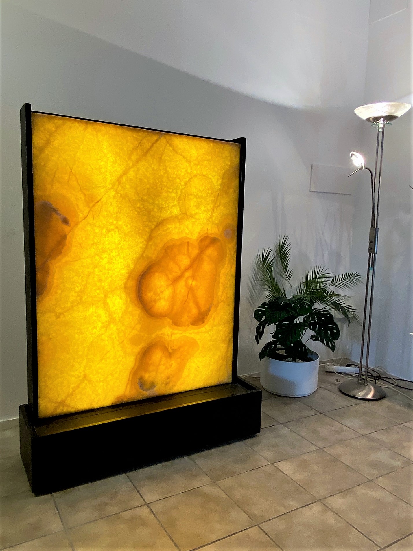 Dieses Brunnenmodell begeistert durch seine sehr starke Leuchtkraft. Die 2cm starke edle Onyxplatte, über die das Wasser sanft herunterfließt, ist eingefasst in einem schwarzen Naturstein-Rahmen aus dem afrikanischen Granit “Nero Zimbabwe” (Oberfläche geflämmt und gebürstet). Dieses Material ist extrem robust und verleiht dem Brunnen die notwendige Stabilität.