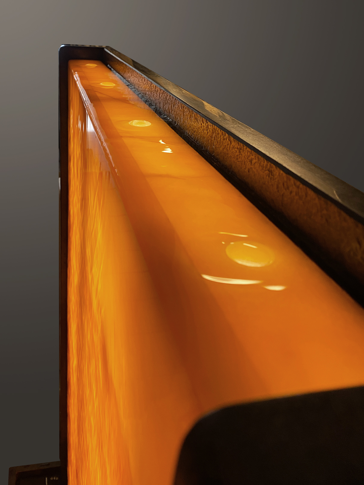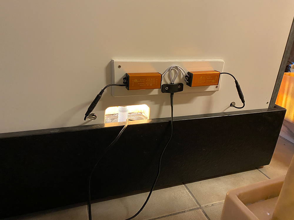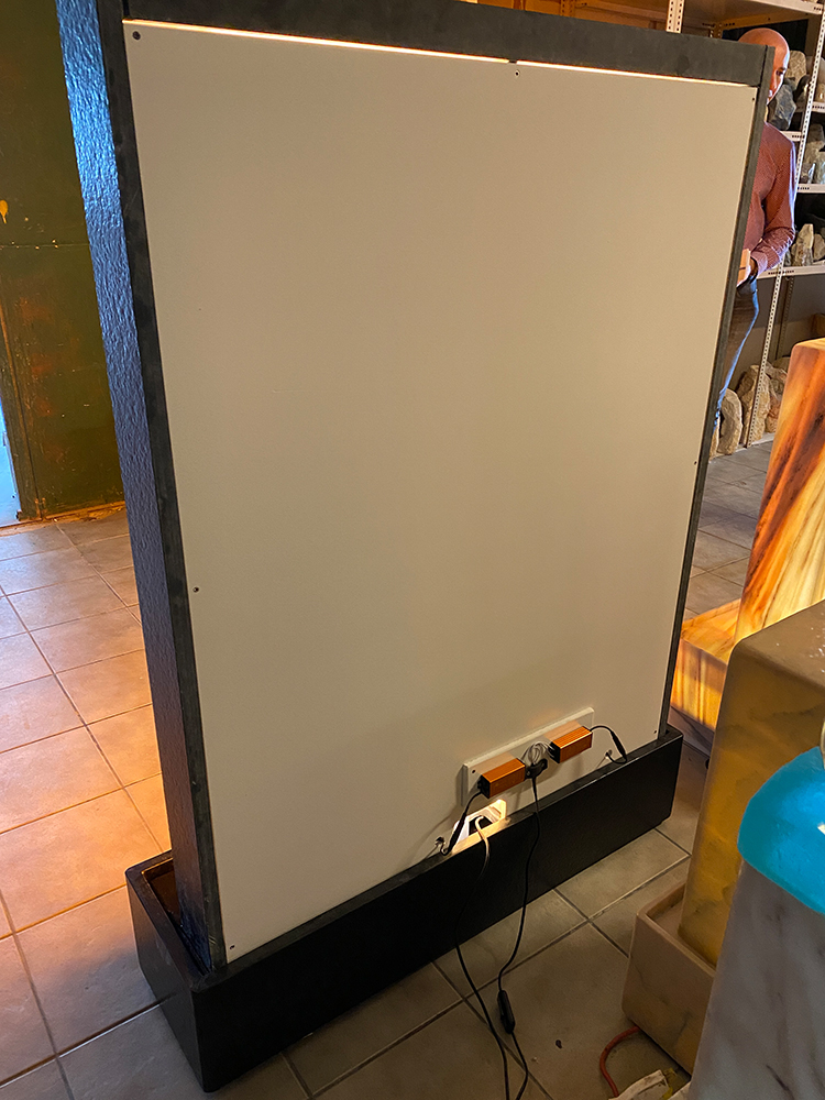 Die gleichmäßige Beleuchtung dieses Brunnens erfolgt durch zwei flache LED-Panele 120 x 30 cm (á 40W), welche in der Rückwand der Wasserwand untergebracht sind und um einiges kräftiger strahlen als bei anderen Modellen, so dass der Leuchteffekt auch in helleren Räumen sehr gut zur Geltung kommt. Die Trafos für die LED-Panele sind an der Rückseite des Brunnens montiert (auf Wunsch & gegen Aufpreis können die Panele auch mit dimbaren Trafos ausgerüstet werden um ein sanfteres Leuchten für dunkle Abendstunden zu ermöglichen).