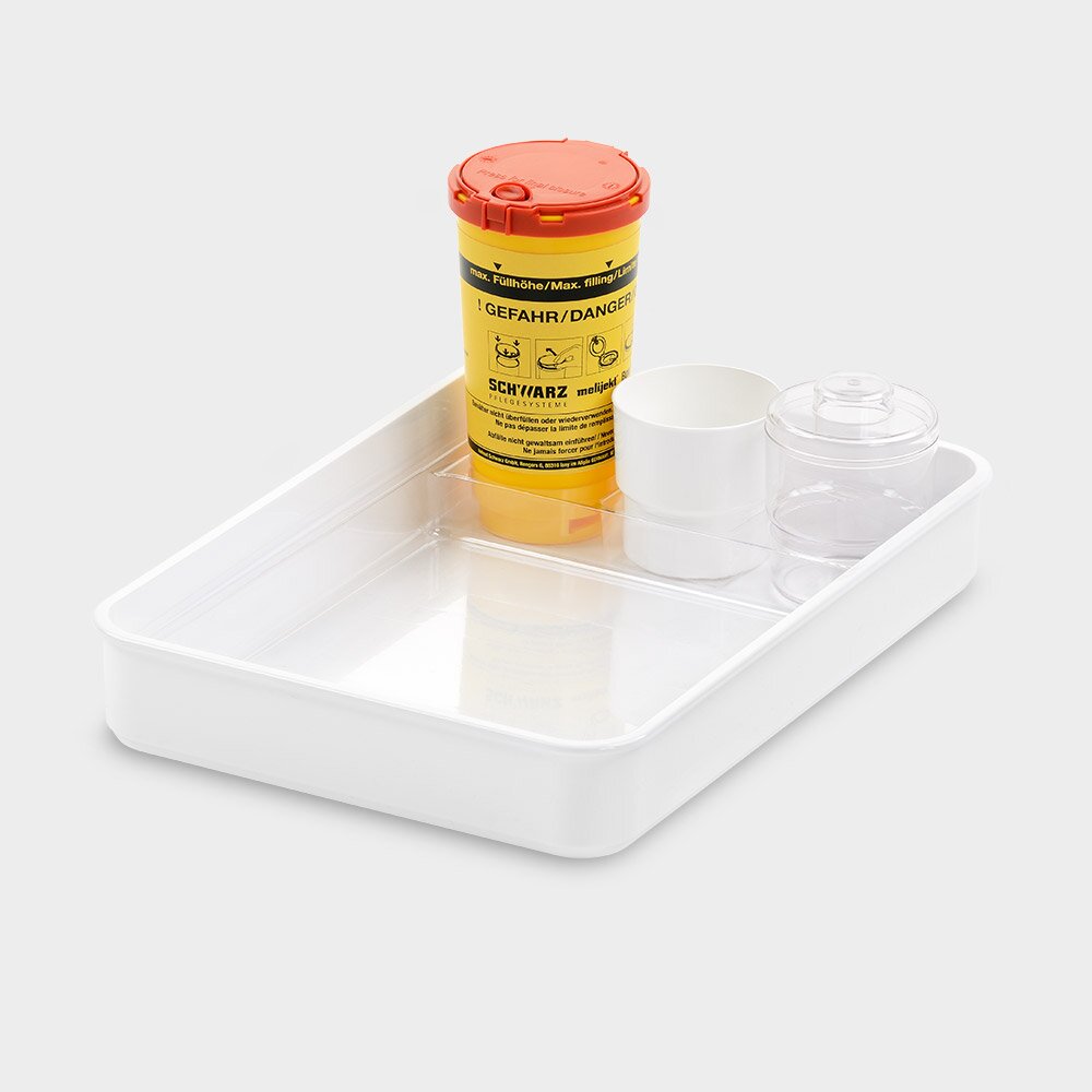 mit Tablett-Einsatz 1 Kanülensammelbox 1 Utensilienbecher rund und 1 Tupferbecher mit Deckel Außenmaße: L 353 x B 253 x H 55 mm