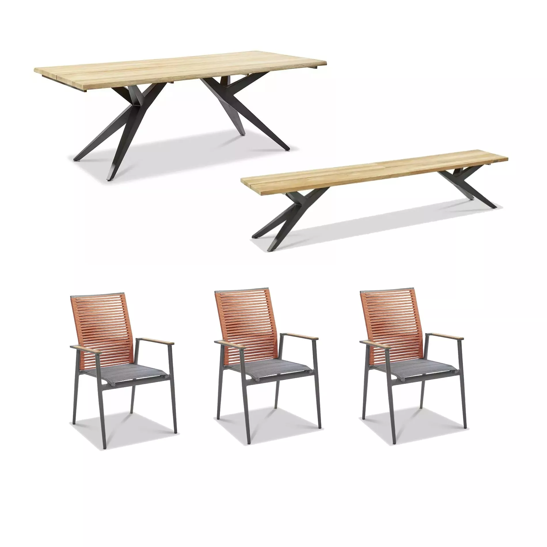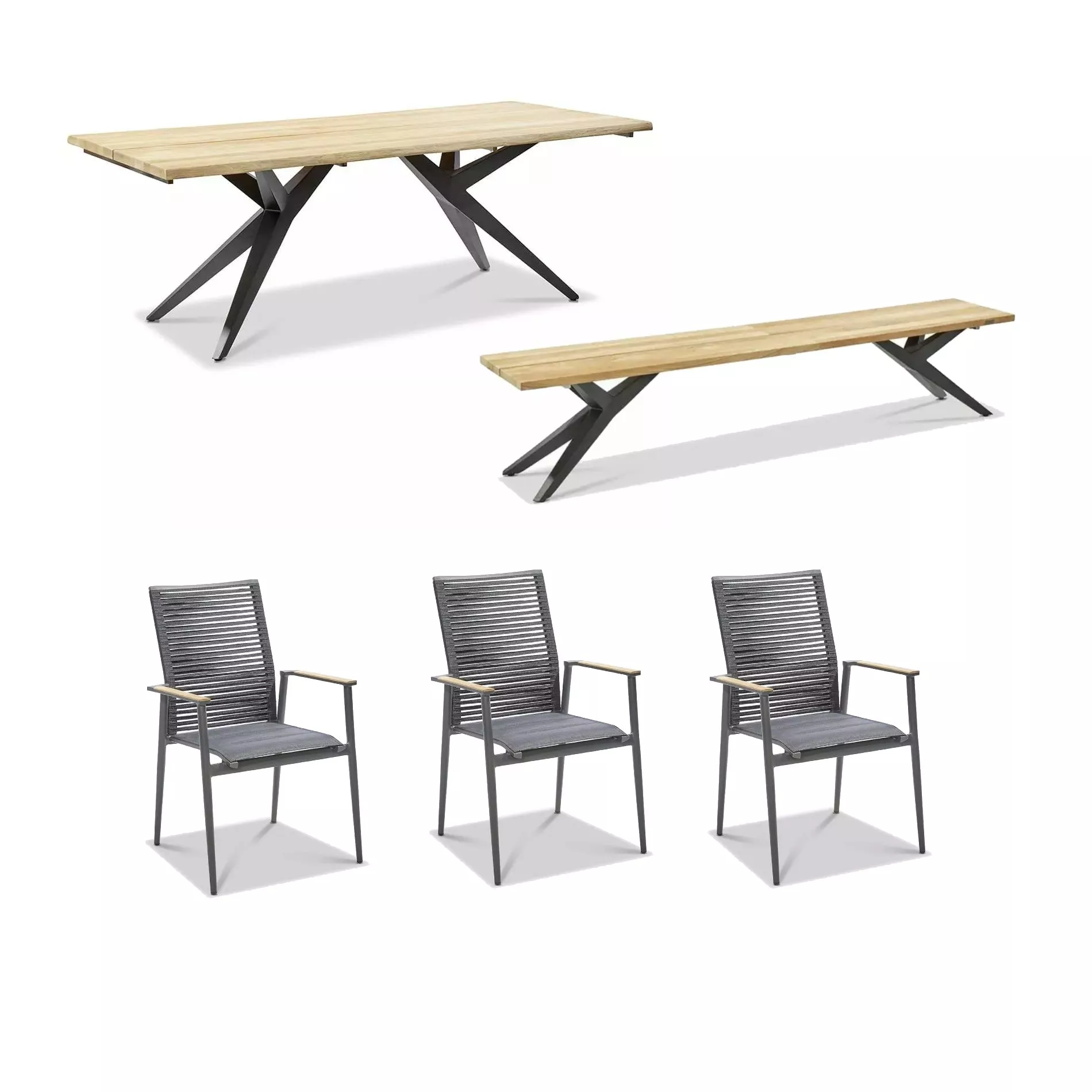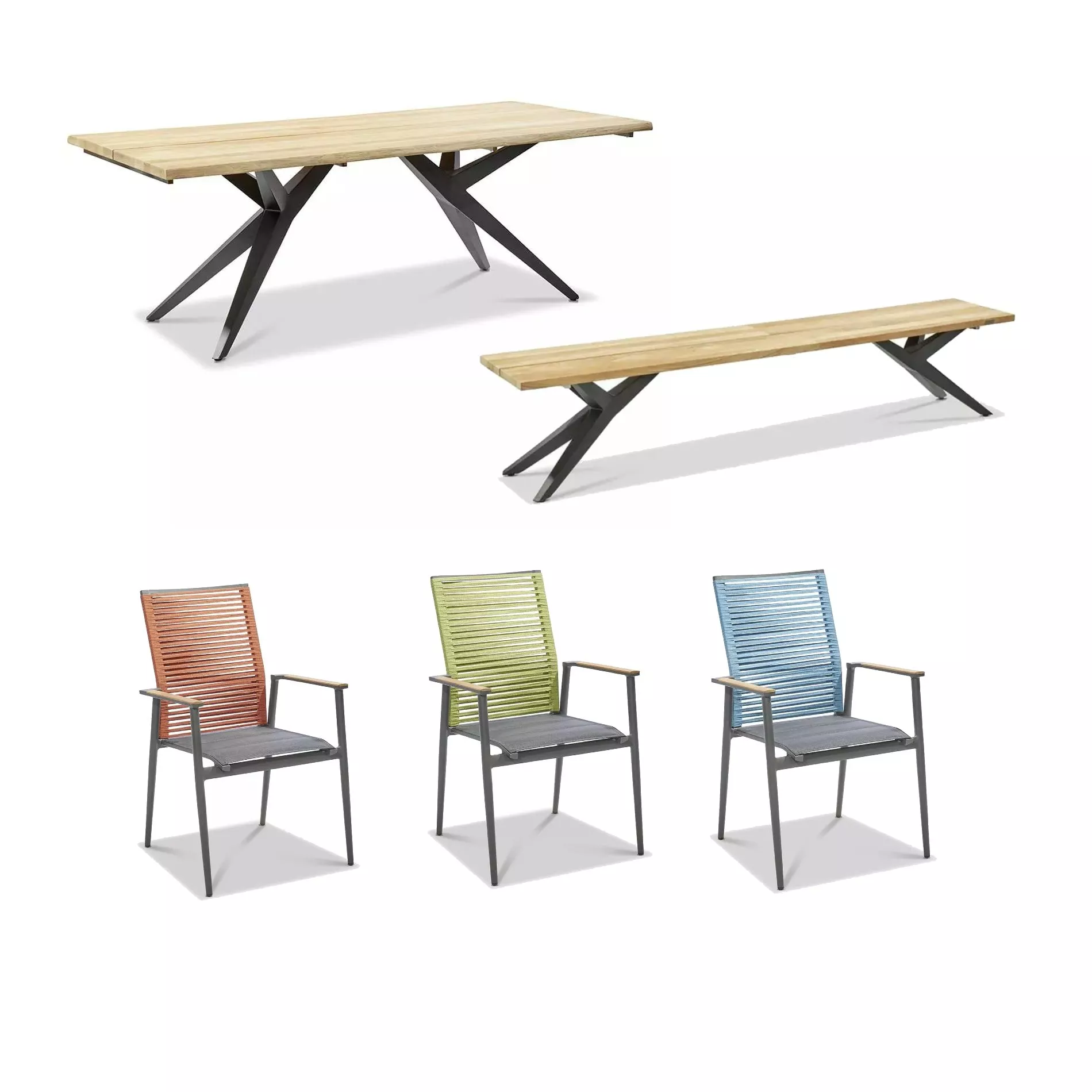 besteht aus drei Stapelstühlen “Amsterdam”, dem Gartentisch “Holland” und der Bank “Rotterdam” mit anthrazitfarbenen Gestellen. Die Gestelle von Tisch und Bank bestehen aus pulverbeschichtetem Edelstahl, das Material verleiht ihnen neben einer hohen Stabilität auch ein top modernes Aussehen. Die Gestelle der Stühle bestehen aus pulverbeschichtetem Aluminium und sind super handlich. Sie lassen sich, dank ihres geringen Gewichts, ohne großen Kraftaufwand umstellen oder stapeln.