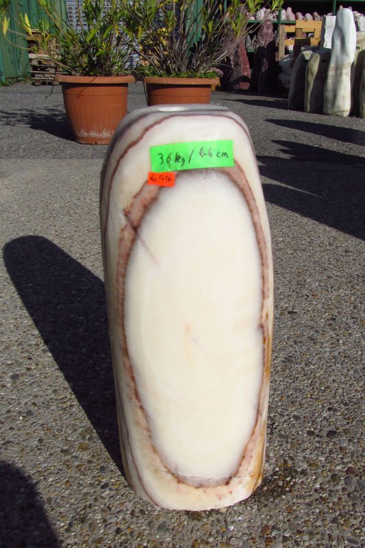 Dieser, komplett geschliffene, gestreifte Onyx besticht durch seine feine Zeichnung und durch sein wunderbares Farbenspiel. Dieser Stein wird ein herrlicher Blickfang in Ihrem Garten sein. Das Material ist 100%ig frostsicher.