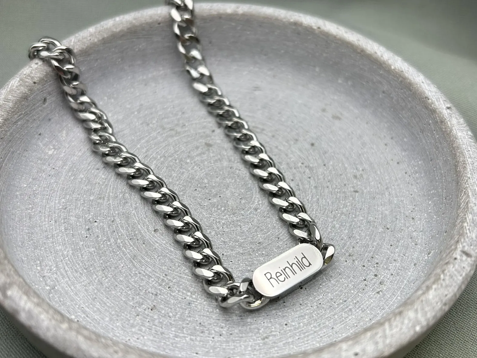 Diese Kette wurde aus Titan gefertigt und ist somit ideal für Allergiker geeignet. Das Schild kann mit einer individuellen Gravur versehen werden und es besteht auch die Möglichkeit, in zwei Zeilen zu gravieren. Die Kette ist in der Farben Silber erhältlich.