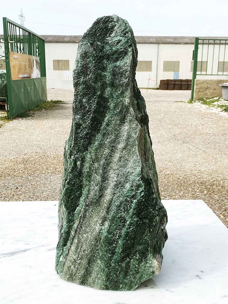 Atemberaubend ist dieser wundervoll gefärbte und geäderte Quarzit mit einem hohen Anteil an Fuchsit. Der Stein stammt aus dem hohen Norden Norwegens, oberhalb des Polarkreises. Er beeindruckt mit seinem satten, tiefen Grün.