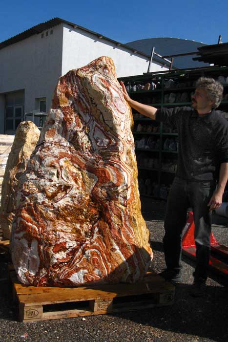 Dieses 1,2 Tonnen schwere Prachtstück ist zur Zeit unser Flaggschiff unter der Regenbogen-Sandstein Gartenfelsen.