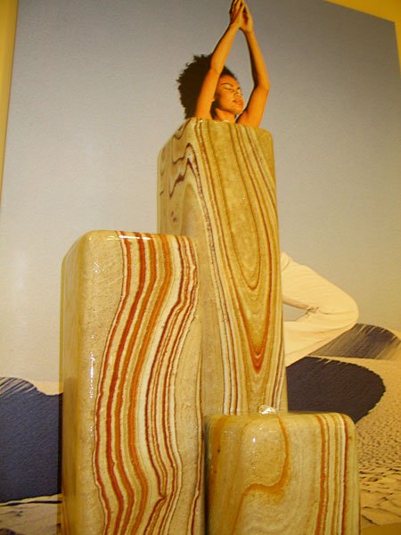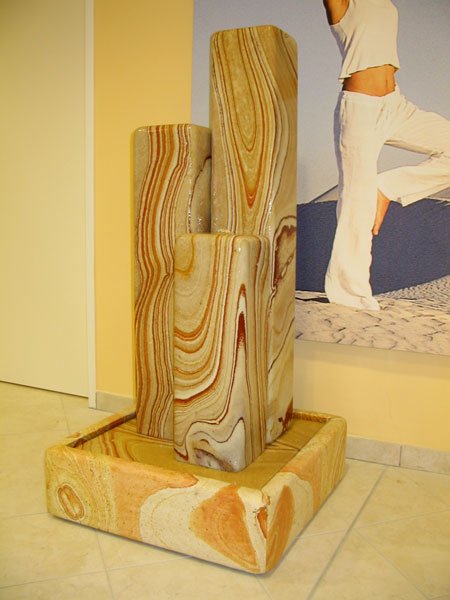 Dieses unglaublich schöne Sandsteinmaterial ist der ideale Brunnenstein, da er eine positive & lebensfrohe Stimmung verbreitet und erst im Wasser seine ganze Farbenpracht preisgibt. Die geradlinige Form der Stelen und die fröhlich verspielte Zeichnung dieses besonderen Natursteins ergänzen sich perfekt.