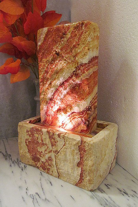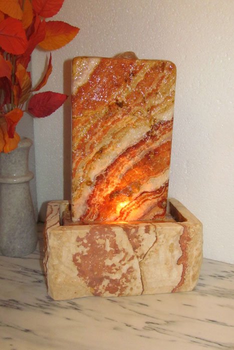 Dieser Tischbrunnen aus anatolischem Regenbogen-Sandstein hat durch die felsige Oberfläche an der Vorderseite ein besonders lebendiges Wasserbild.