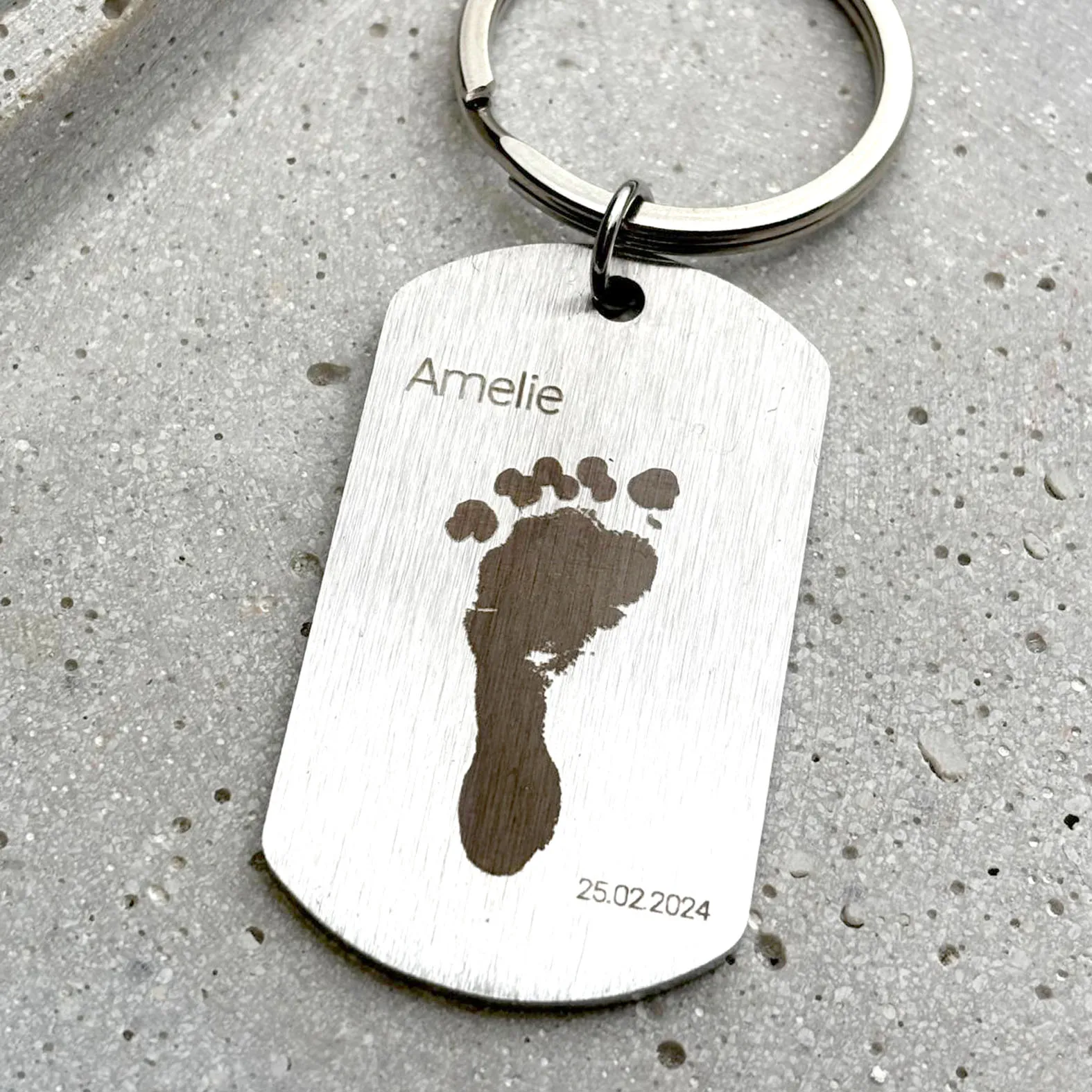 Schlüsselanhänger mit Handabdruck, Fußabdruck und Kinder Name als Gravur-Option