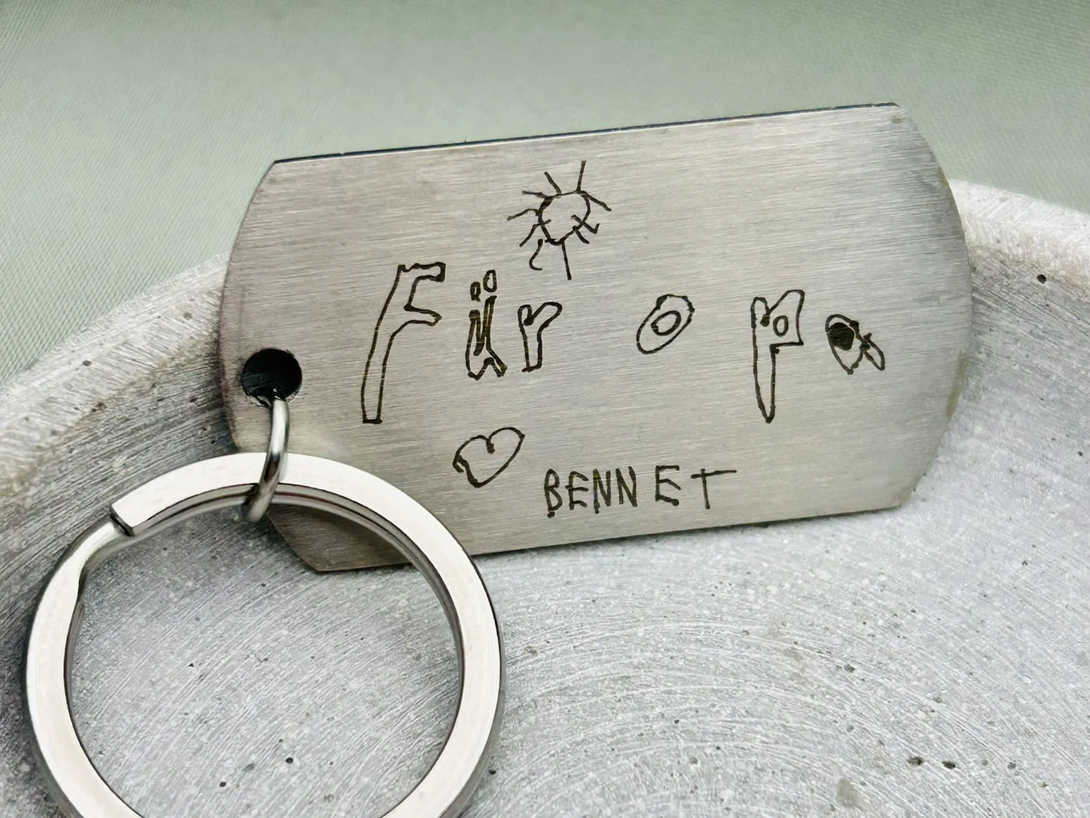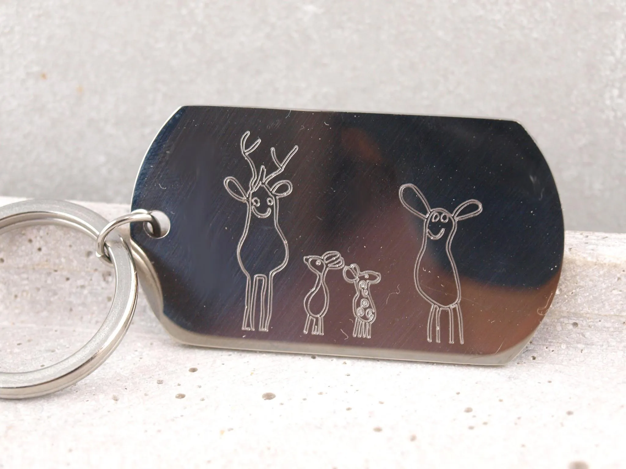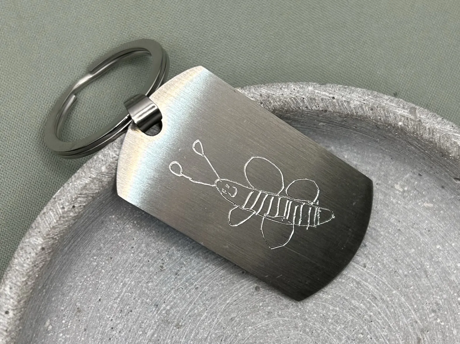 Produktinformationen zu dem Schlüsselanhänger mit Gravur: Kinderzeichnung, Bild, Handschrift, Fingerabdruck, Foto usw. sind als Gravur möglich