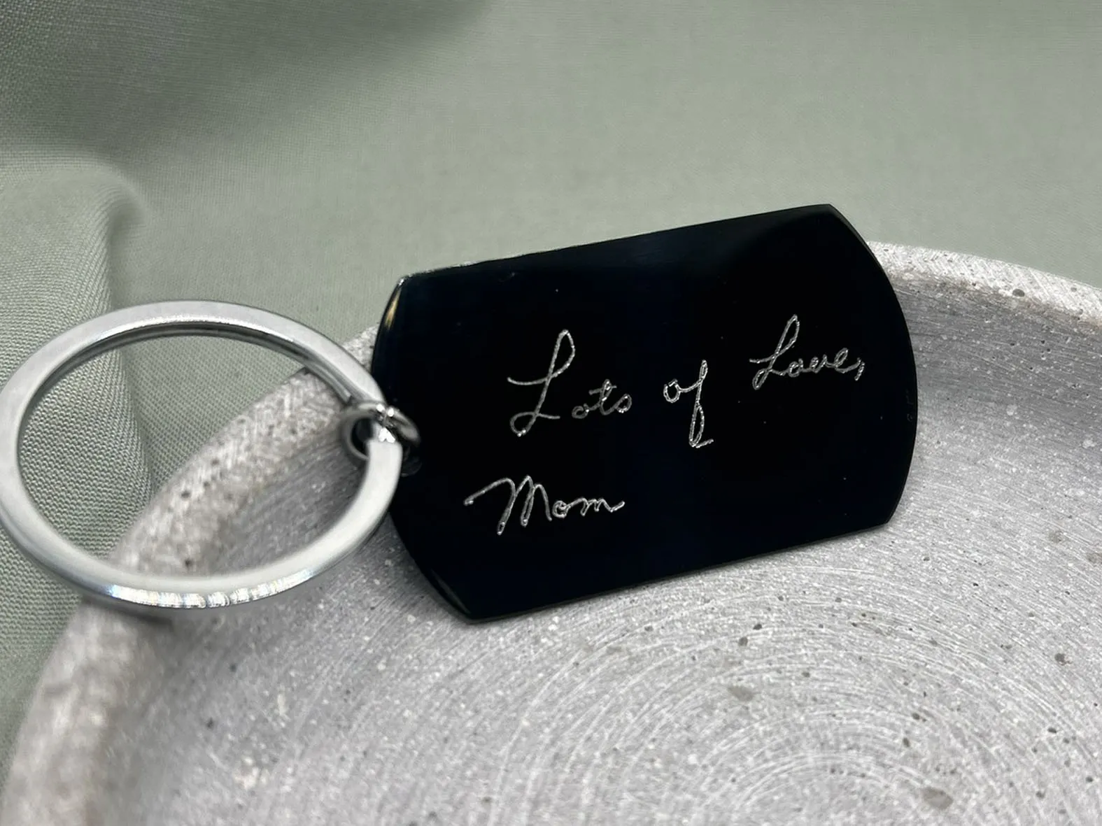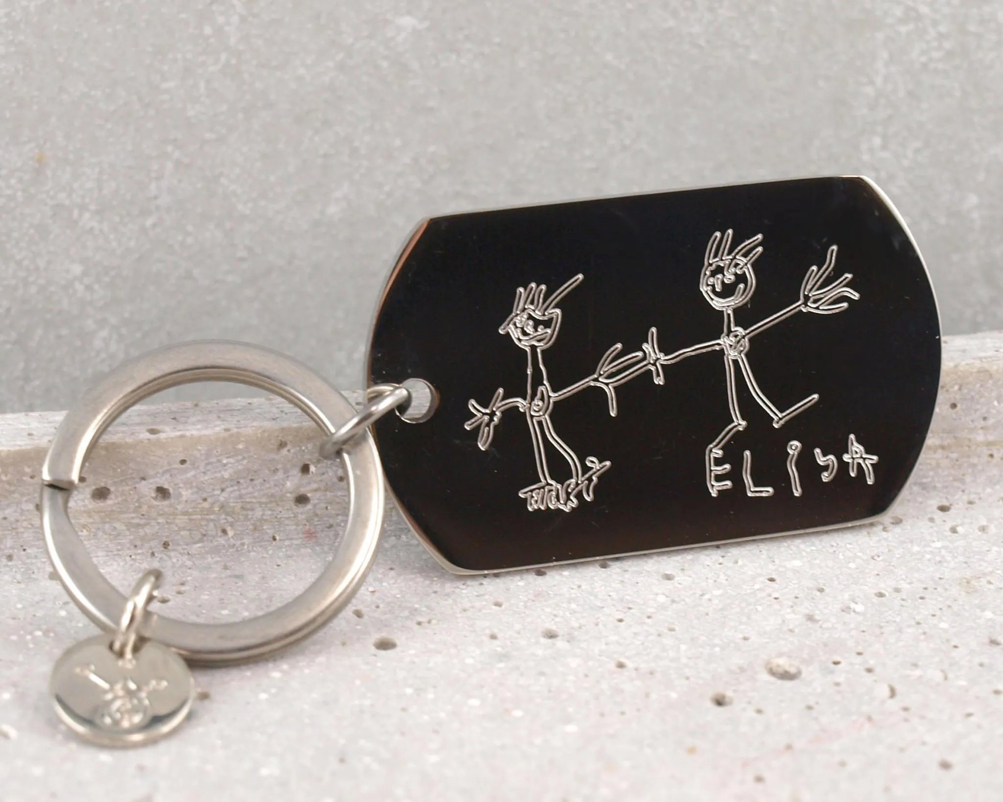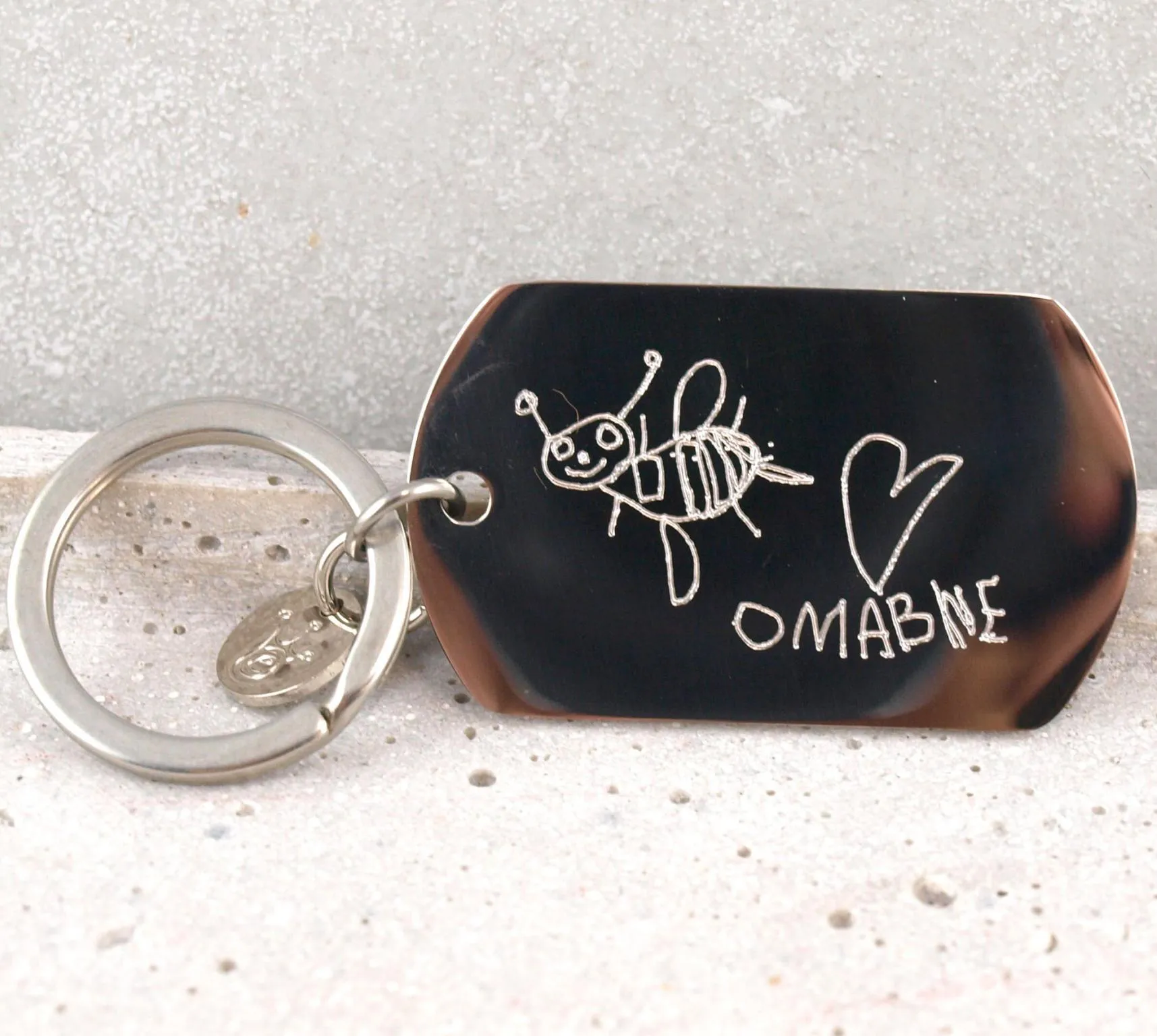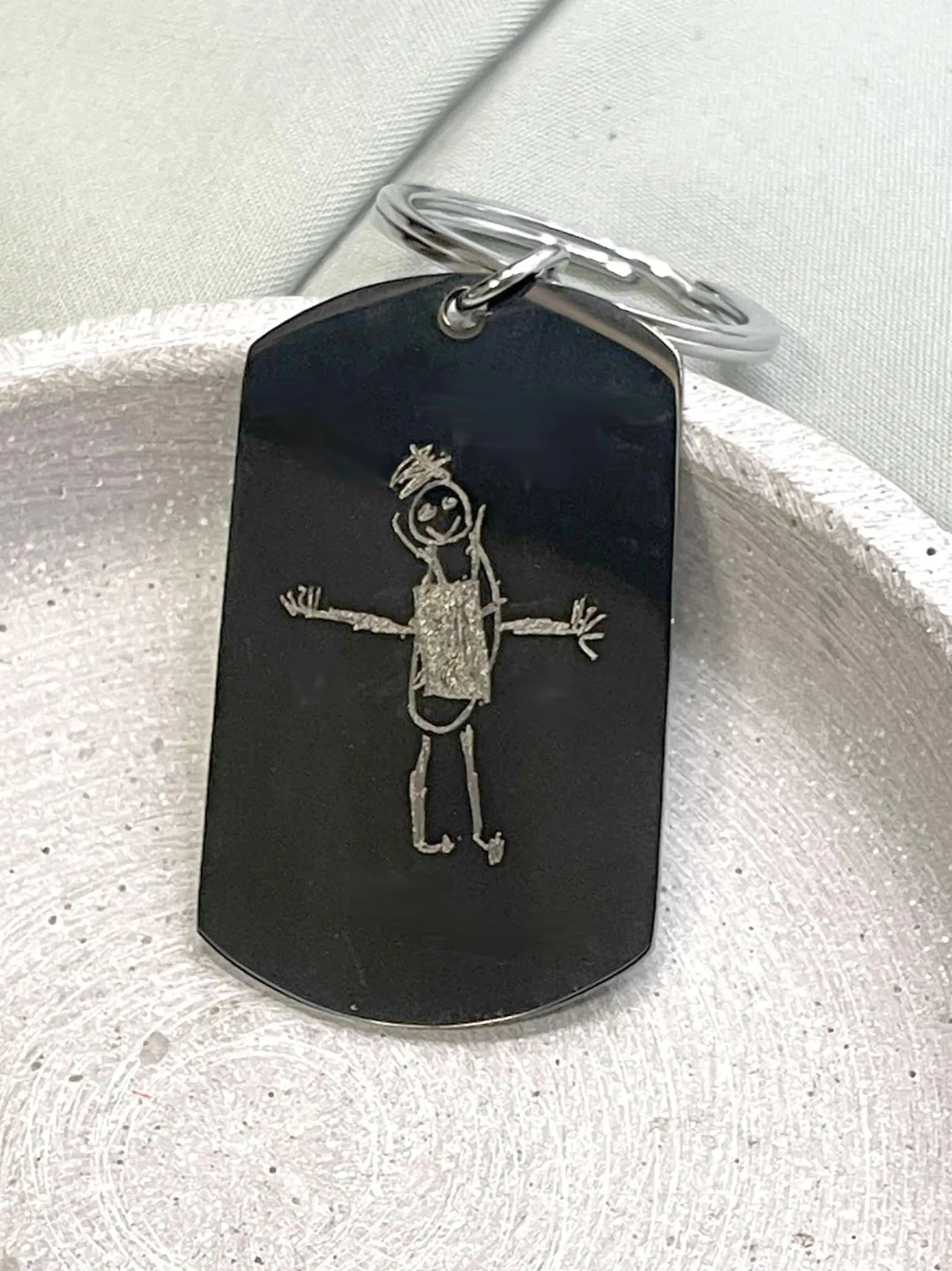 Produktinformationen zu dem Schlüsselanhänger mit Gravur: Kinderzeichnung, Bild, Handschrift, Fingerabdruck, Foto usw. sind als Gravur möglich