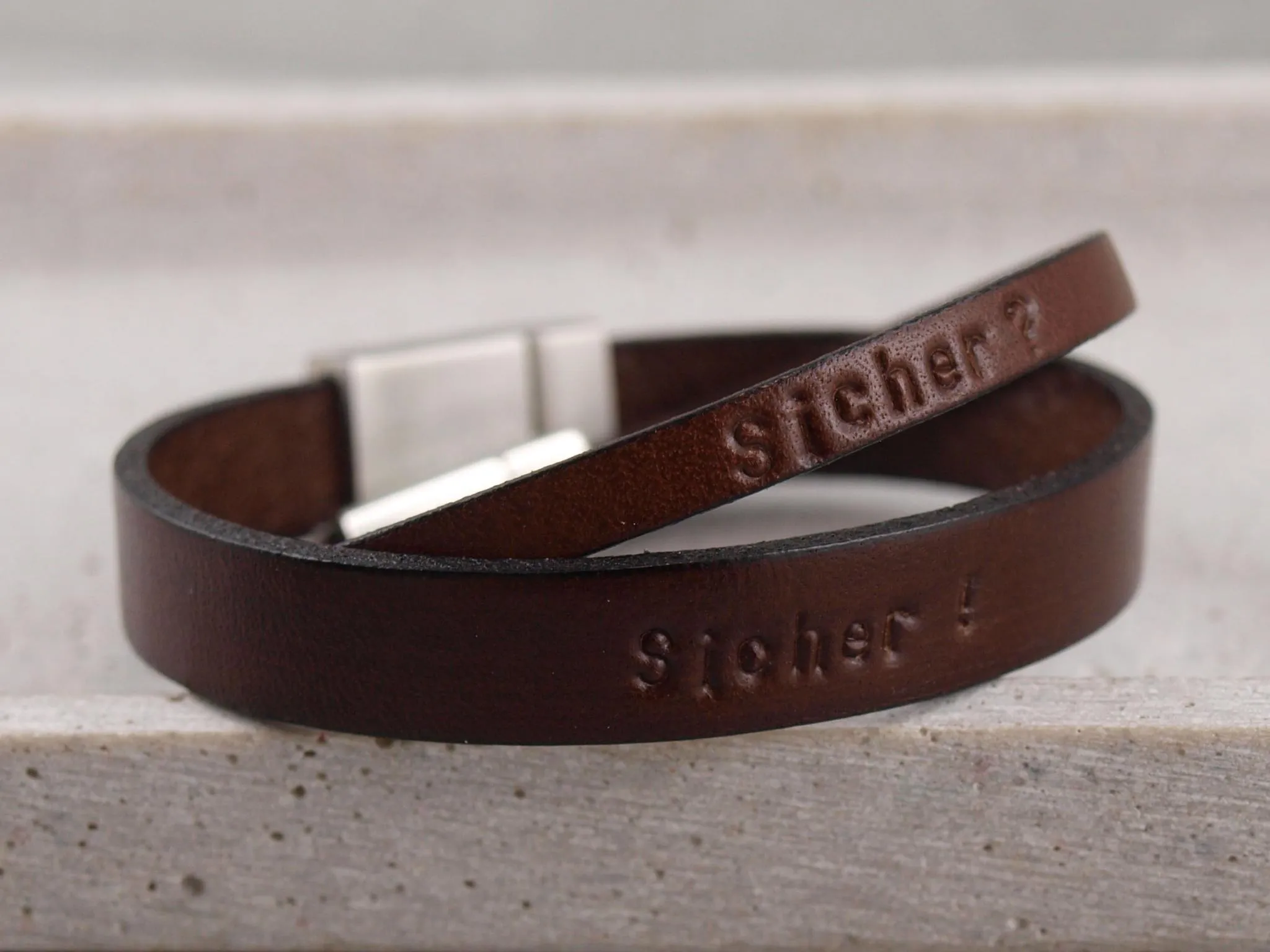 - Personalisierbar durch Prägung auf Leder oder Gravur auf dem Verschluss