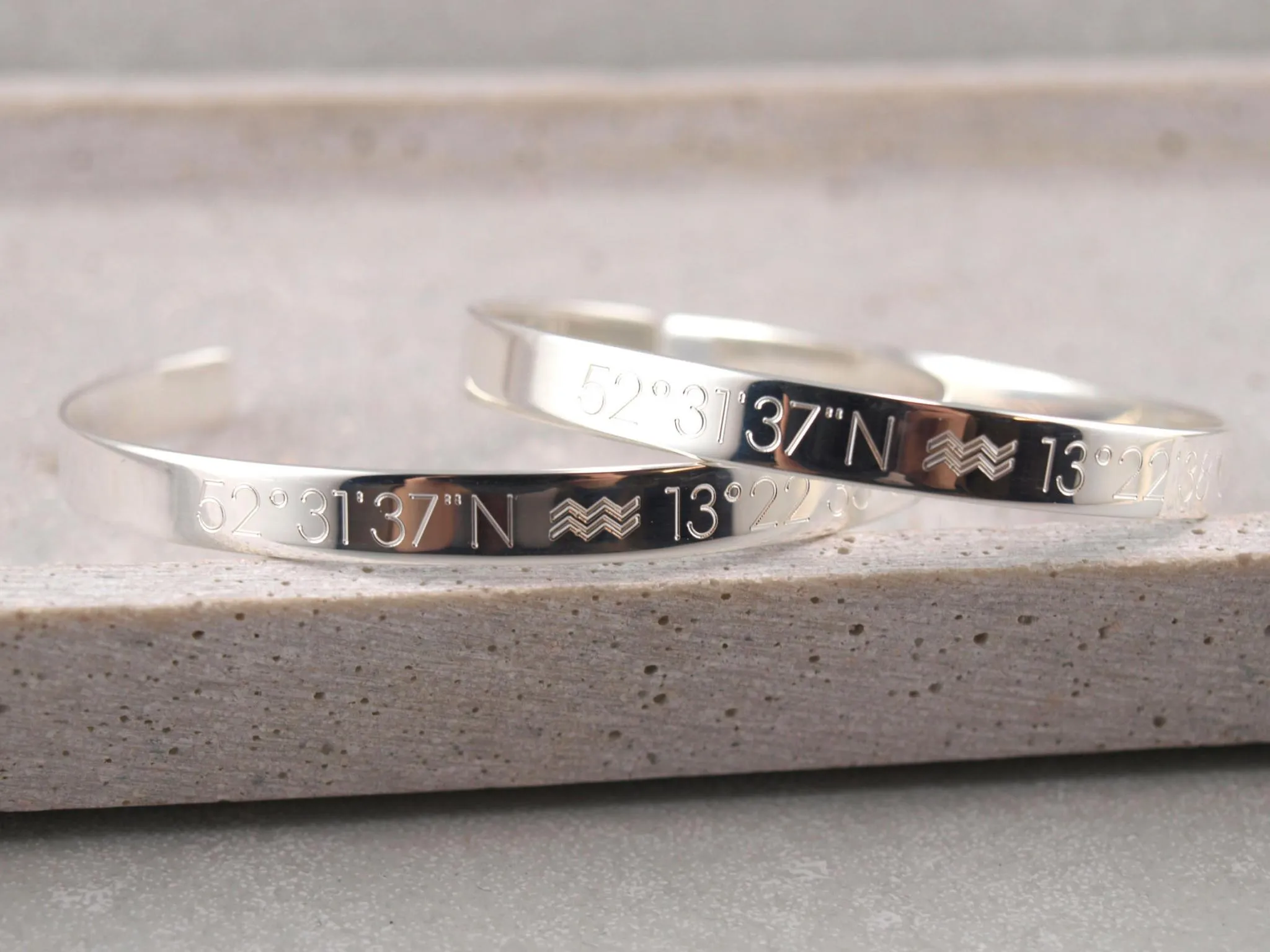 Suchen Sie eine romantische Geschenkidee als Zeichen der Zusammengehörigkeit? Lassen Sie die Koordinaten des Ortes der ersten Begegnung gravieren oder eine Geheime Liebes-Botschaft in Morse Zeichen. Wir gravieren Handschriften, Daten, römische Zahlen, Wunschtexte und Symbole. Auch individuelle Grafiken können auf dem Armreif auf der Innenseite oder der Außenseite graviert werden. Dieses Armspangen Set als Partnerarmband ist die persönliche Geschenkidee für Ihren Partner.