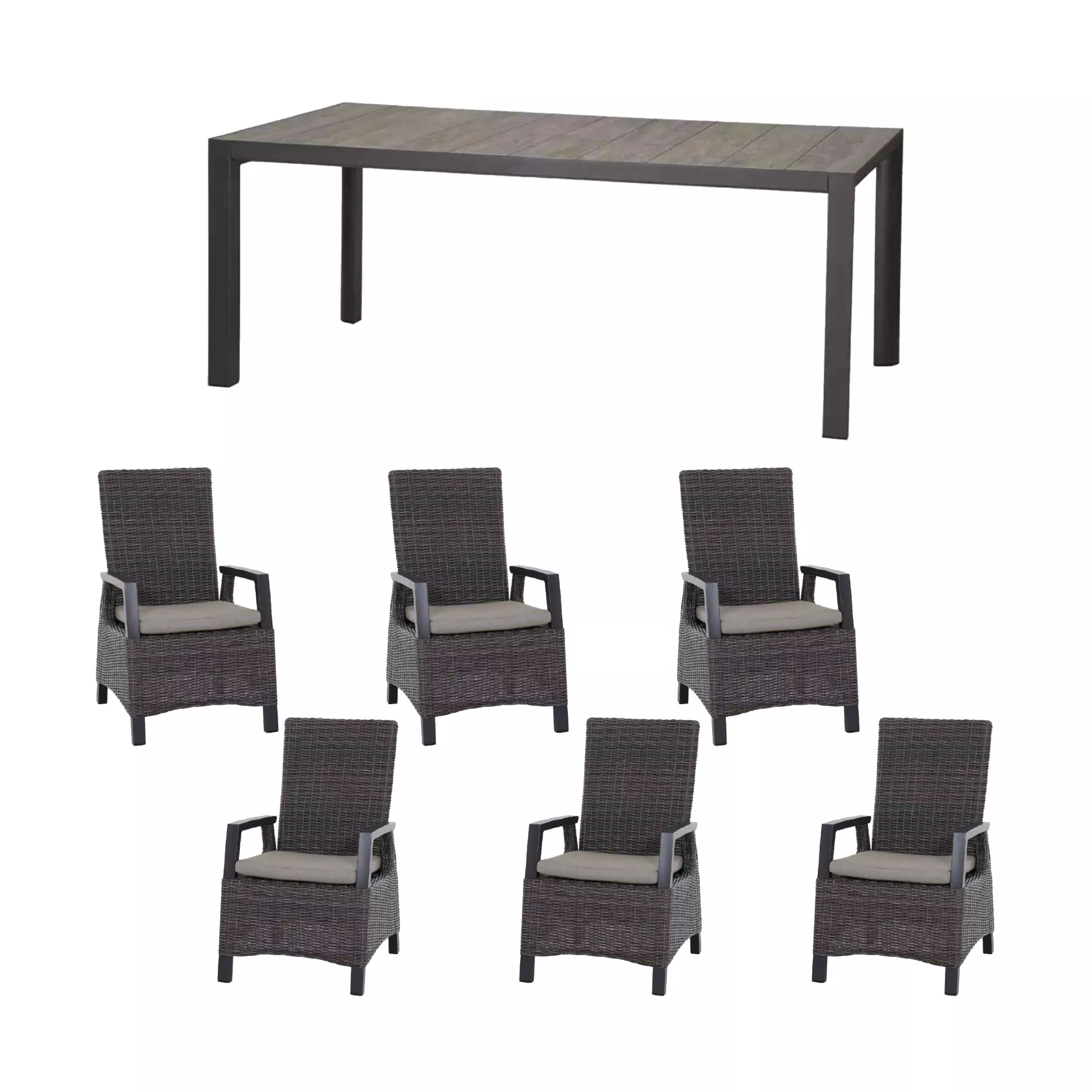 besteht aus sieben hochwertigen Möbeln jeweils mit Gestell aus robustem Aluminium mit einer Pulverbeschichtung in mattem Anthrazit. Aluminium ist leicht, aber stabil, punktet mit hoher Korrosionsbeständigkeit und mit geringem Pflegeaufwand.