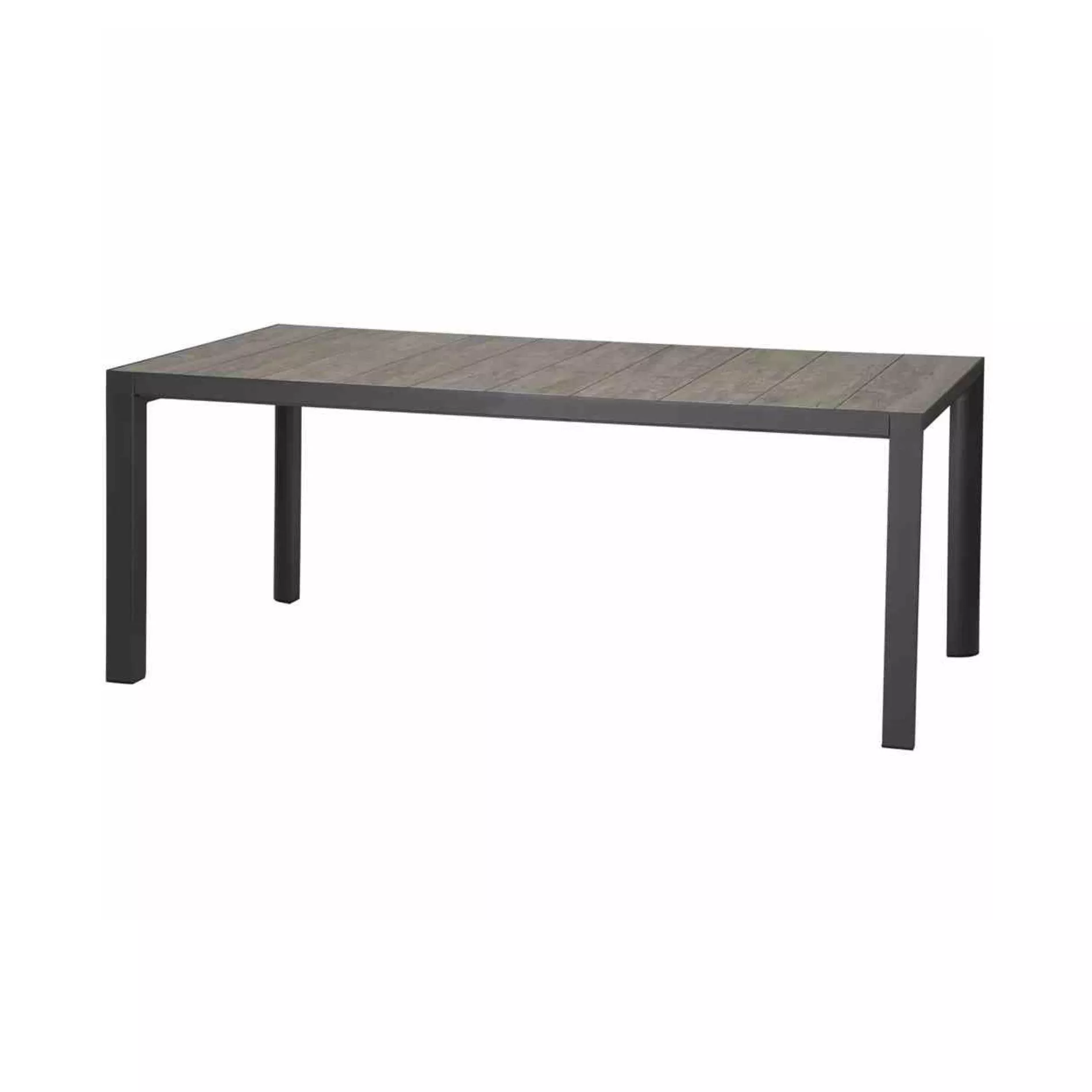 Die Tischplatte des Gartentisches ist aus Keramik. Es handelt sich um mehrere längliche Platten in der Optik von verwaschenem, natürlich gealterten Holz – ein Blickfang! Keramik ist hitze- (180°C) und kältebeständig (-20°C), hygienisch, pflegeleicht und lichtecht.