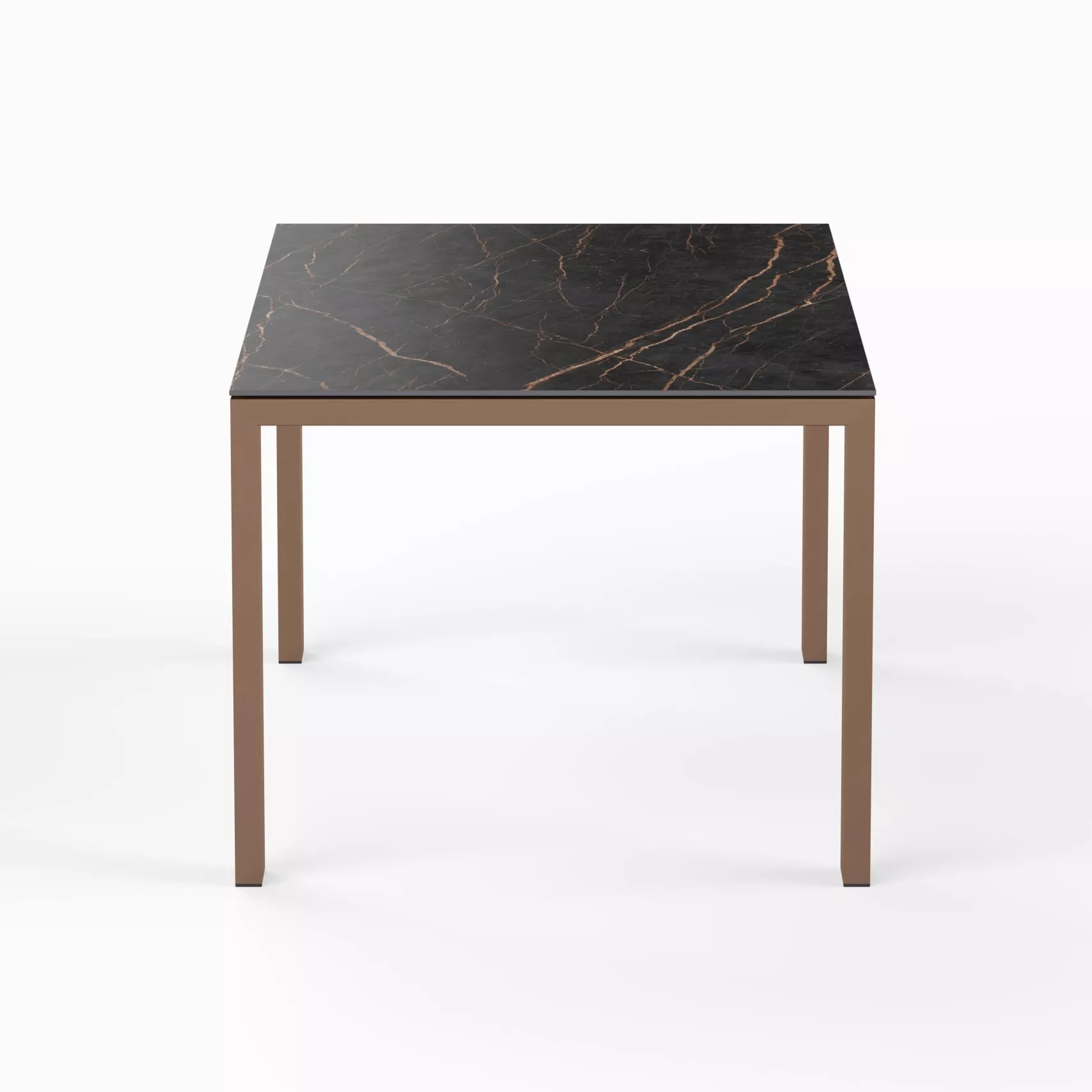 setzt beim Gestell auf bewährten Edelstahl, der sich durch hohe Stabilität auszeichnet und dem Tisch dank des höheren Gewichts einen festen Stand verleiht. Eine Besonderheit ist jedoch die verchromte Oberfläche, die nicht nur die dem Metall eigene Korrosionsbeständigkeit nochmals verbessert, sondern auch für einen edlen Glanz in Kupfer-Optik sorgt.