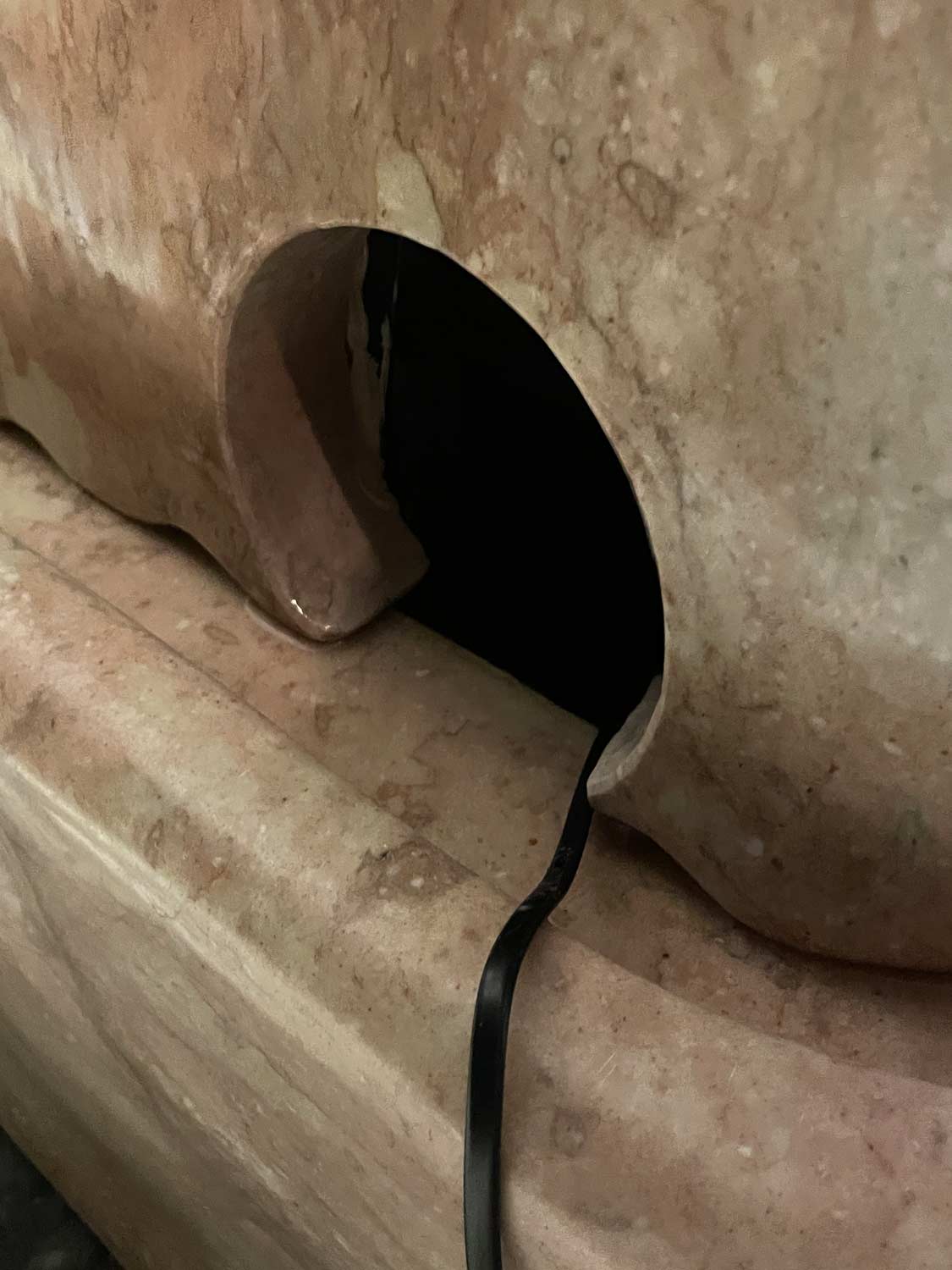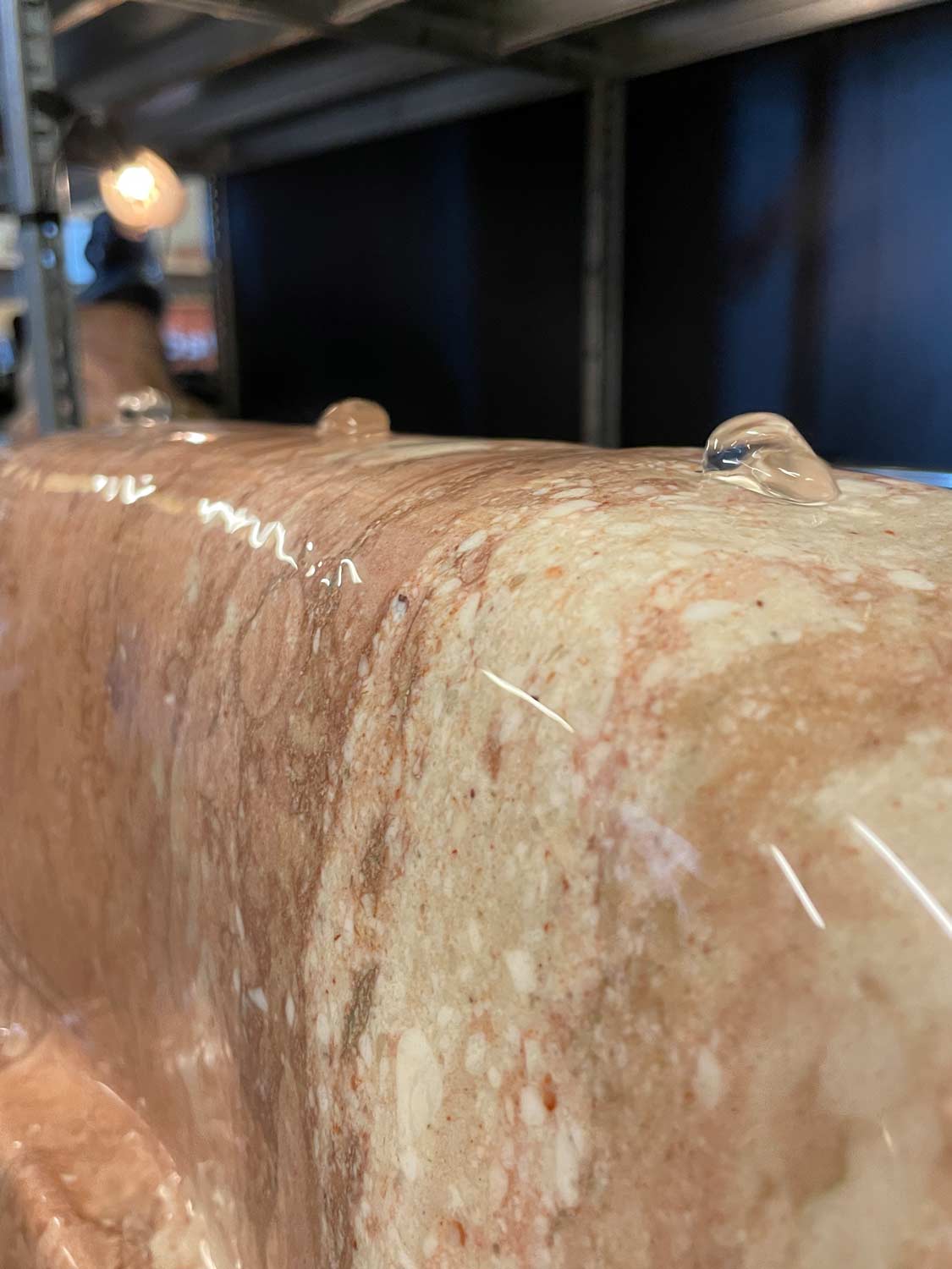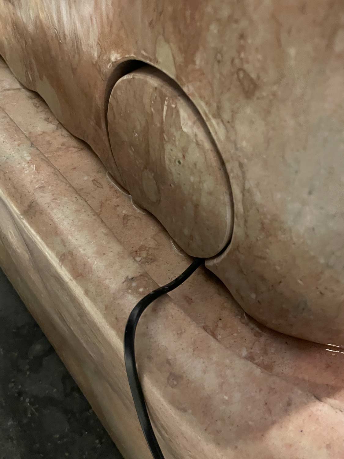 Bei diesem Objekt aus österreichischem Untersberger-Marmor wurden Quellstein und Wanne vom bekannten Bildhauer Prof. Hans Muhr in eine elegante Wasserskulptur verwandelt. Die gewölbte Form der Marmorwanne harmoniert wunderbar mit dem künstlerisch geschliffenen Quellstein.