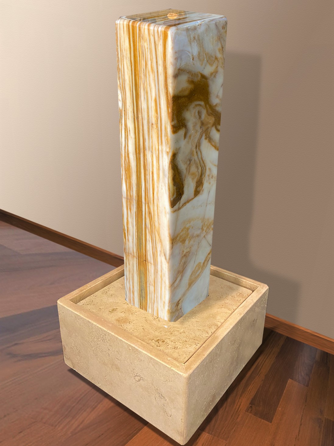 Lieferumfang: massive Marmor-Stele “Ägäis Gelb”; Wanne aus Travertin mit Deckel; regulierbare & leise Qualitäts-Pumpe & passendes PVC-Schlauchstück in ausreichender Länge