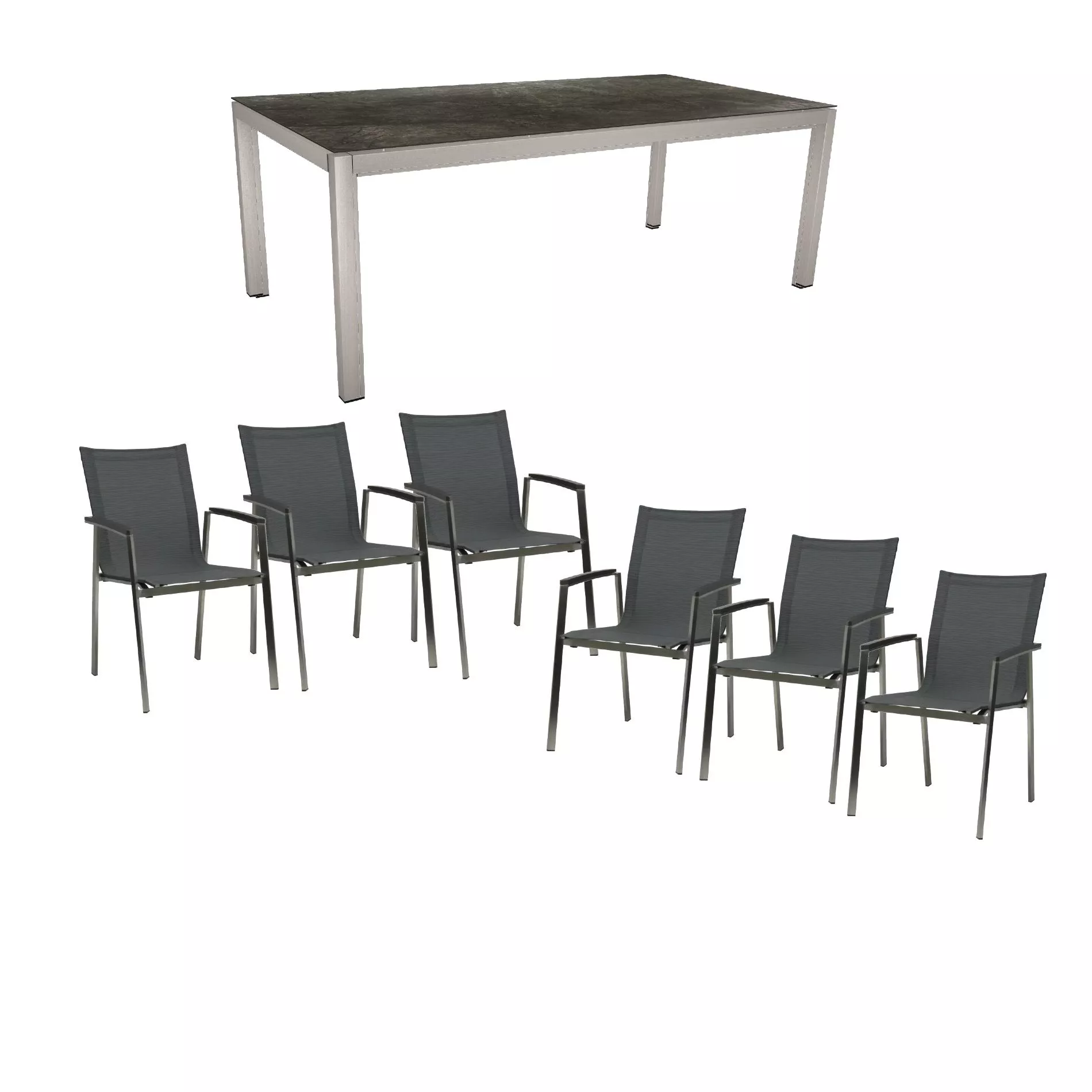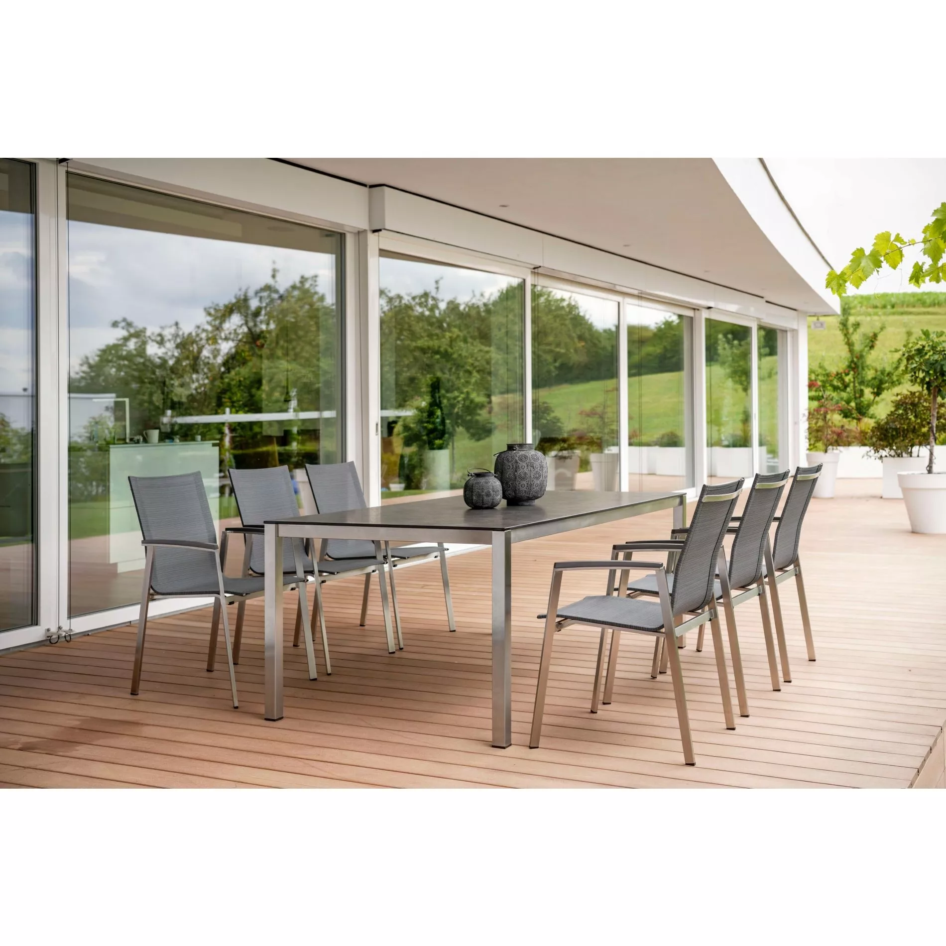 Modernes, puristisches Edelstahl-Set für sechs Personen. Mit dem 7-teiligen Gartenmöbel-Set der Marke Stern sind Sie bereit für die warme Jahreszeit. Die Gruppe besteht aus einem 200 x 100 cm großen Gartentisch aus dem beliebten “Classic” Tischsystem, dazu gesellen sich sechs “New Top” Stapelstühle mit Textilen-Bespannung. Edelstahl-Gestelle garantieren Stabilität, die HPL-Tischplatte im Dekor Dark Marble unterstreicht die moderne Optik.