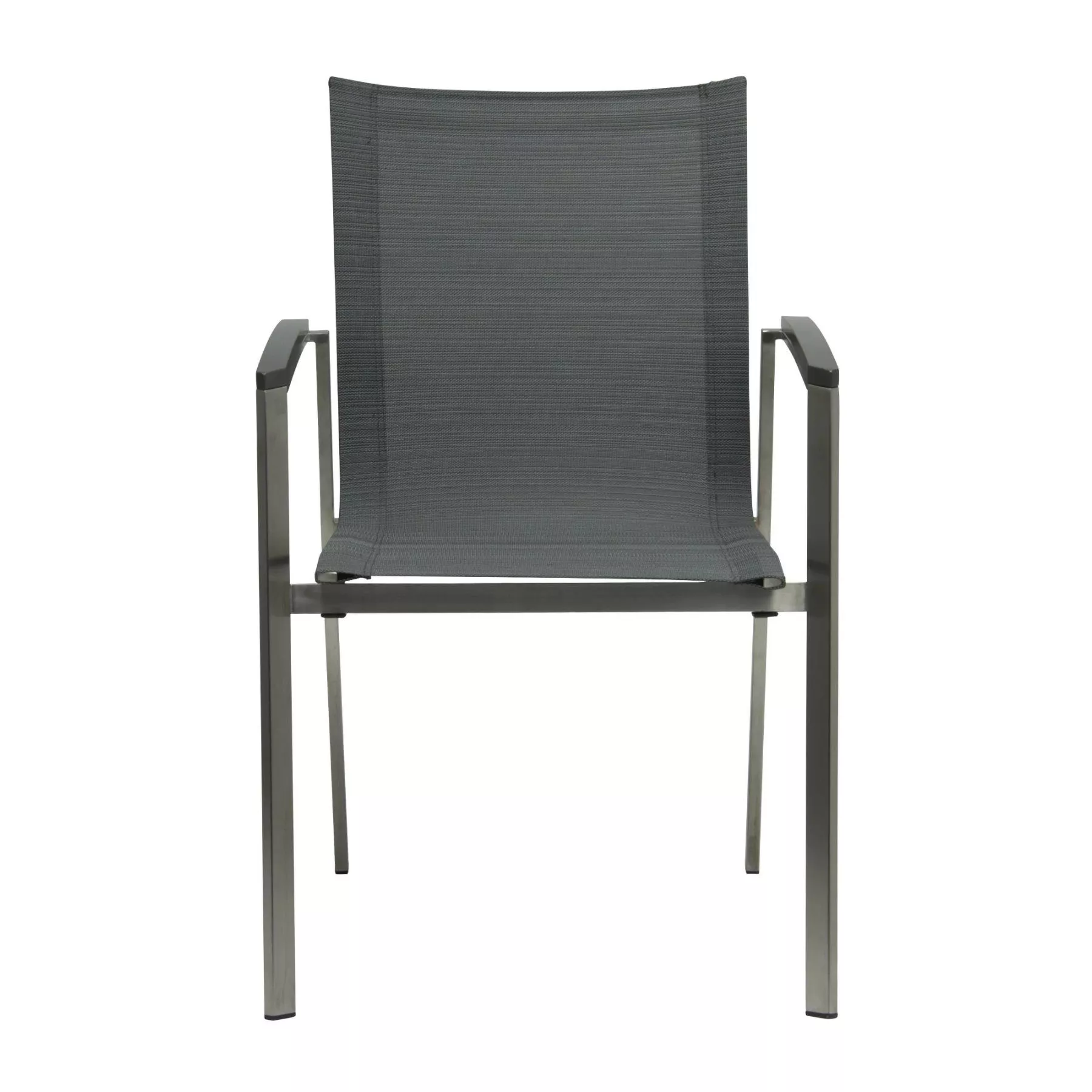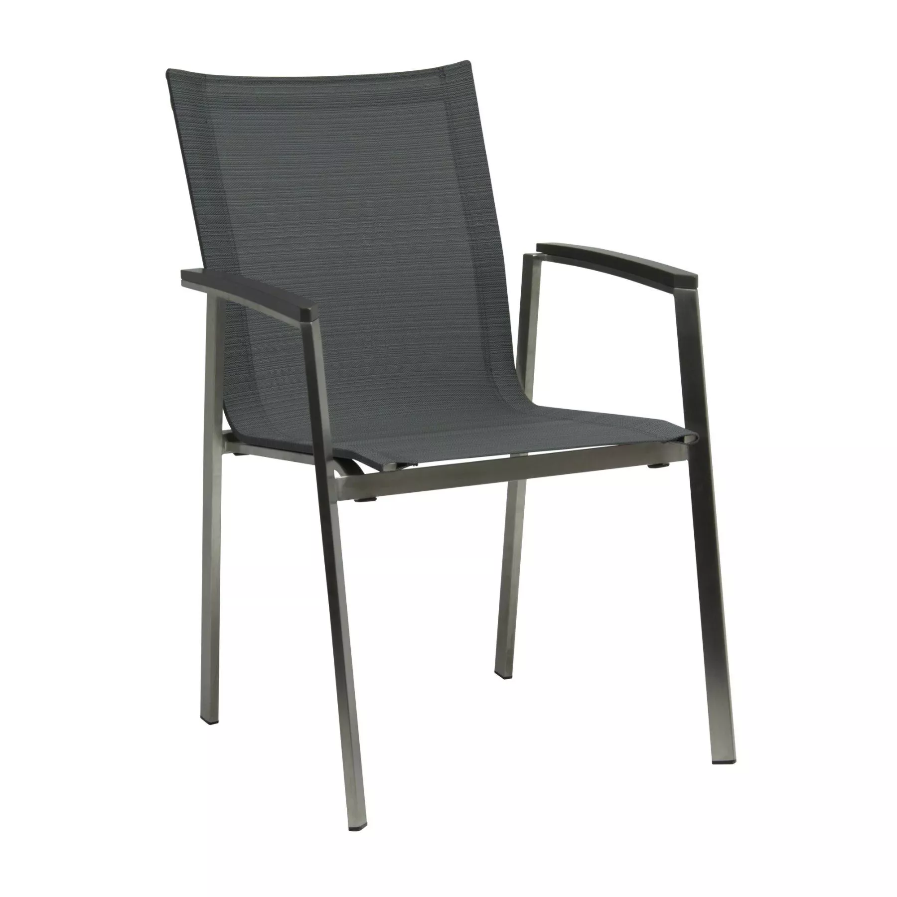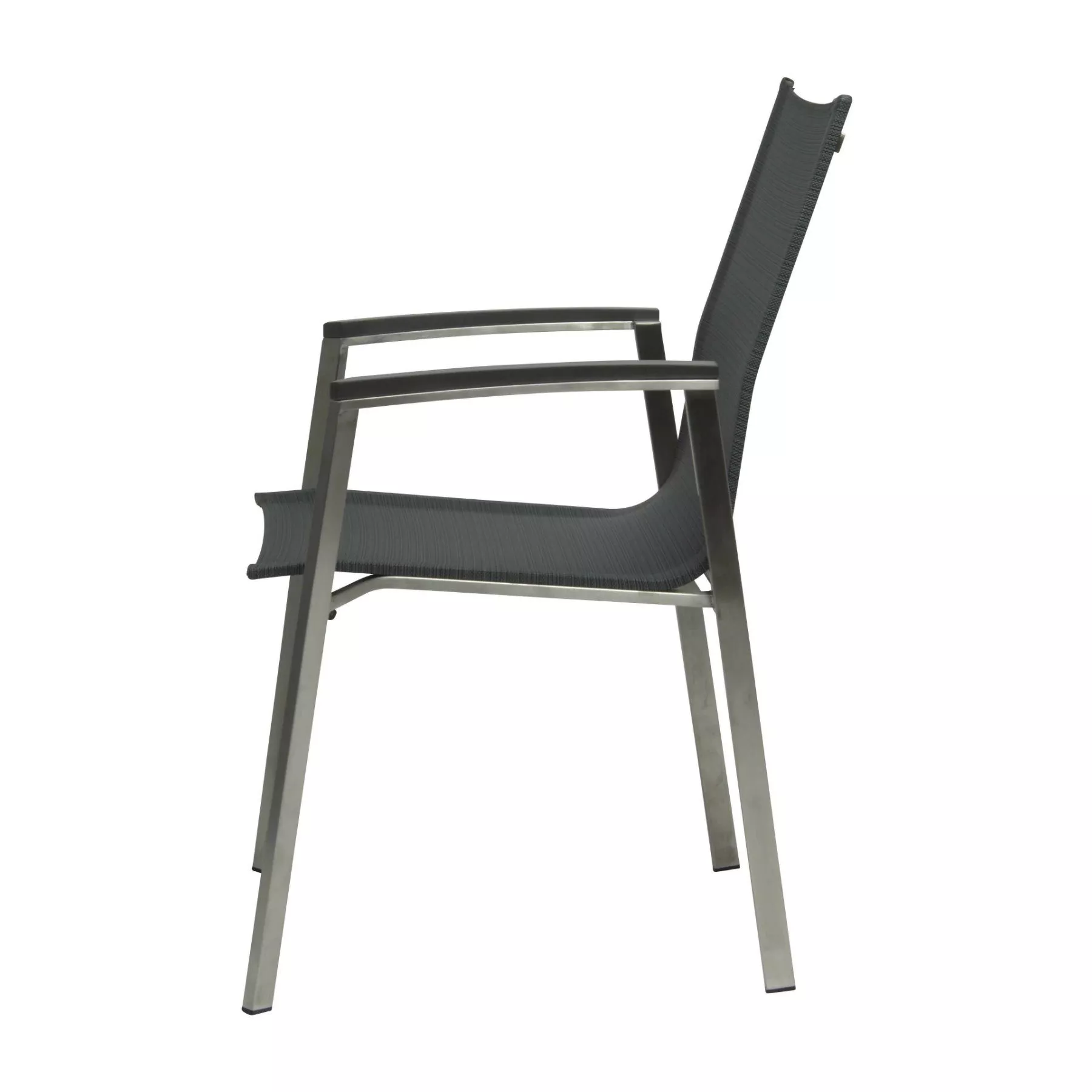 Die Sitz- und Rückenfläche des Gartenstuhls ist aus einem Textilgewebe (Textilene) in der Farbe Karbon gefertigt, das durch seine Strapazierfähigkeit sowie UV-Beständigkeit und Formstabilität perfekt für den Außenbereich geeignet ist. Die Armlehnen sind aus Aluminium in der Farbe Anthrazit. Der hervorragende Sitzkomfort macht diesen Stuhl schnell zum Liebling auf Ihrer Terrasse. Beim Verstauen beansprucht er nur wenig Platz, da sich bis zu sechs Stühle platzsparend stapeln lassen.