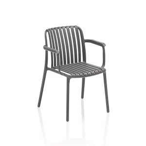 verfügt über ein hochwertiges Gestell aus Edelstahl und Armlehnen aus anthrazitfarbenem Aluminium. Die Sitz- und Rückenfläche des Sessels ist aus einem hochwertigen Textilgewebe gefertigt, das durch seine Strapazierfähigkeit sowie UV-Beständigkeit und Formstabilität perfekt für den Außenbereich geeignet ist. Beim Verstauen beansprucht er nur wenig Platz, da er sich platzsparend stapeln lässt.