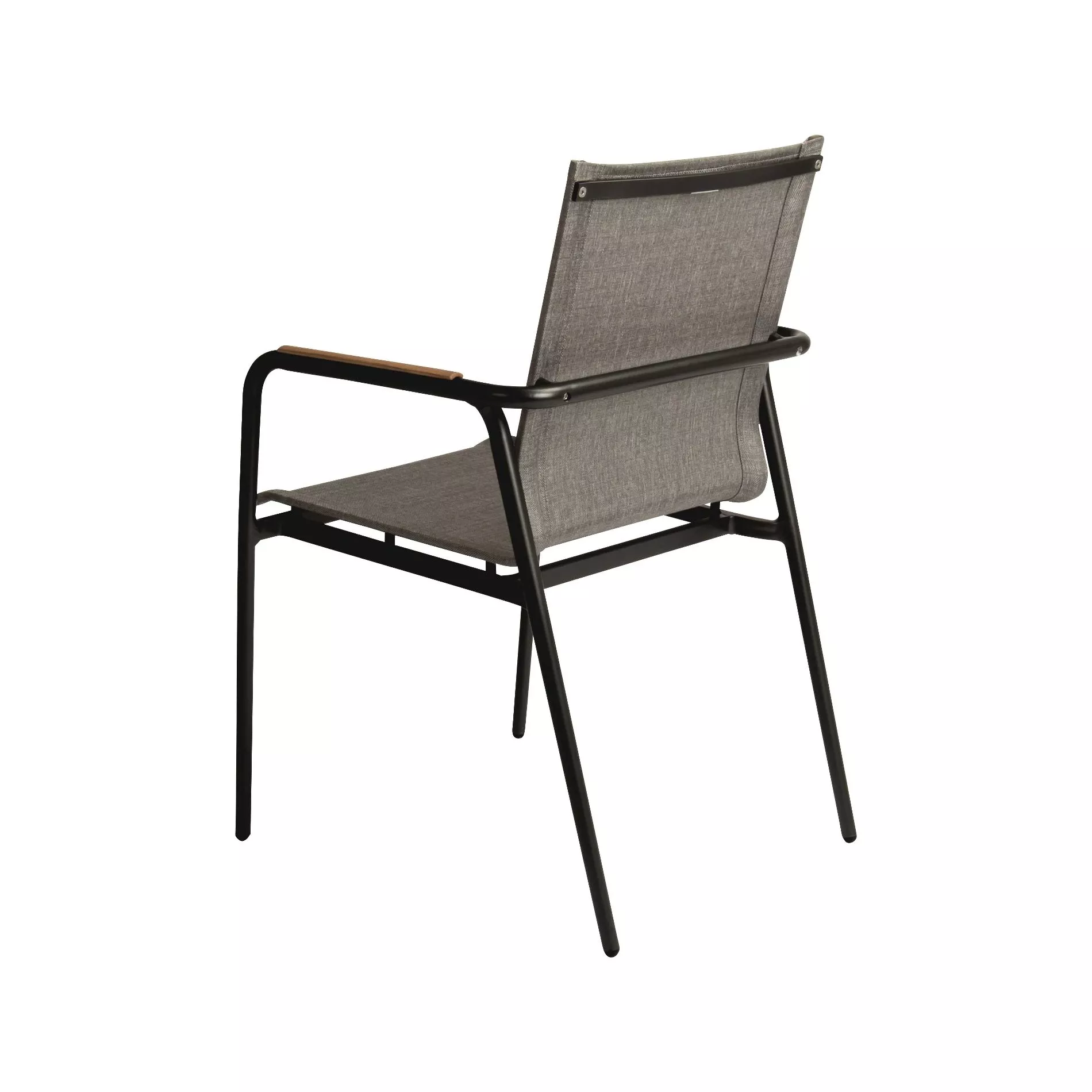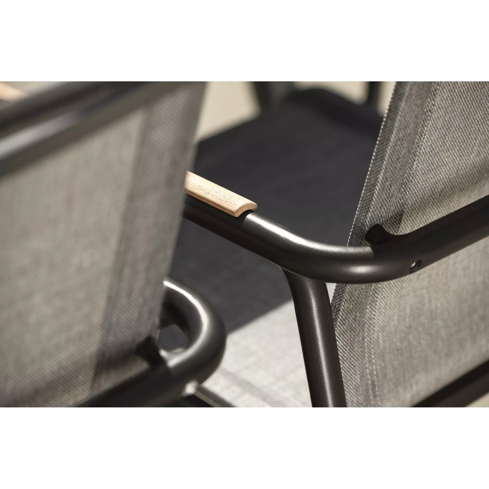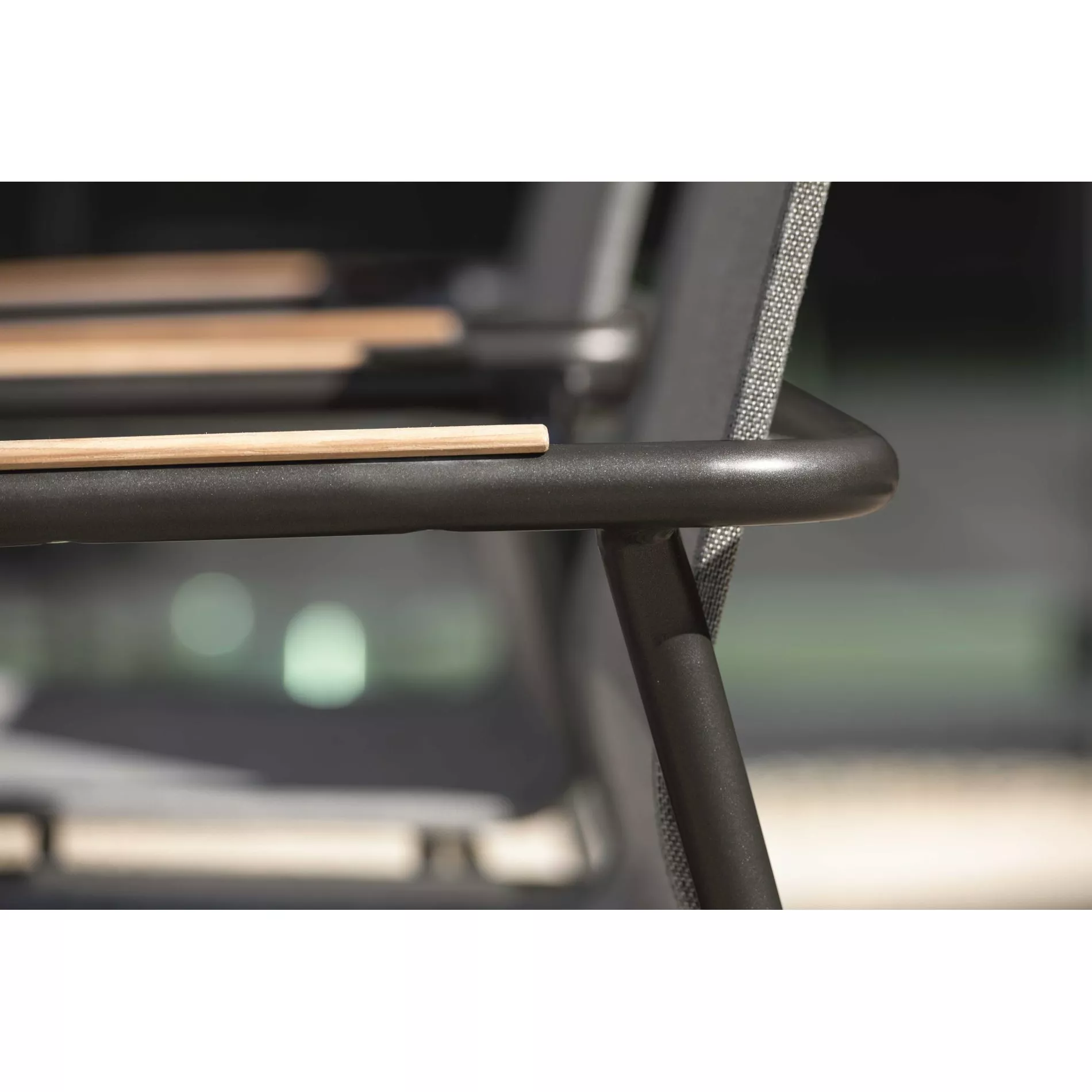 Die Armlehnen werden durch eine minimalistische Teakholz-Auflage akzentuiert. Teak ist ein echter Handschmeichler und dank des hohen Ölgehalts sehr widerstandsfähig gegenüber Witterungseinflüssen. Um dem natürlichen Vergrauen des Holzes vorzubeugen, empfehlen wir ein Teakpflegemittel.