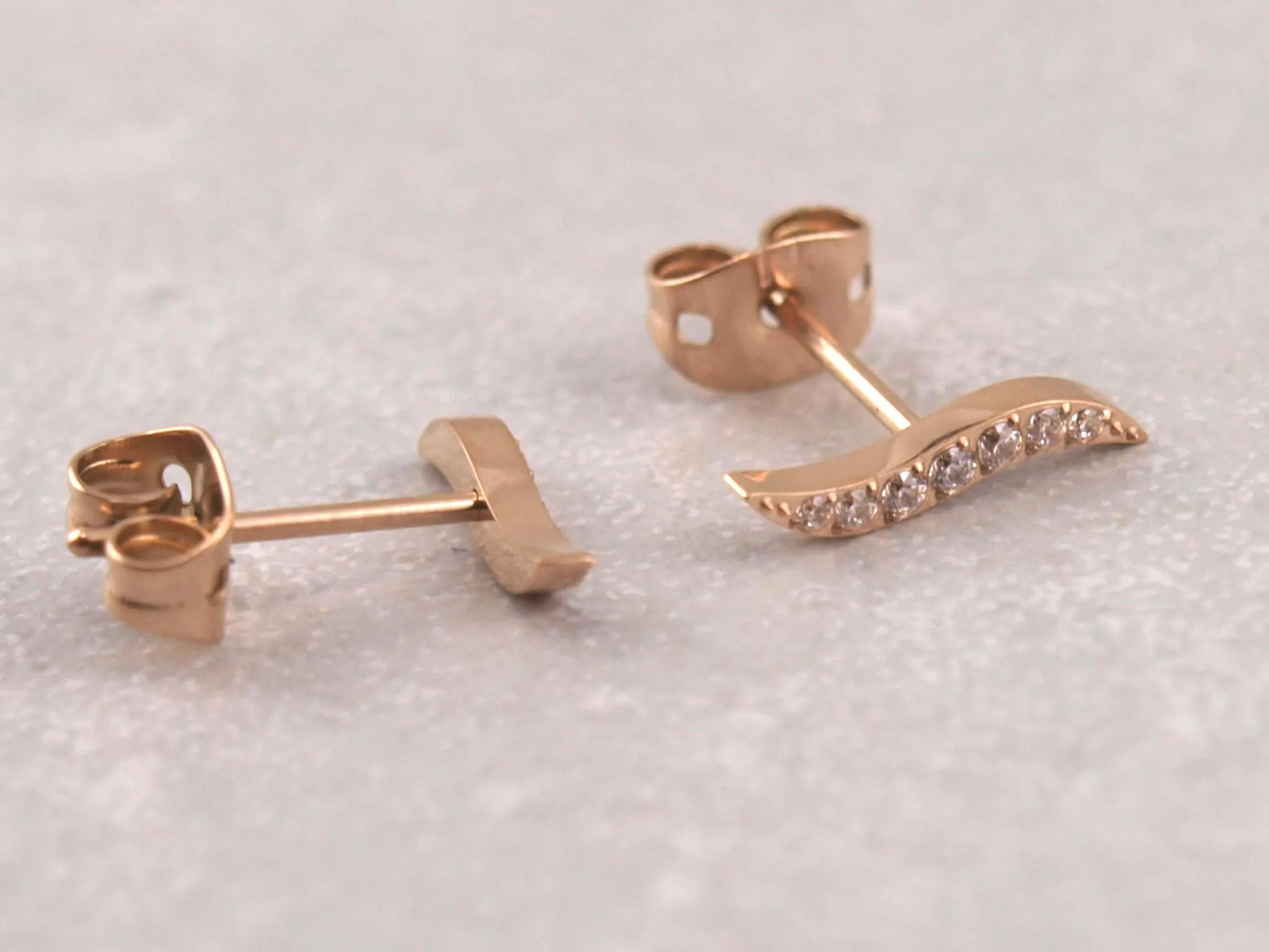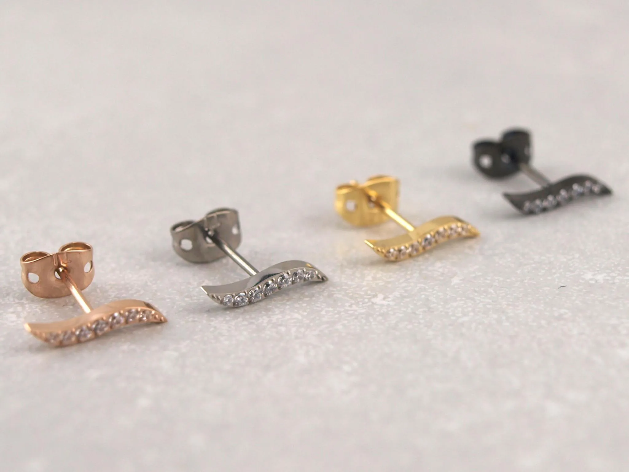 Diese wunderschönen Ohrstecker aus Titan mit Wellen-Motiv sind in vier verschiedenen Farben erhältlich: Silber, Gold, Roségold und Schwarz. Sie eignen sich wunderbar als täglicher Ohrschmuck und sind aufgrund ihres Materials auch für Allergiker sehr gut verträglich. Nickelfrei!