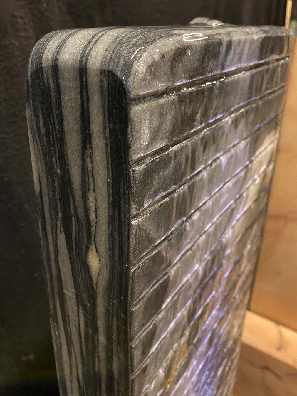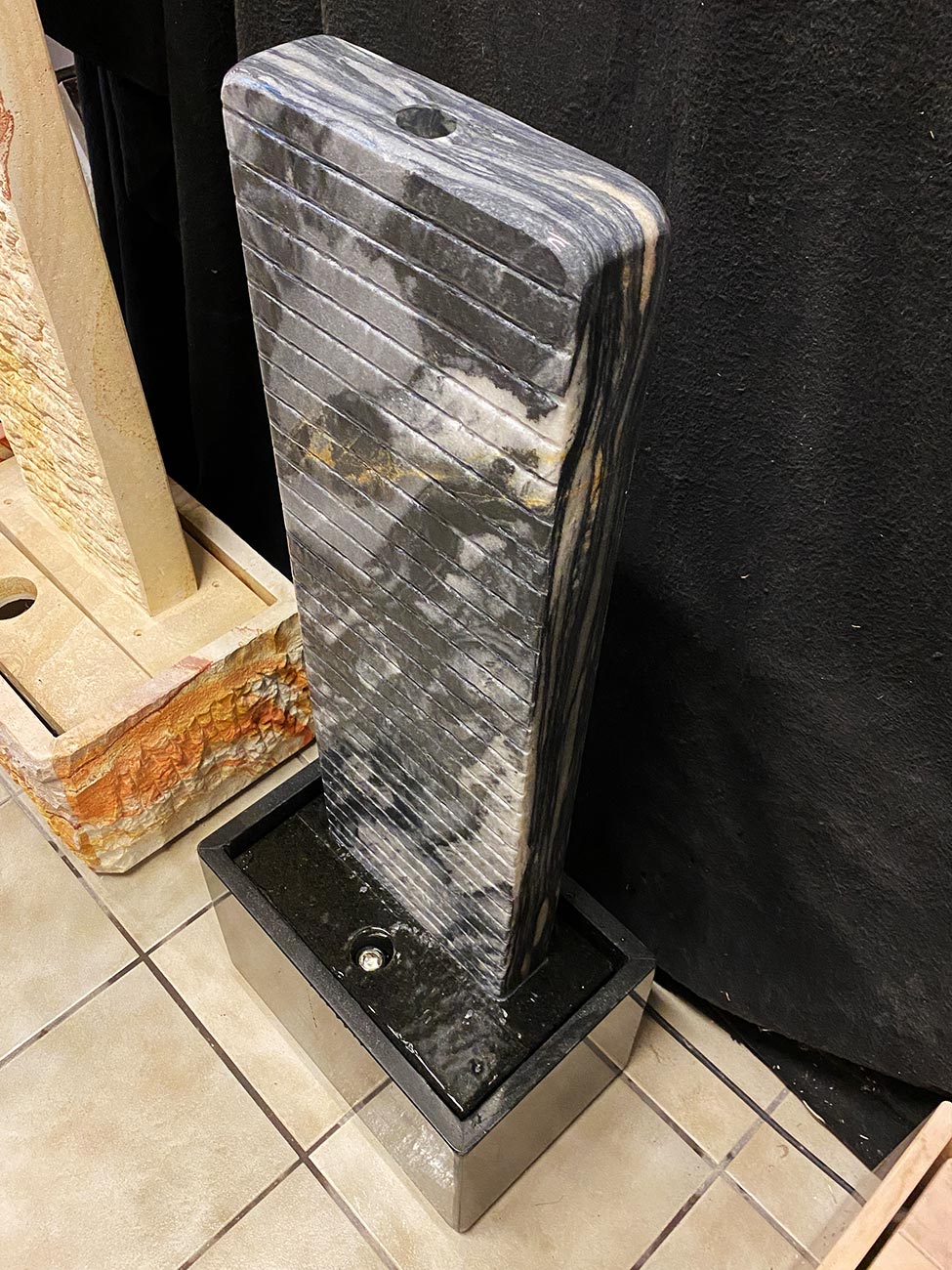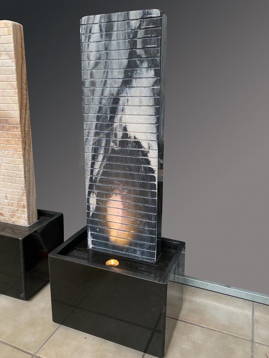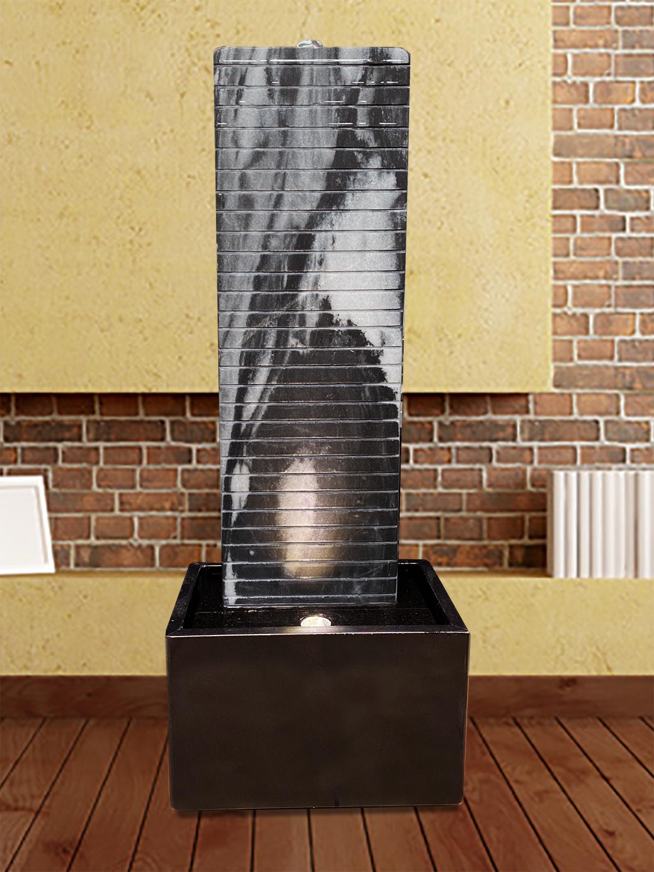 Der Brunnen besteht aus zwei Teilen: der Wasserwand, über die das Wasser sanft hinunter rinnt, sowie der Wanne aus schwarzen Granit, die als Wasserreservoir dient. In der Granitwanne befinden sich die Qualitätspumpe und der leicht zugängliche Unterwasserscheinwerfer. Um die Wasserwand vor Kippen zu schützen, wird sie mit zwei Edelstahlschrauben mit der Unterkonstruktion verschraubt.