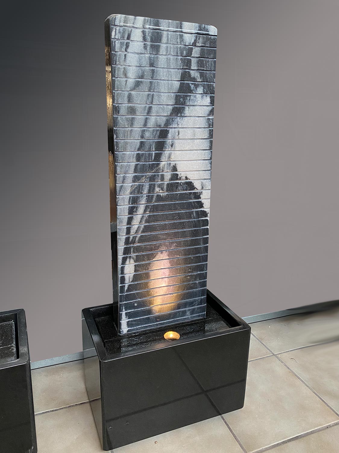 Dieser Brunnen aus schwarz-weißem Marmor ist ein hübsches Dekorationsstück und ein effektiver Luftbefeuchter für mittelgroße Räume. Er fügt sich perfekt in jede Wohnlandschaft ein. Während der Sommermonate können Sie dieses Modell sogar auf Ihrer Terrasse aufstellen. Durch die gleichmäßigen Rillen im Oberteil wird das herunterfließende Wasser effektvoll in Bewegung gebracht. Der LED-Unterwasserscheinwerfer zaubert wunderbare optische Effekte.