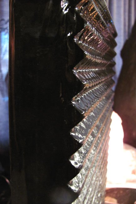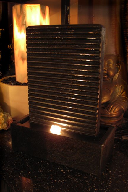 Die waschbrettartige Vorderfront wurde aus geklebten dreieckigen Steinprofilen hergestellt. in Kombination zu der Beleuchtung die von unten aus der Wanne kommt, ergibt sich ein sehr schönes, bewegtes Wasserbild.
